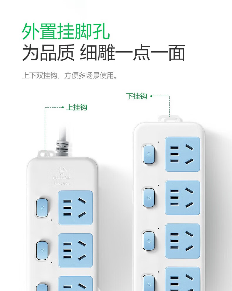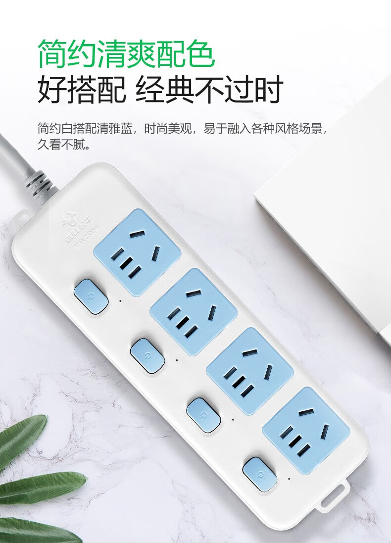 Bull (BULL) sub-control strip, household cord drag strip, independent switch socket plug-in strip, multi-hole multi-functional wiring board, multi-purpose electric plug strip, power extension cord, computer plug-in strip, full length 1 meter, 3-position five-hole sub-control strip, official authentic 2500W fire-proof and flame-retardant model, 3-year warranty