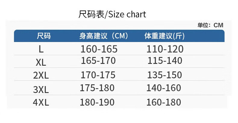China (cm) 165 / 88-90 170 / 96-98 175 / 108-110 180 / 118-122 185 / 126-130