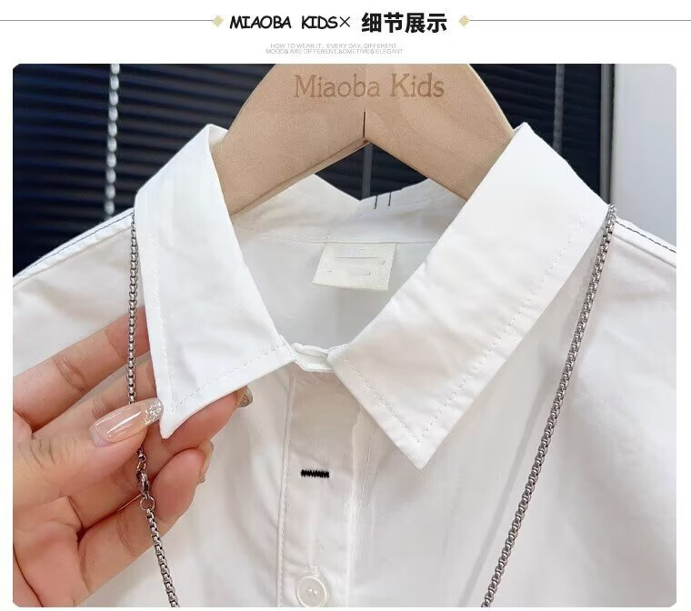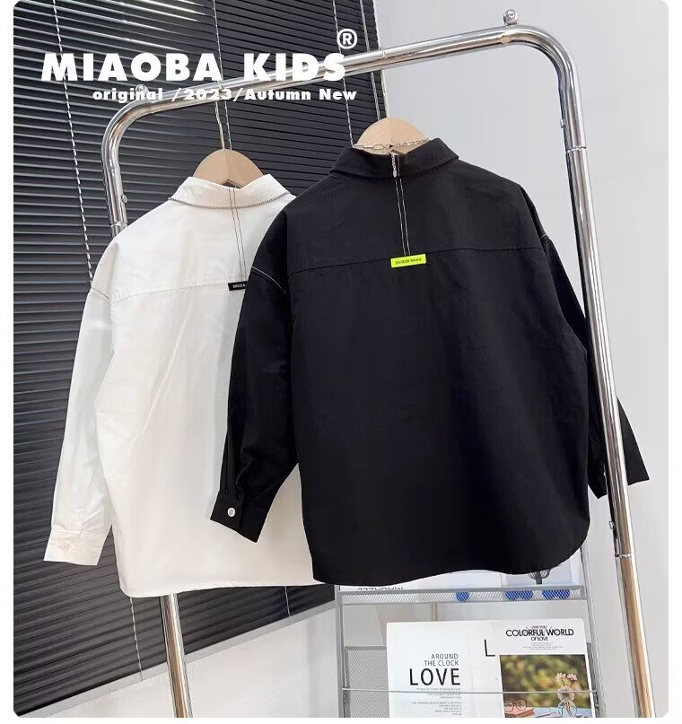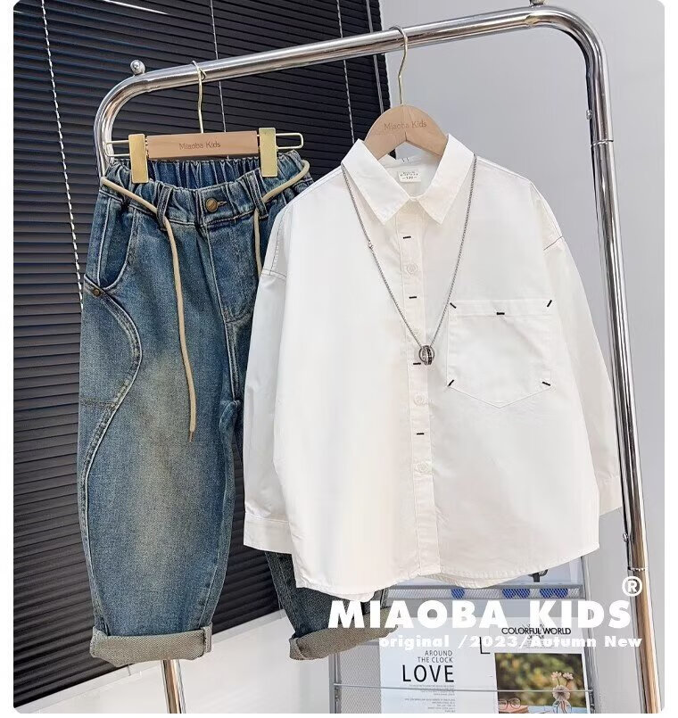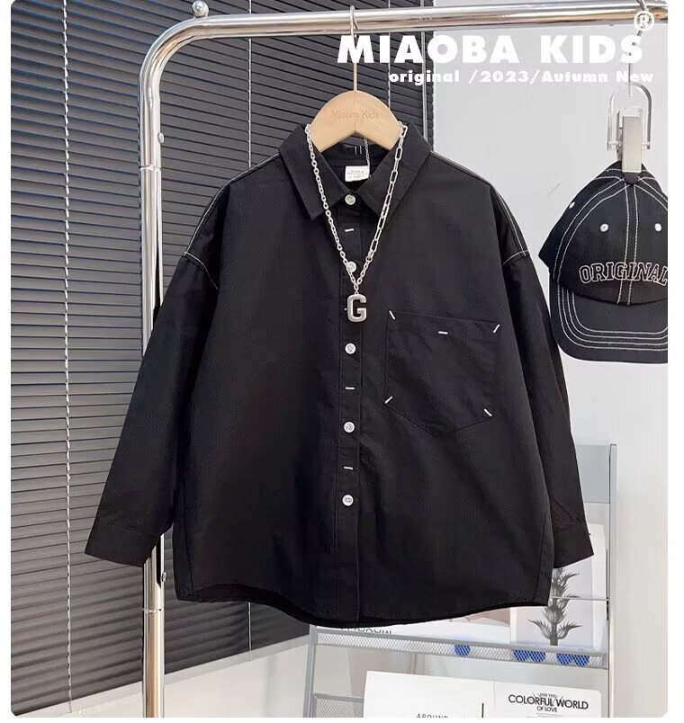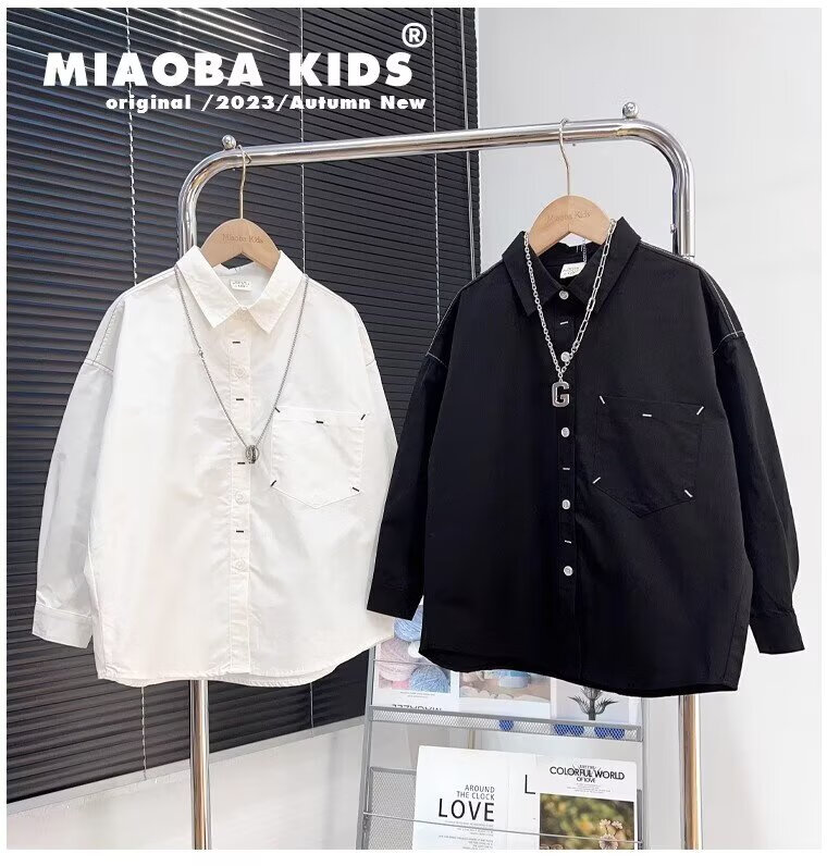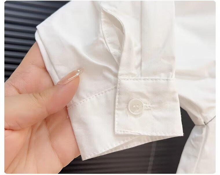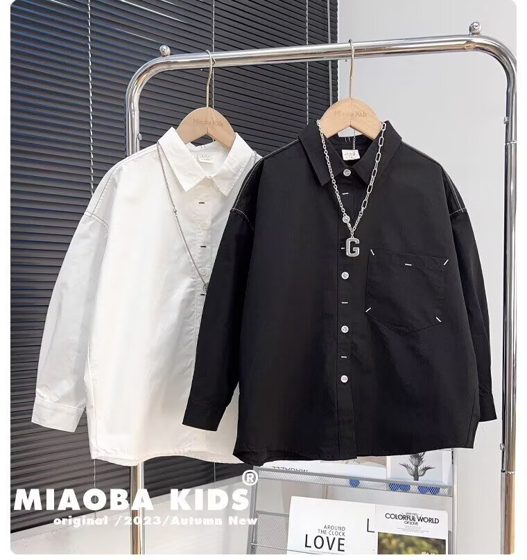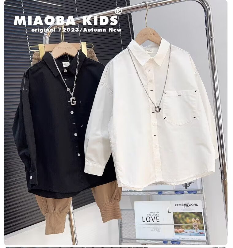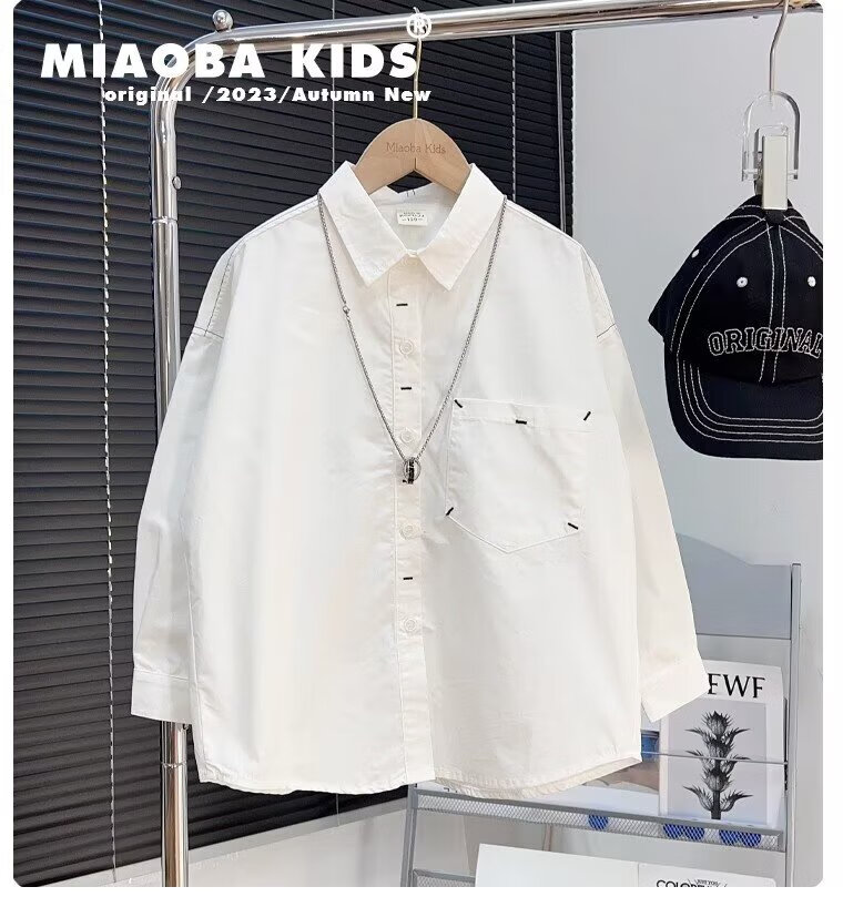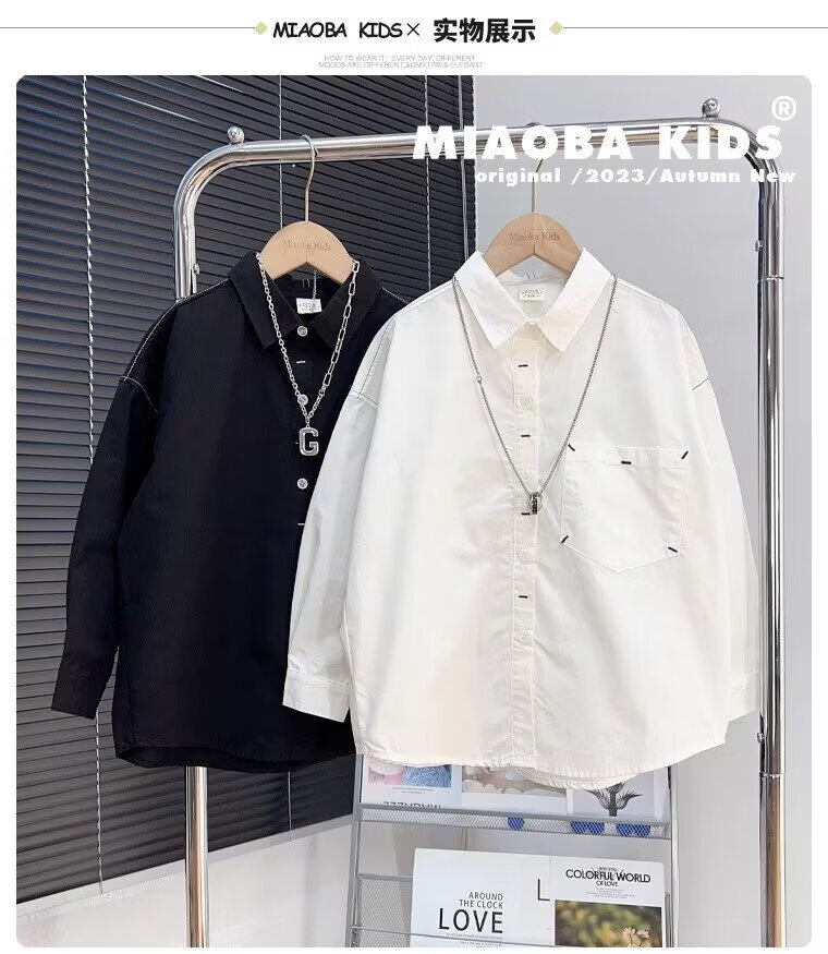 Cool and handsome loose white shirt for boys 2025 new spring and autumn medium and large children black long-sleeved casual lapel top white 140
