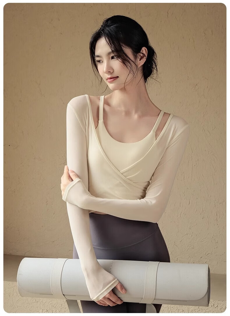 Zailu yoga clothing suit for women in spring and summer with padded sports top, slimming blouse, Pilates training, fitness long sleeves, milky white blouse + milky white bra, S70-90Jin Jin is equal to 0.5kg