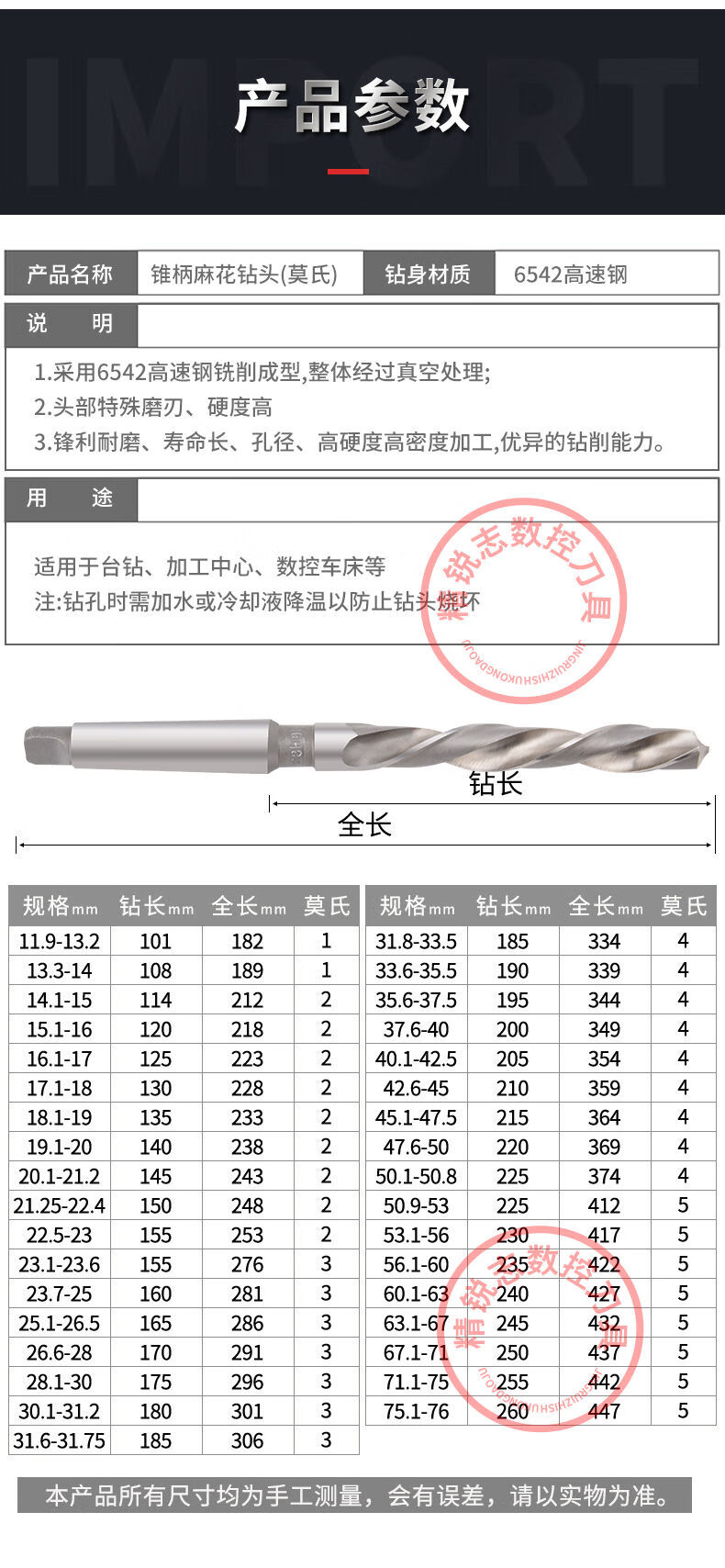 Morse taper shank drill bit taper shank twist drill 8-100 high speed steel twist drill drilling drill reaming drill 78mm