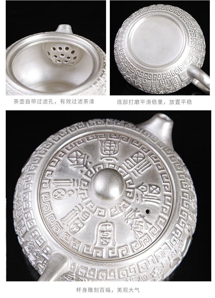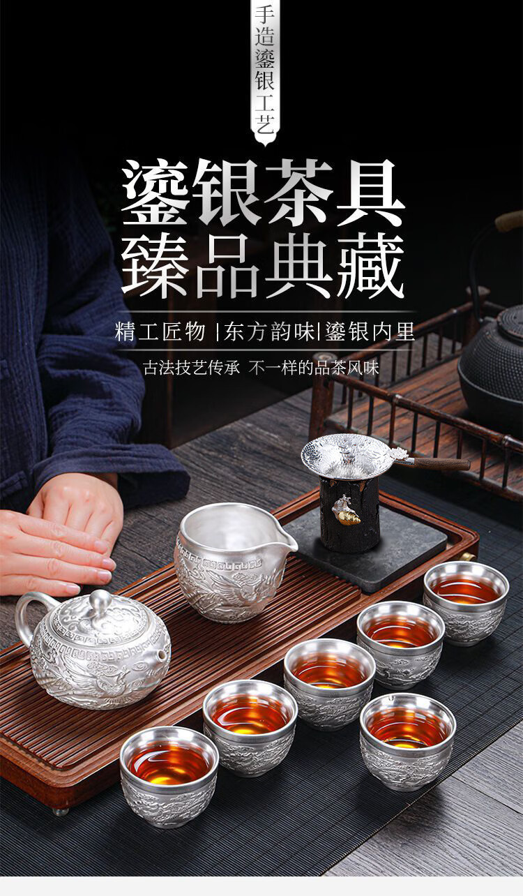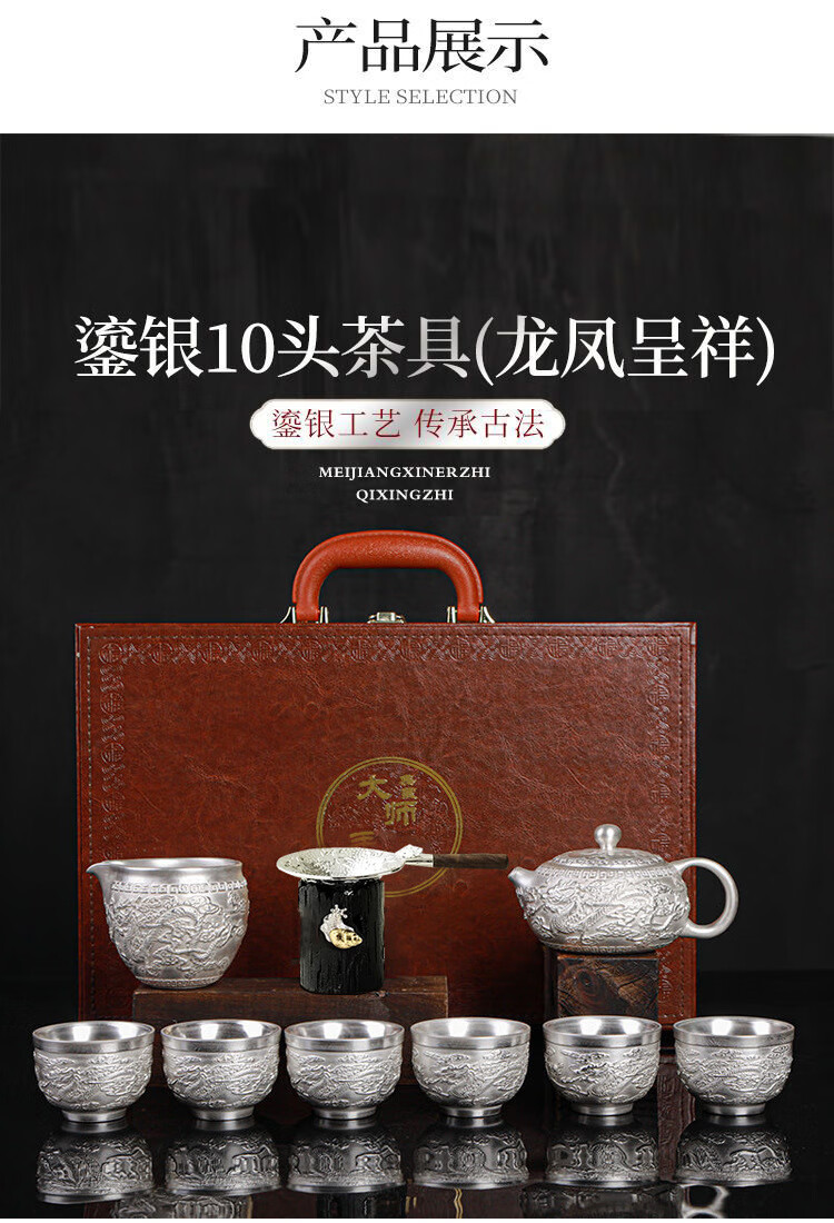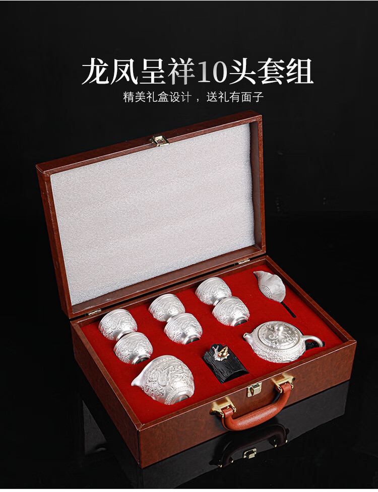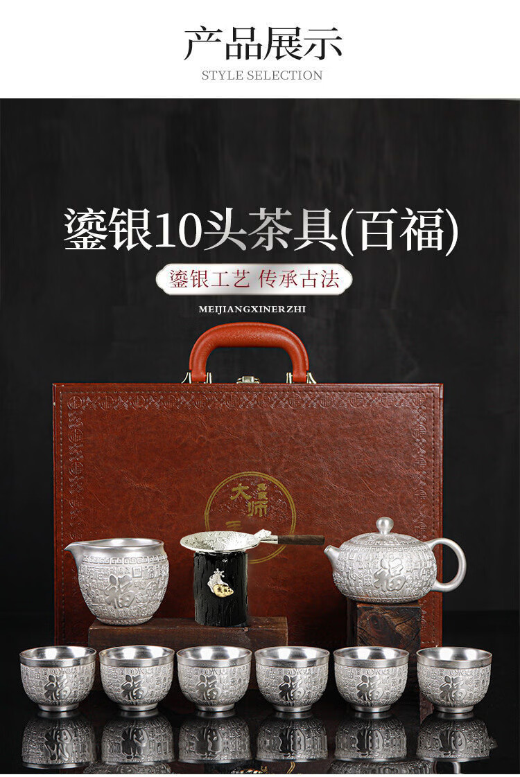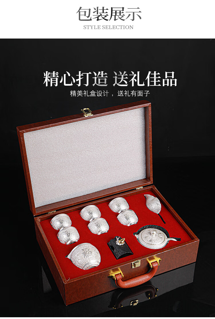 Jiaomingtang 999 sterling silver Kung Fu tea set gift set for leaders and elders to retire, housewarming and retirement practical festival Baifu silver set 10 pieces