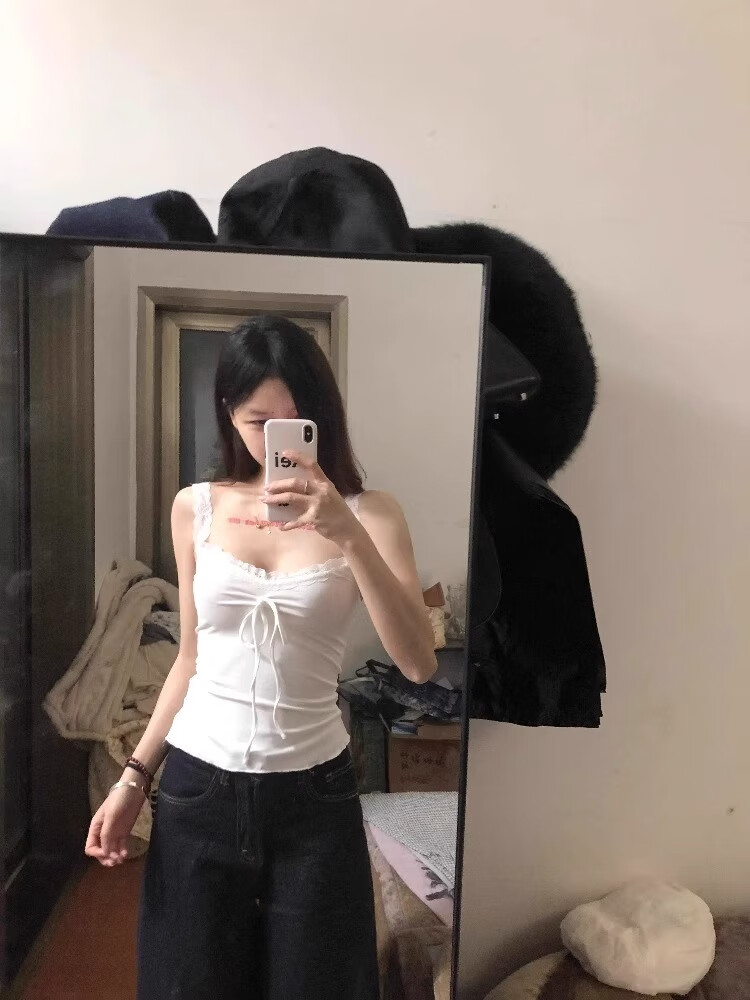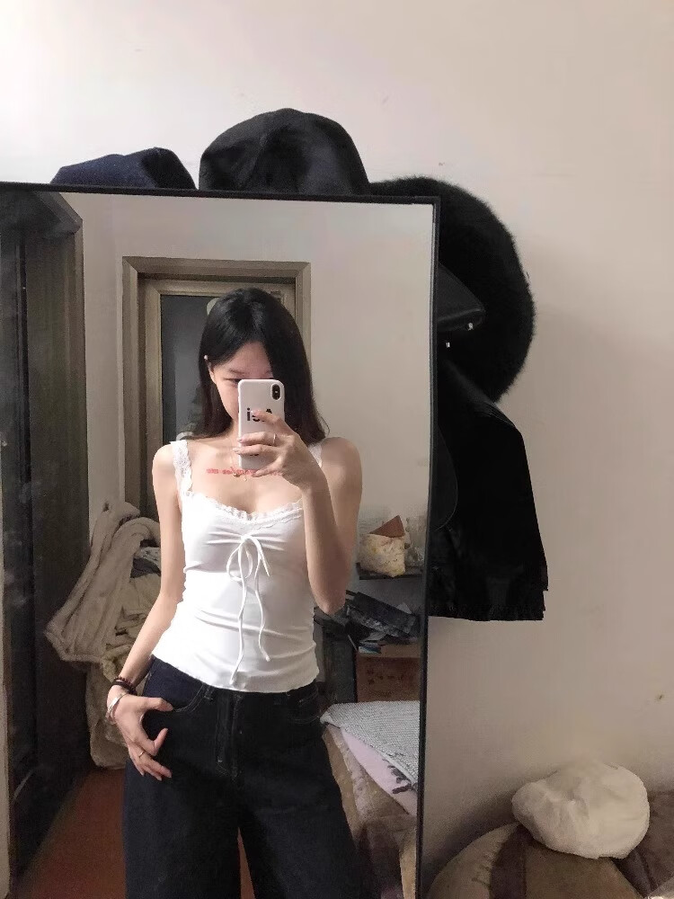 White camisole women's summer bow lace inner bottoming short sweet hot girl outer top white S recommended 75-95Jin Jin equals 0.5 kg