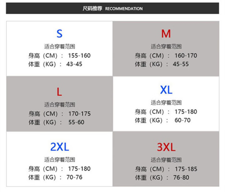 China (cm) 165 / 88-90 170 / 96-98 175 / 108-110 180 / 118-122 185 / 126-130