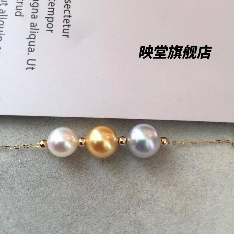 Yu Guojue's round aurora gold three-color smile chain adjustable Akoya South Sea gold beads true multi-hemp seawater pearl necklace gold, silver and blue