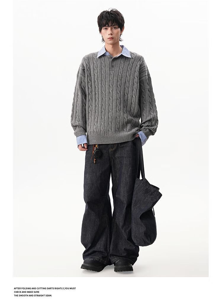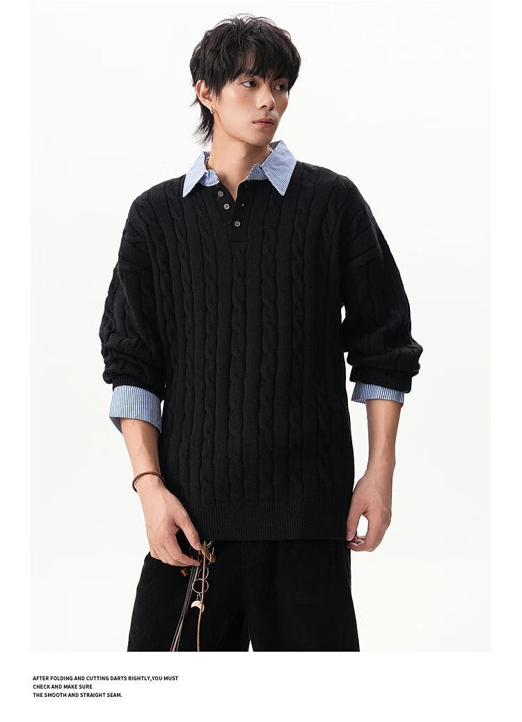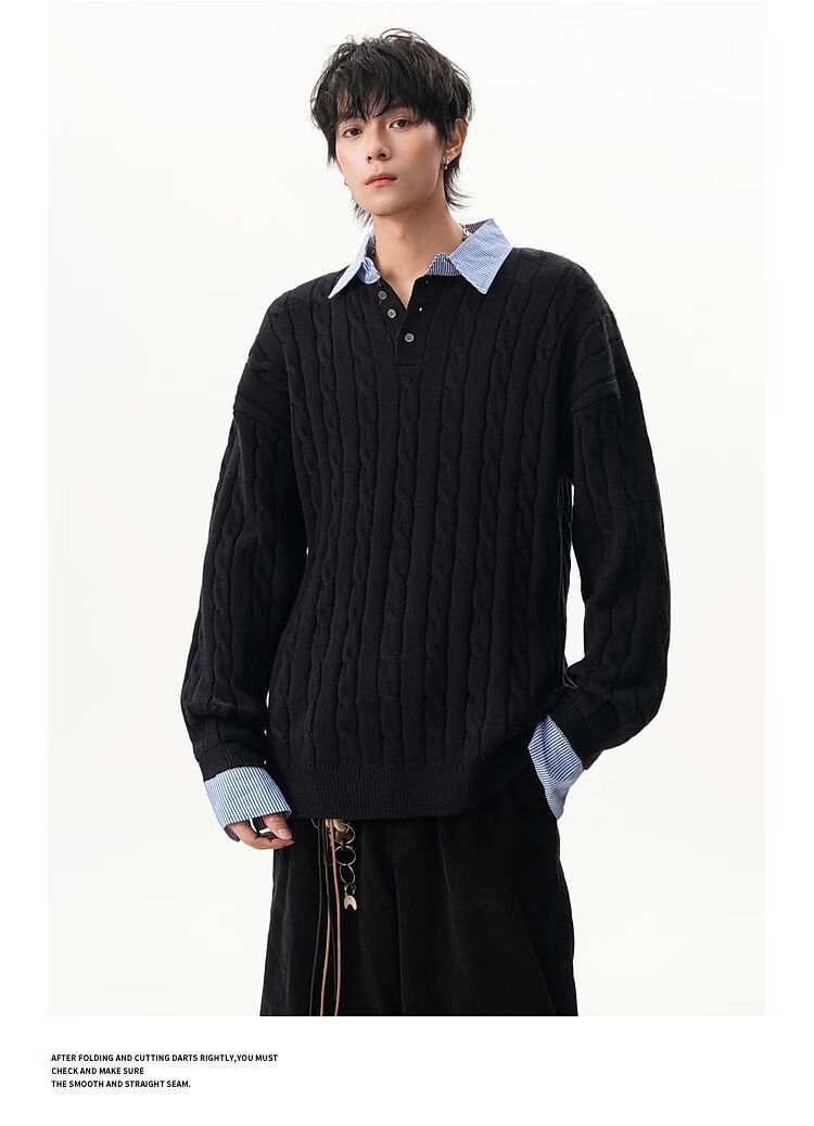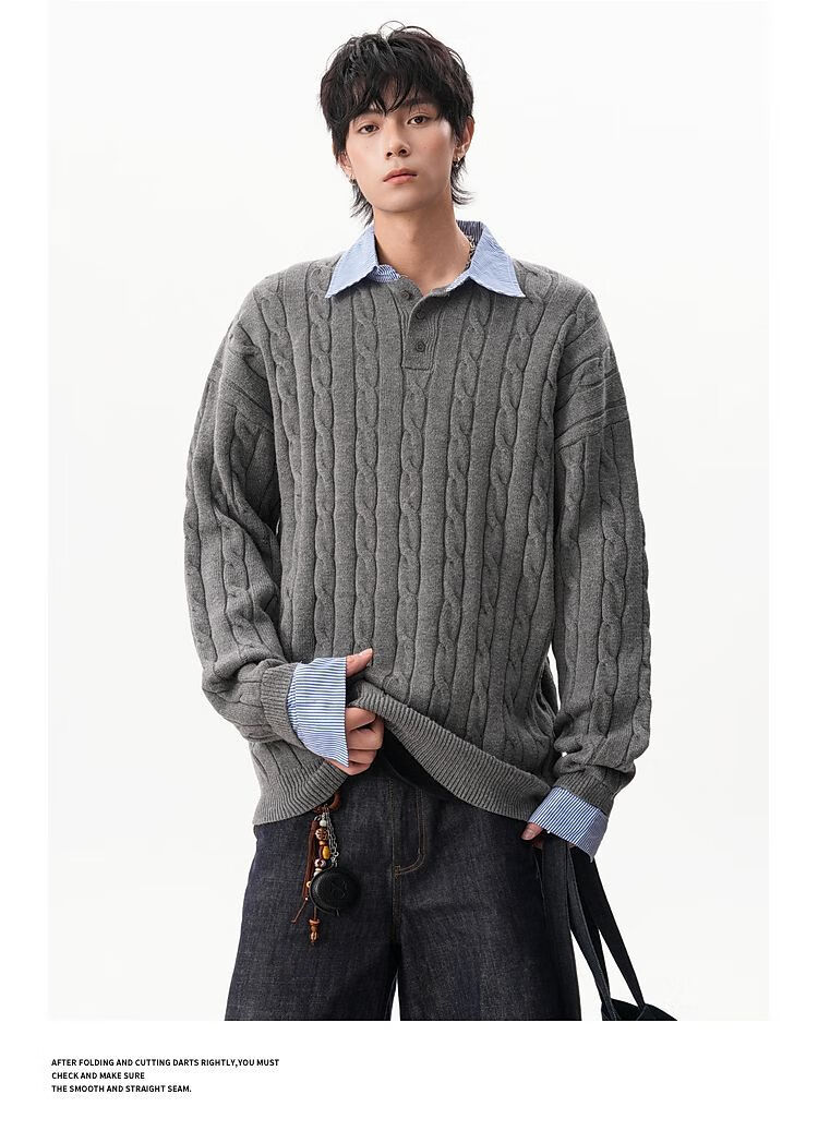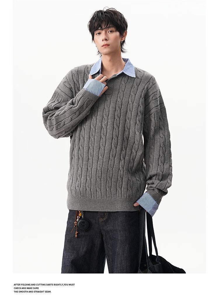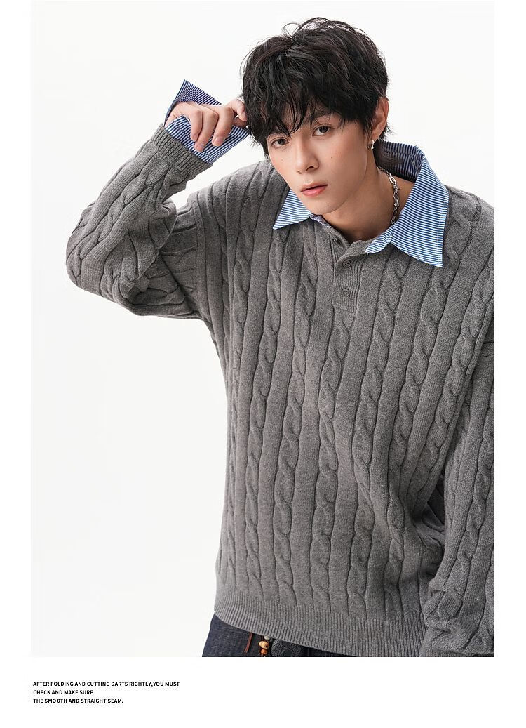 JASONWOOD American retro old money style sweater men's autumn and winter Henry collar POLO shirt fake two-piece sweater Gray M 160-165CM 90-105Jin Jin equals 0.5 kg