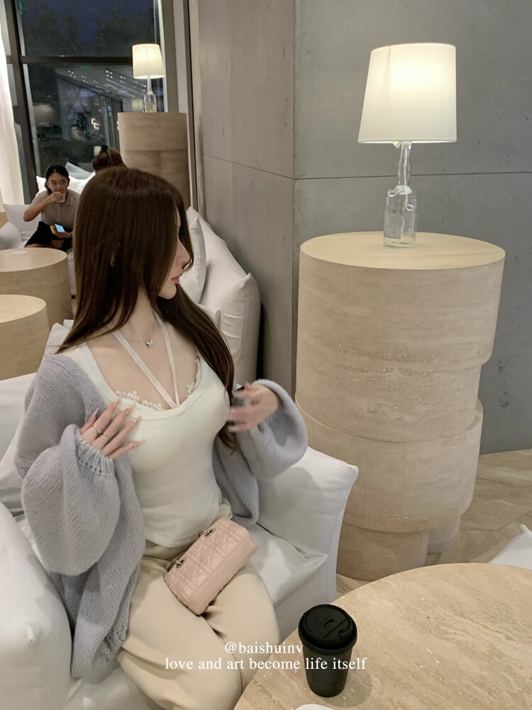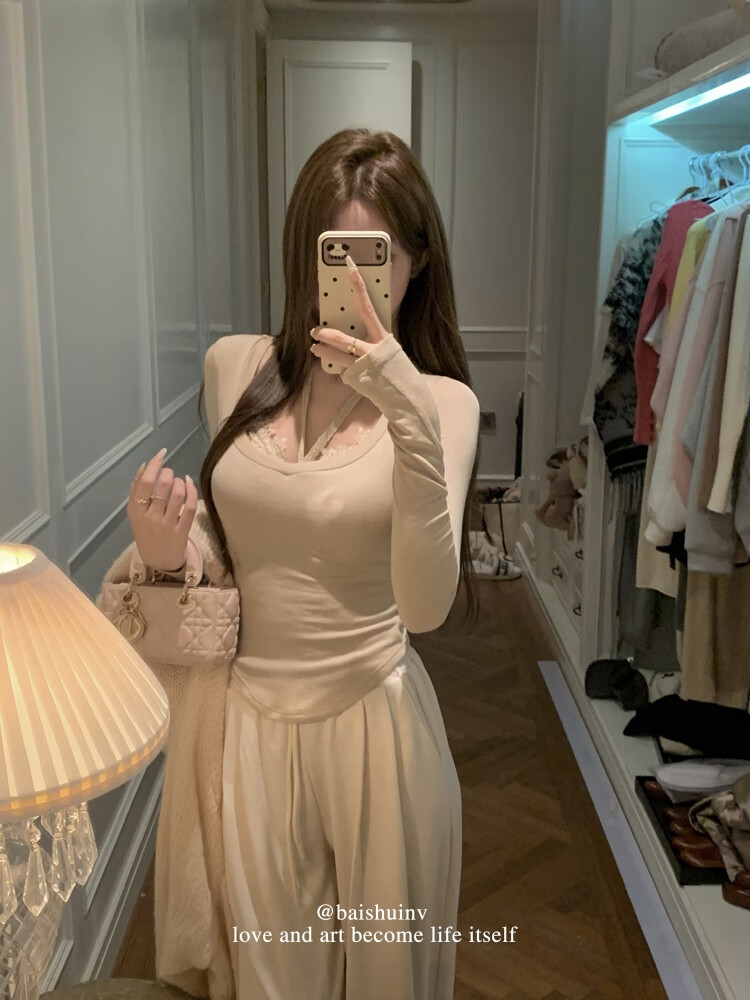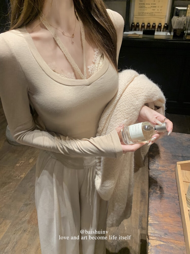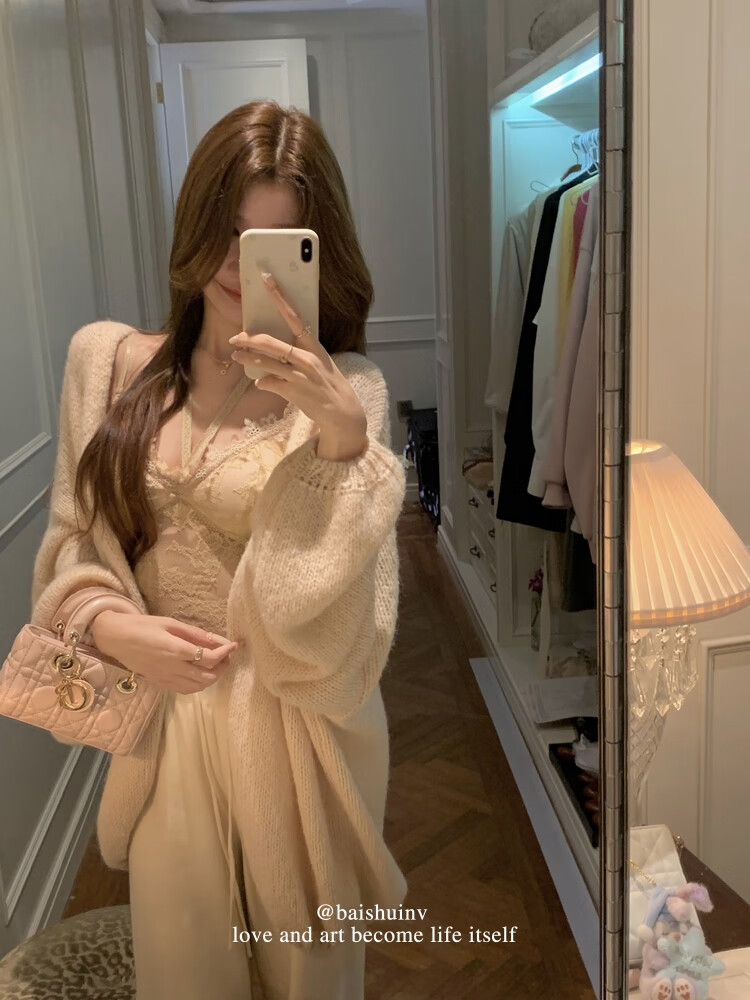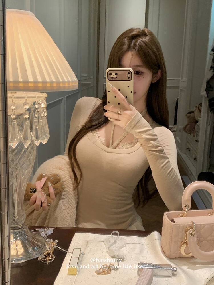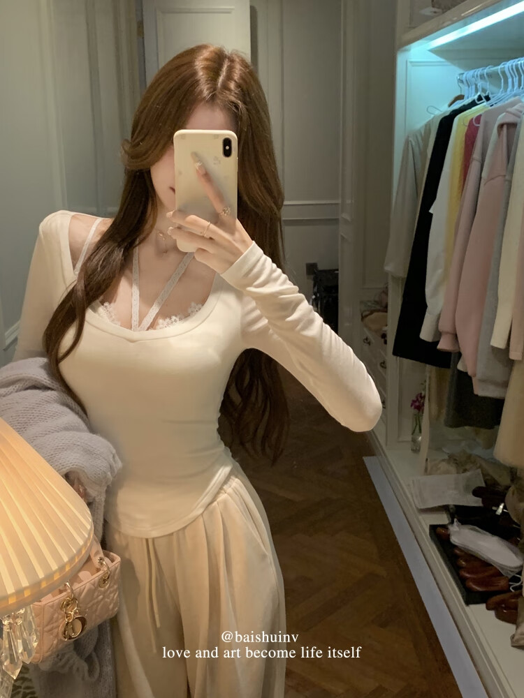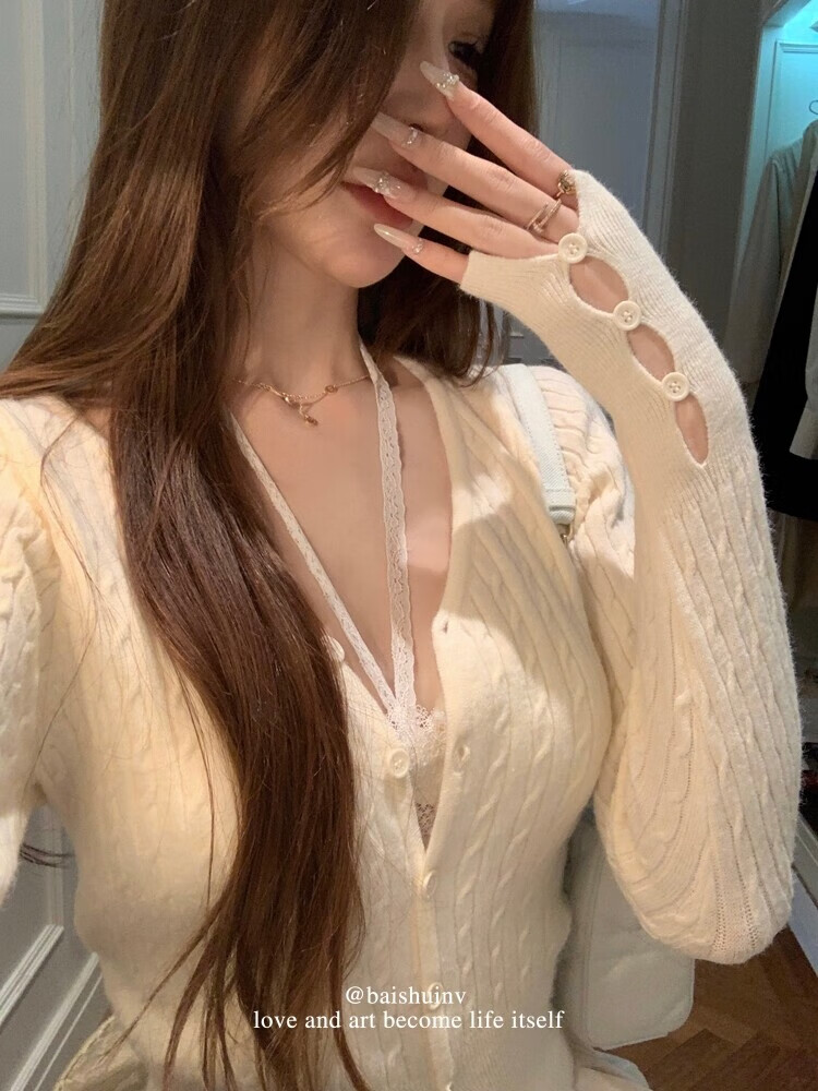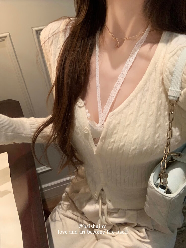 嗲嗲 inner wear Christmas wear lace camisole women's lace hollow top with breast pads off-white (first batch) ready stock M