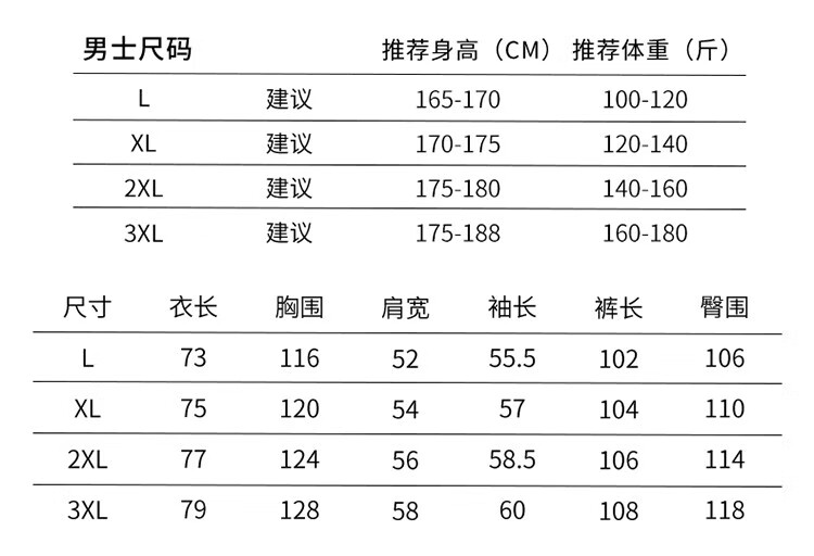 China (cm) 165 / 88-90 170 / 96-98 175 / 108-110 180 / 118-122 185 / 126-130