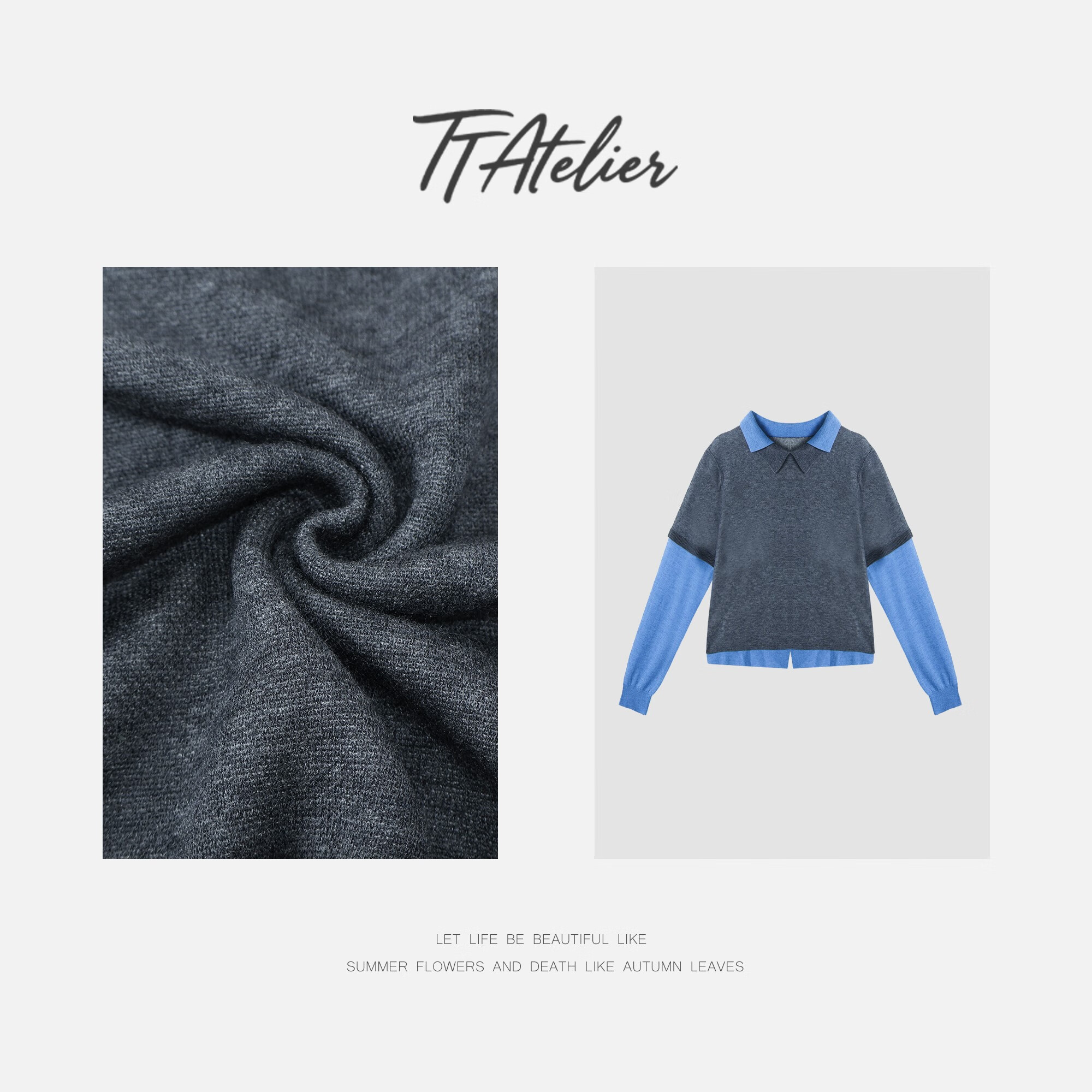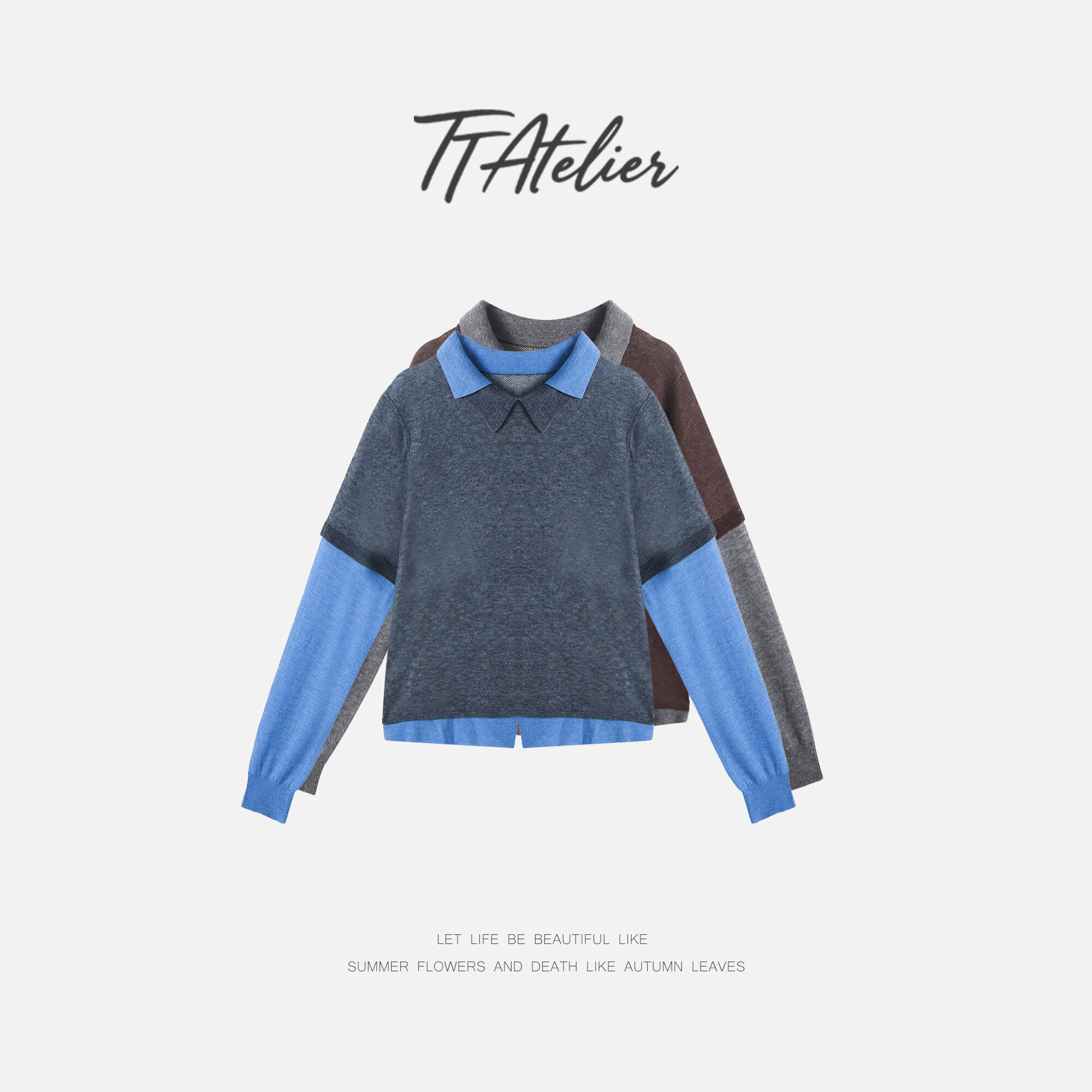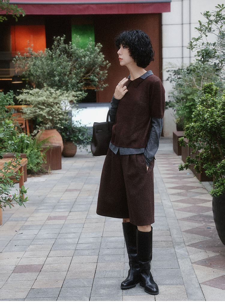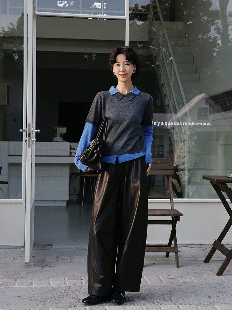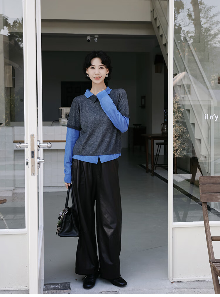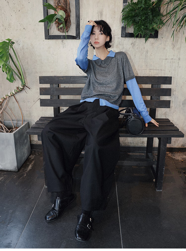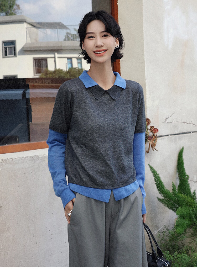 Xiaohongshu popular TT designer Seagull contrasting fake two-piece sheep wool T-shirt for women autumn new long-sleeved p gray M90-120Jin Jin equals 0.5 kg one size