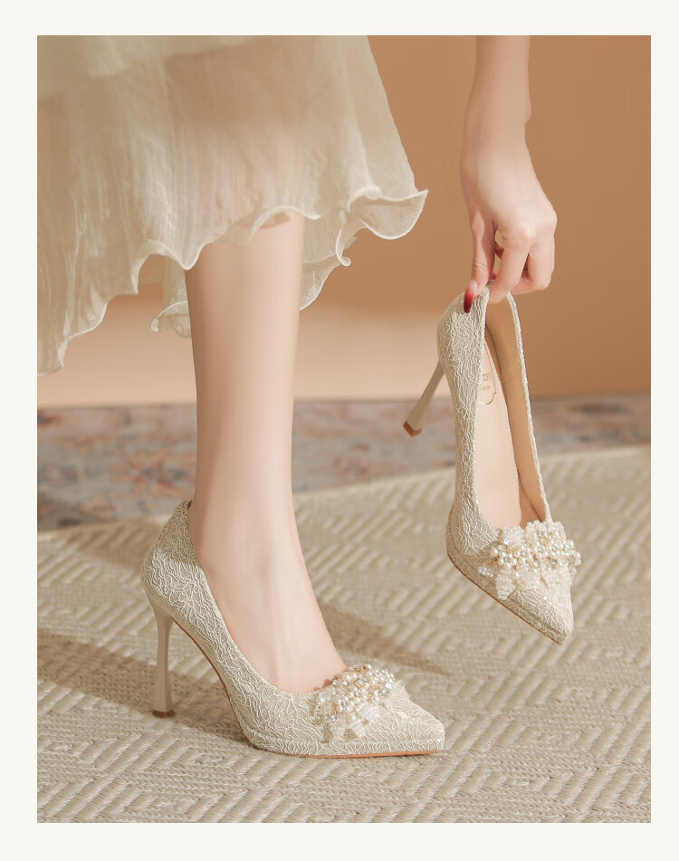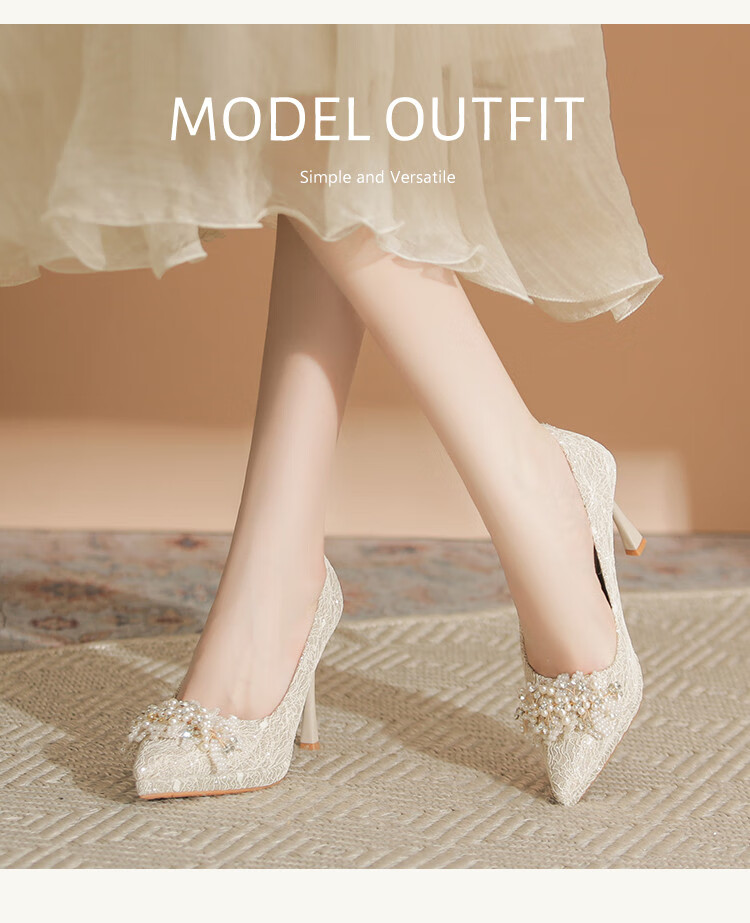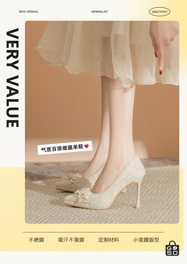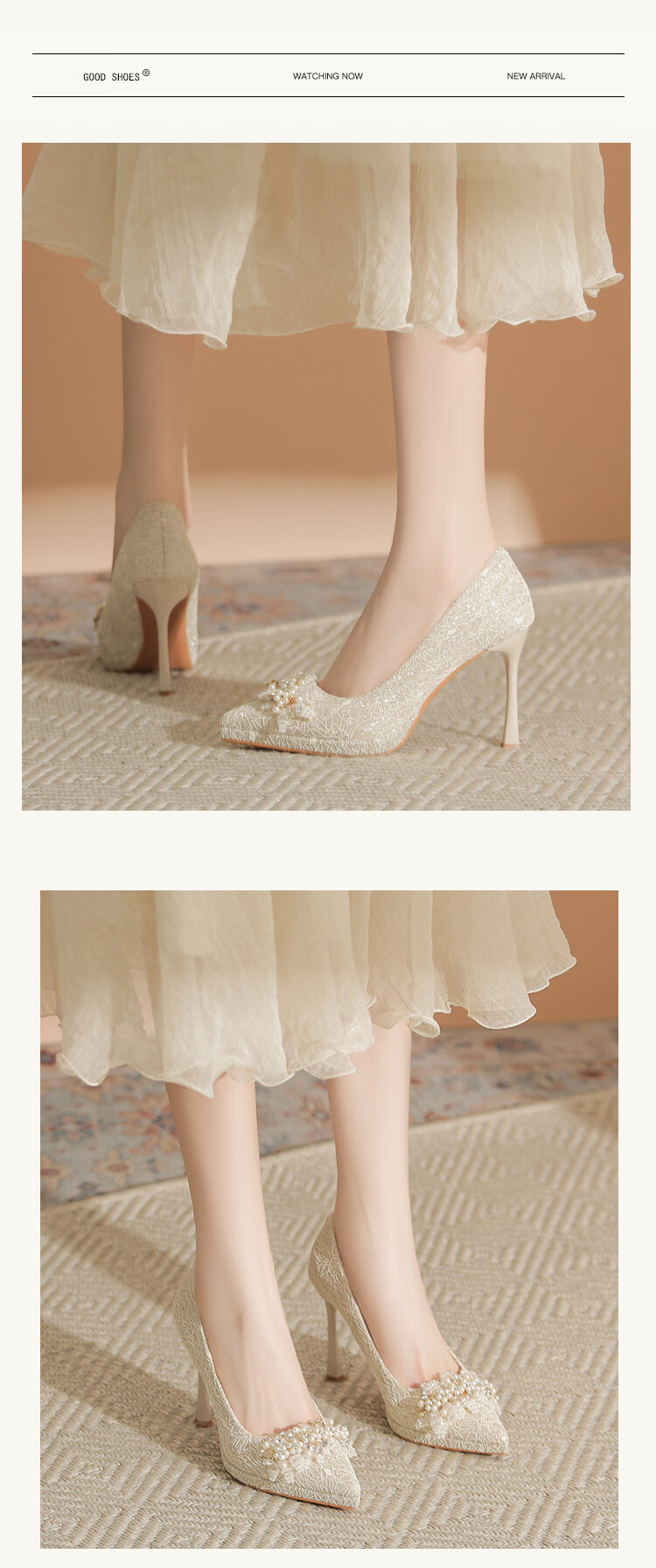 French pearl platform high-heeled shoes for small women, thick-soled single shoes, wedding dress, stiletto heels, wedding shoes for daily wear, champagne color 8CM, main picture 34