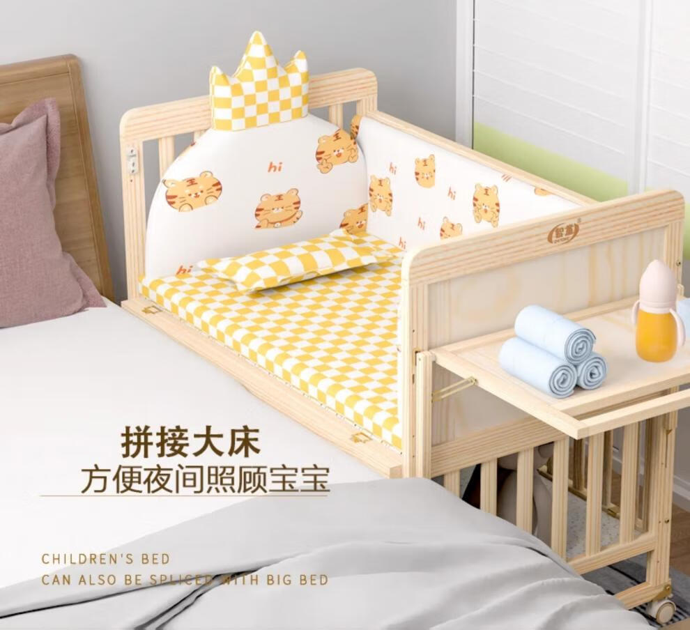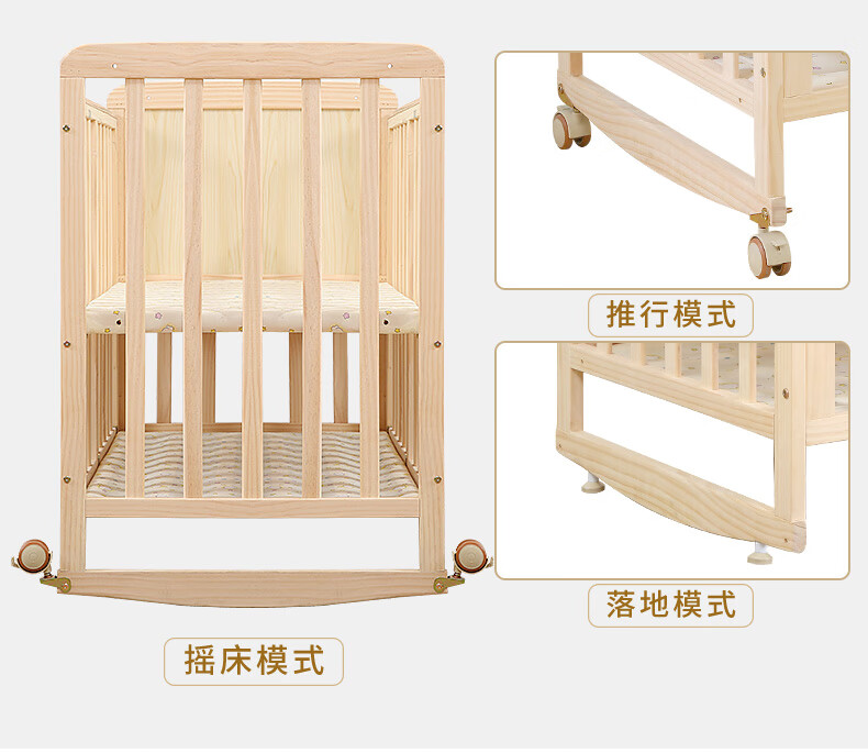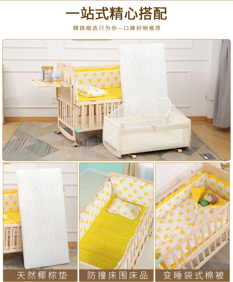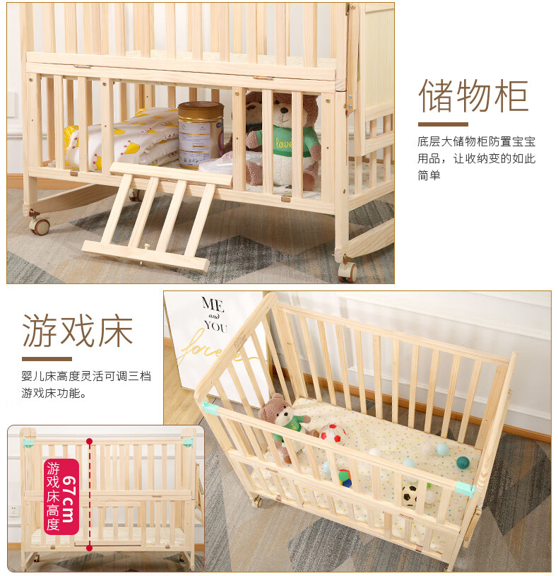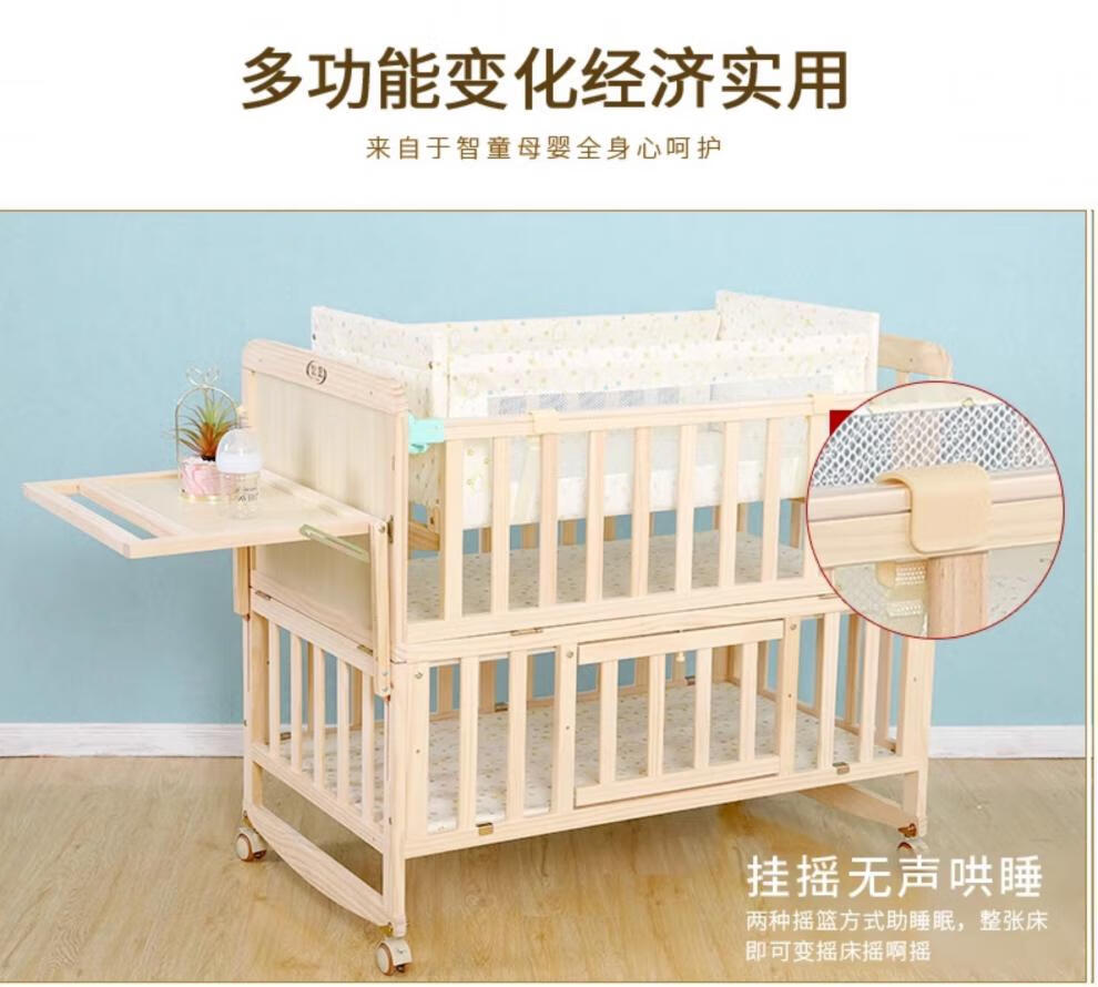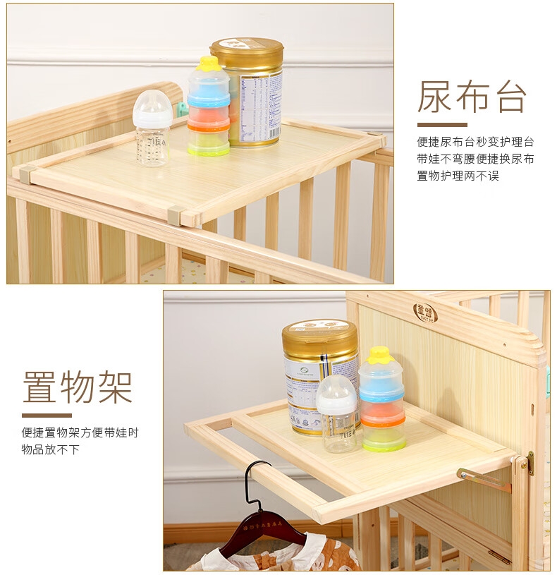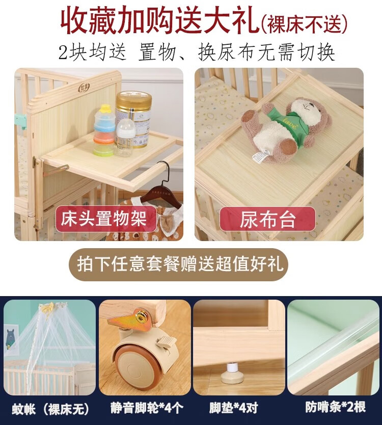 Intelligent pine solid wood liftable crib, simple modern multi-functional crib, brown cushion included and mosquito net included, bare bed, one-time package without shelf, diaper table, mosquito net, others_assembly_other structures
