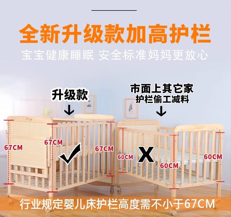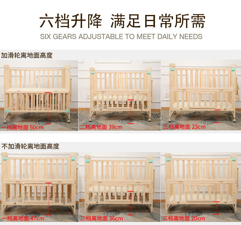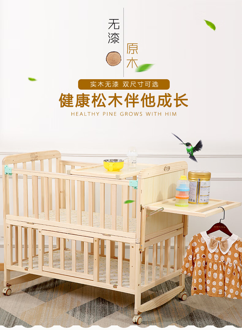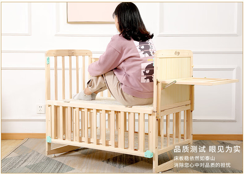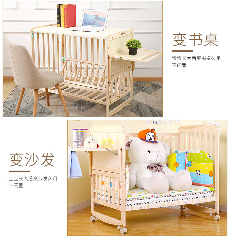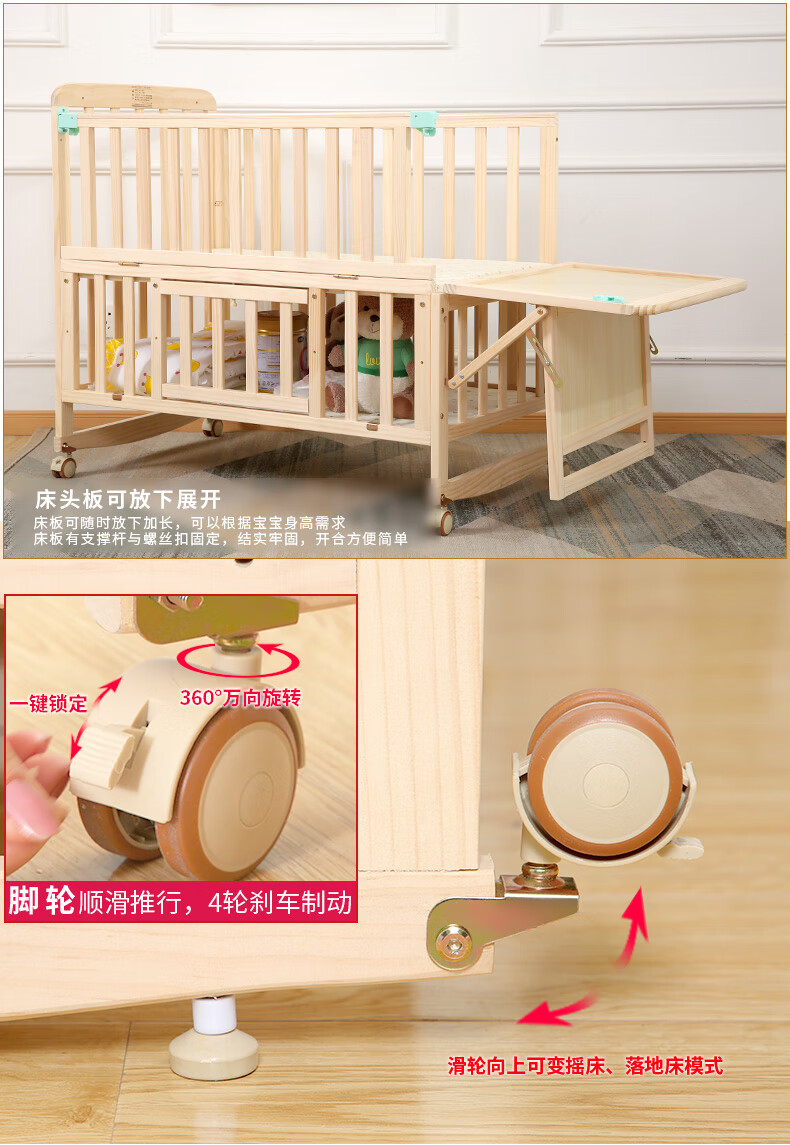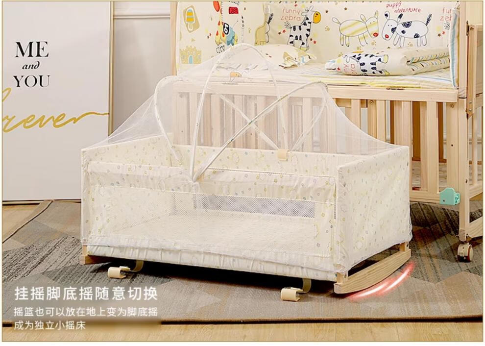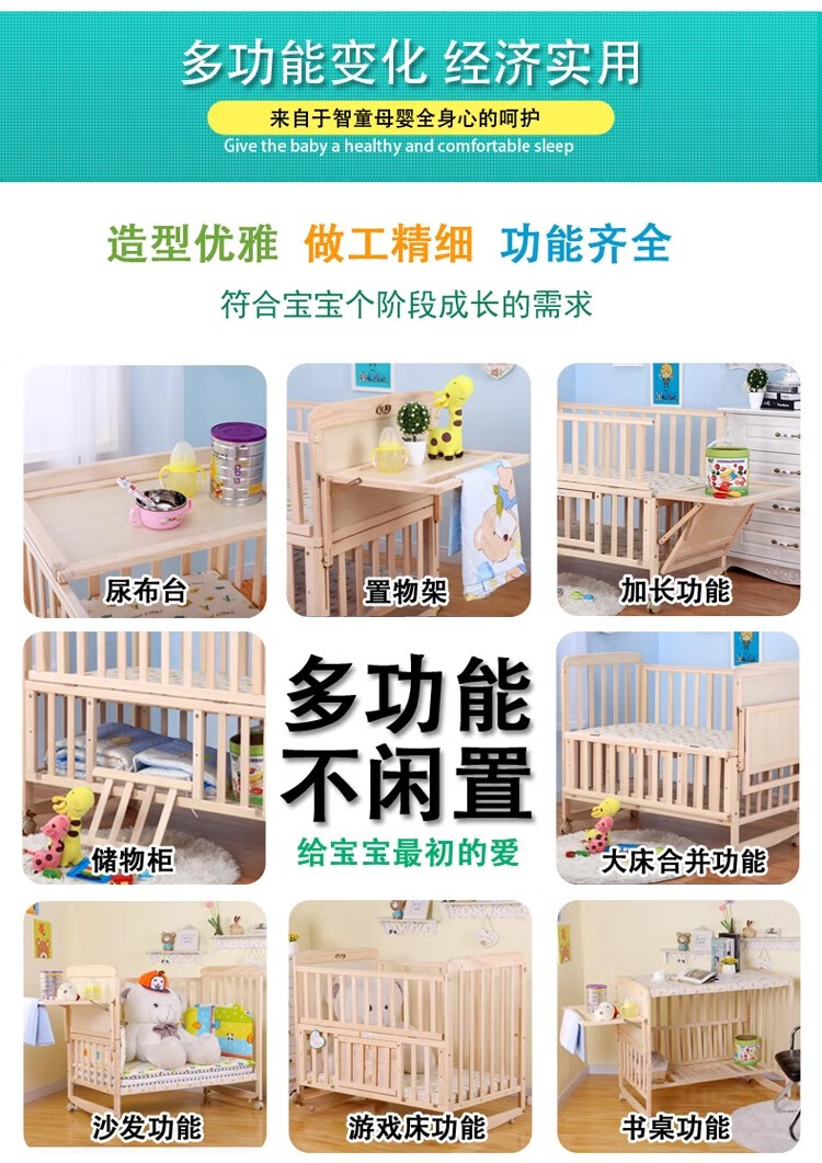 Intelligent pine solid wood liftable crib, simple modern multi-functional crib, brown cushion included and mosquito net included, bare bed, one-time package without shelf, diaper table, mosquito net, others_assembly_other structures