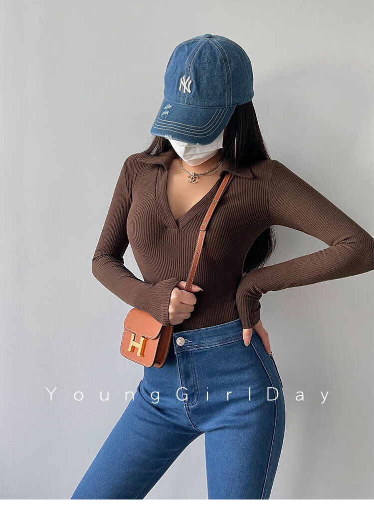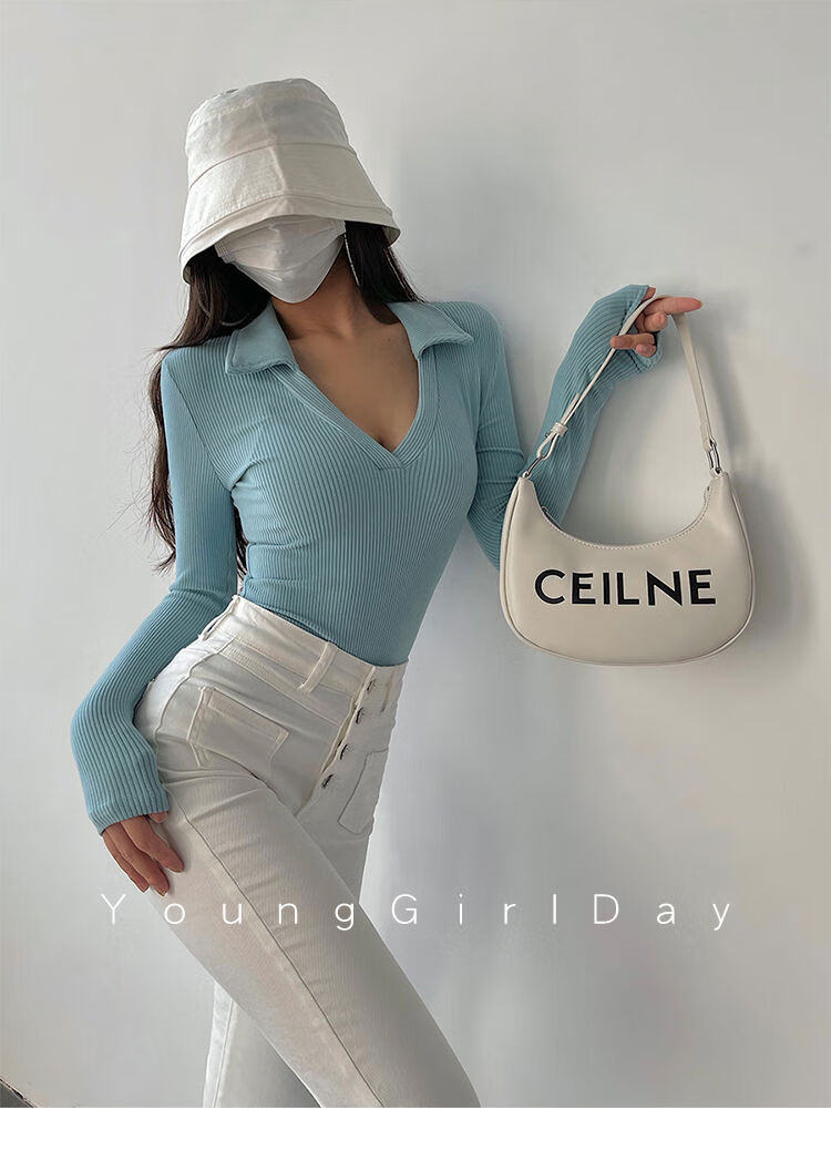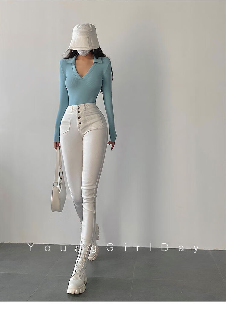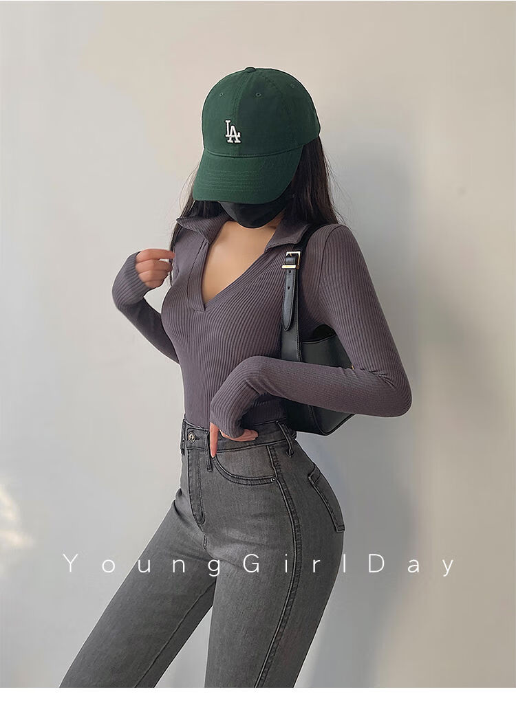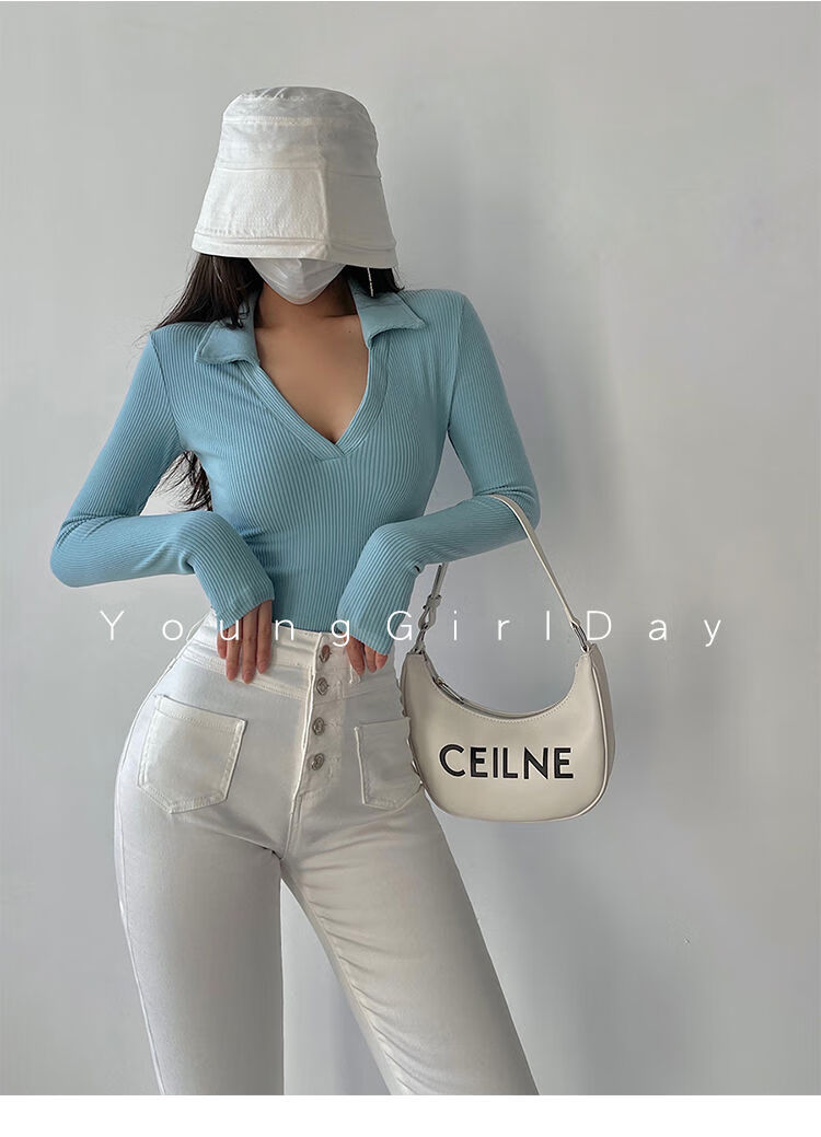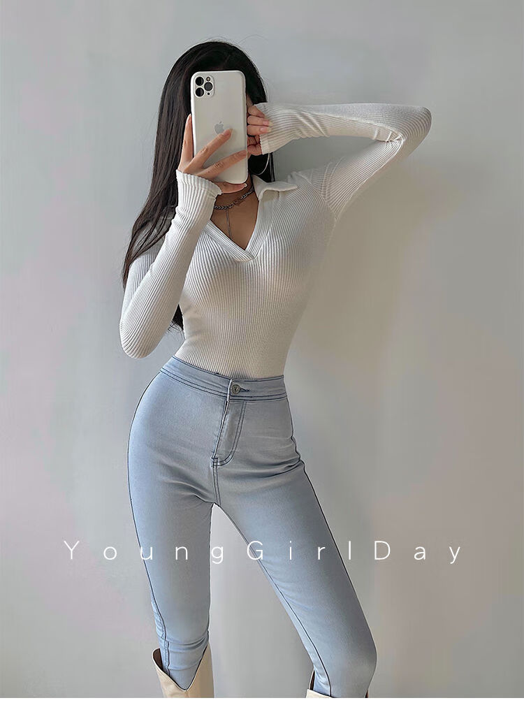 YoungGirlDay European and American hot girls sexy V-neck elastic tight slimming long-sleeved bottoming T-shirt jumpsuit top baby blue autumn and winter brushed version regular style S S