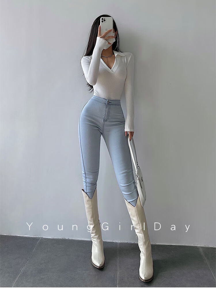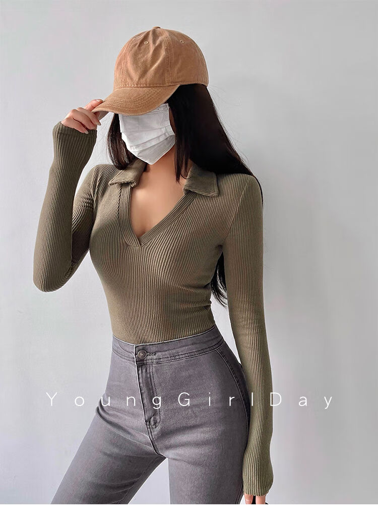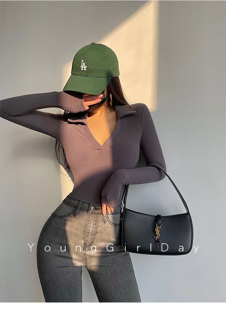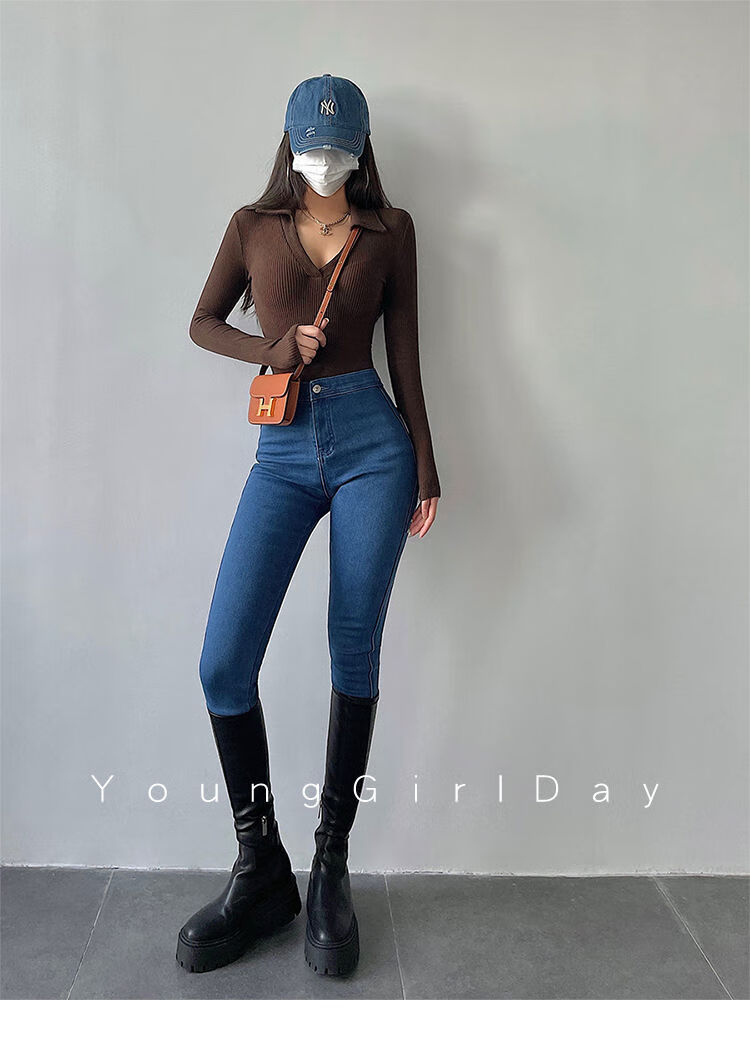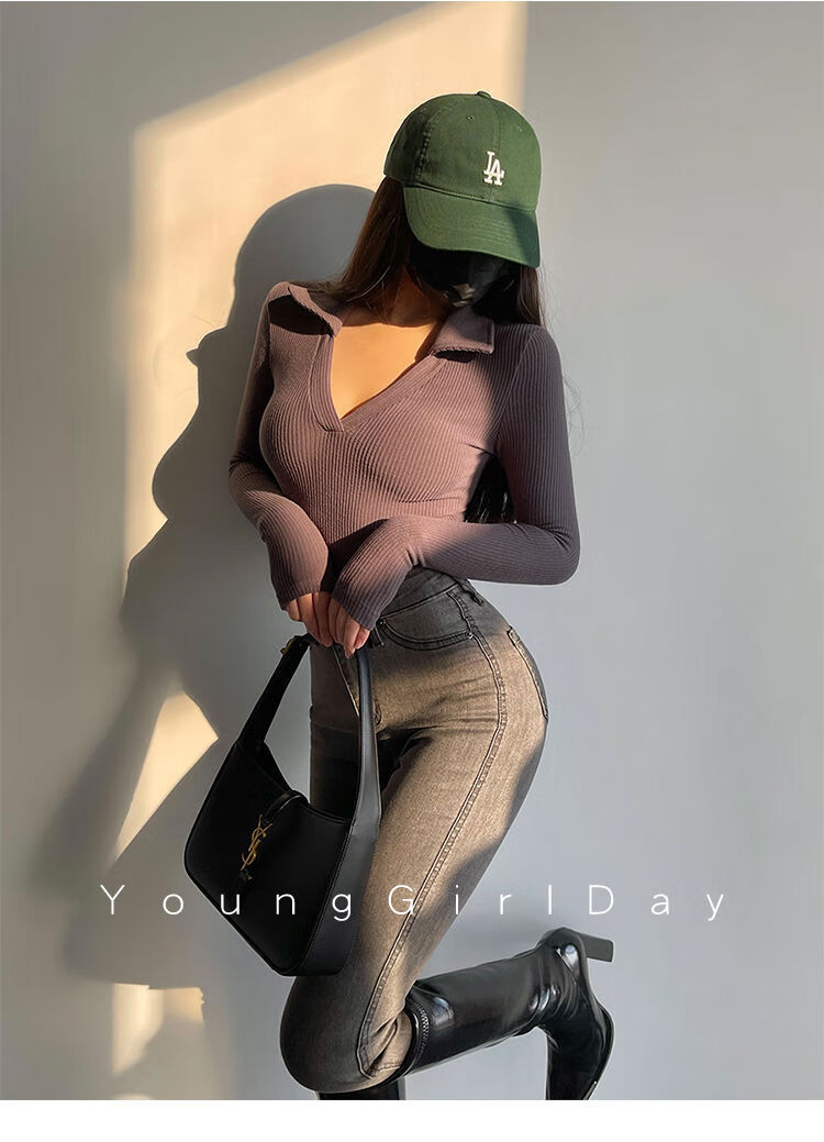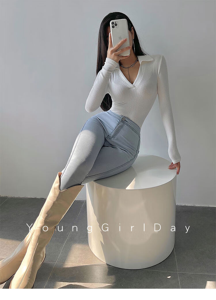 YoungGirlDay European and American hot girls sexy V-neck elastic tight slimming long-sleeved bottoming T-shirt jumpsuit top baby blue autumn and winter brushed version regular style S S