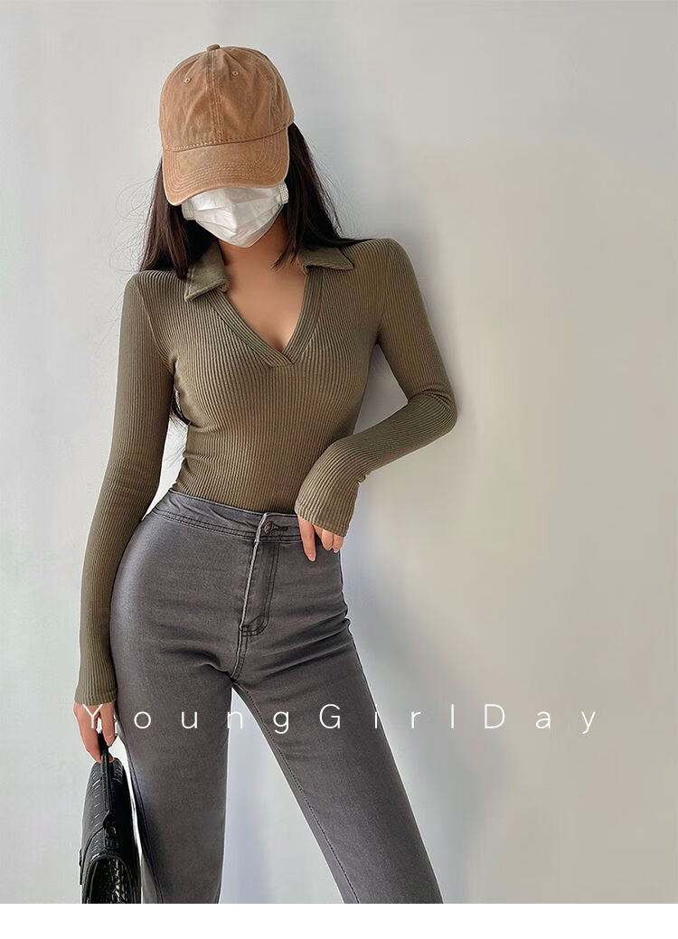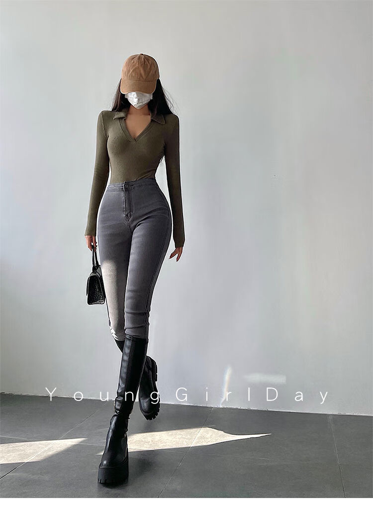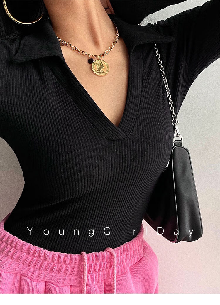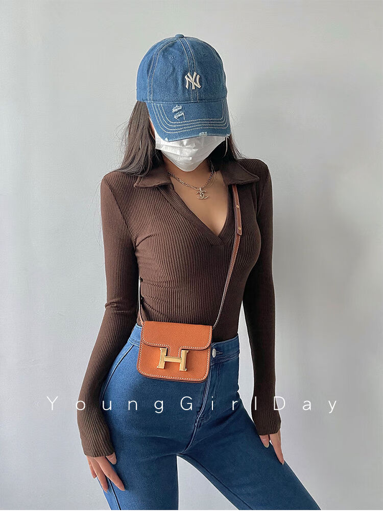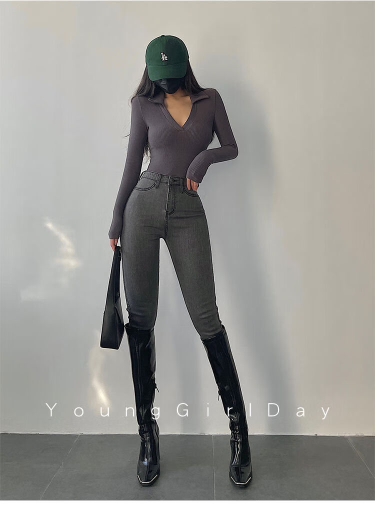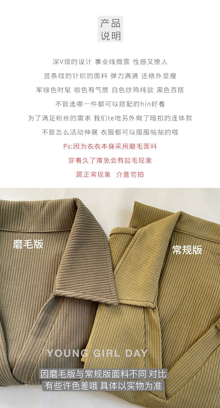 YoungGirlDay European and American hot girls sexy V-neck elastic tight slimming long-sleeved bottoming T-shirt jumpsuit top baby blue autumn and winter brushed version regular style S S