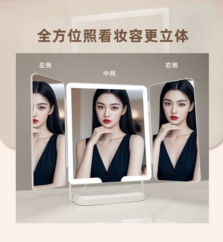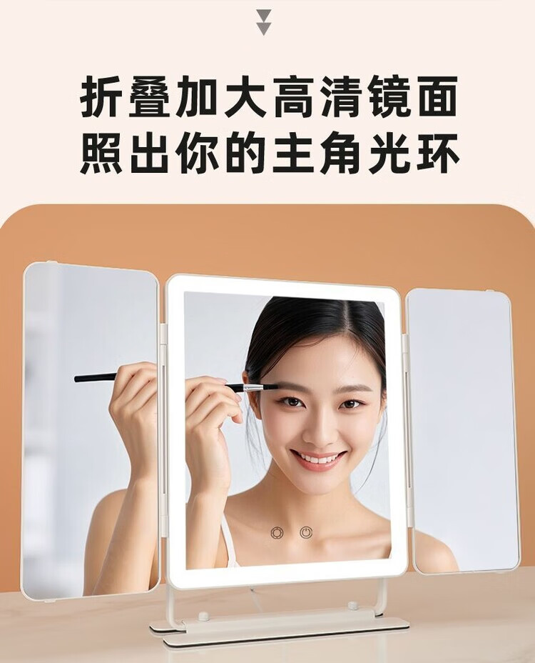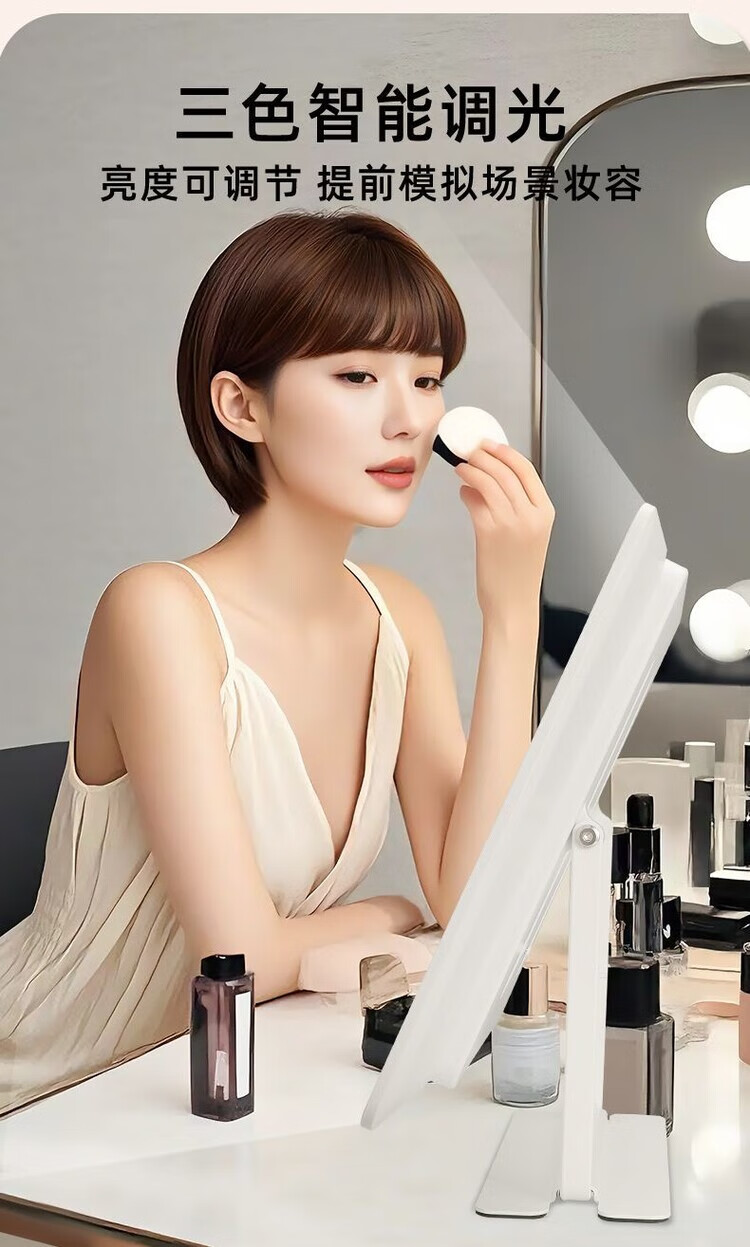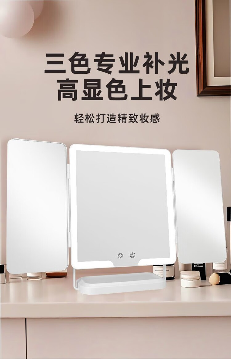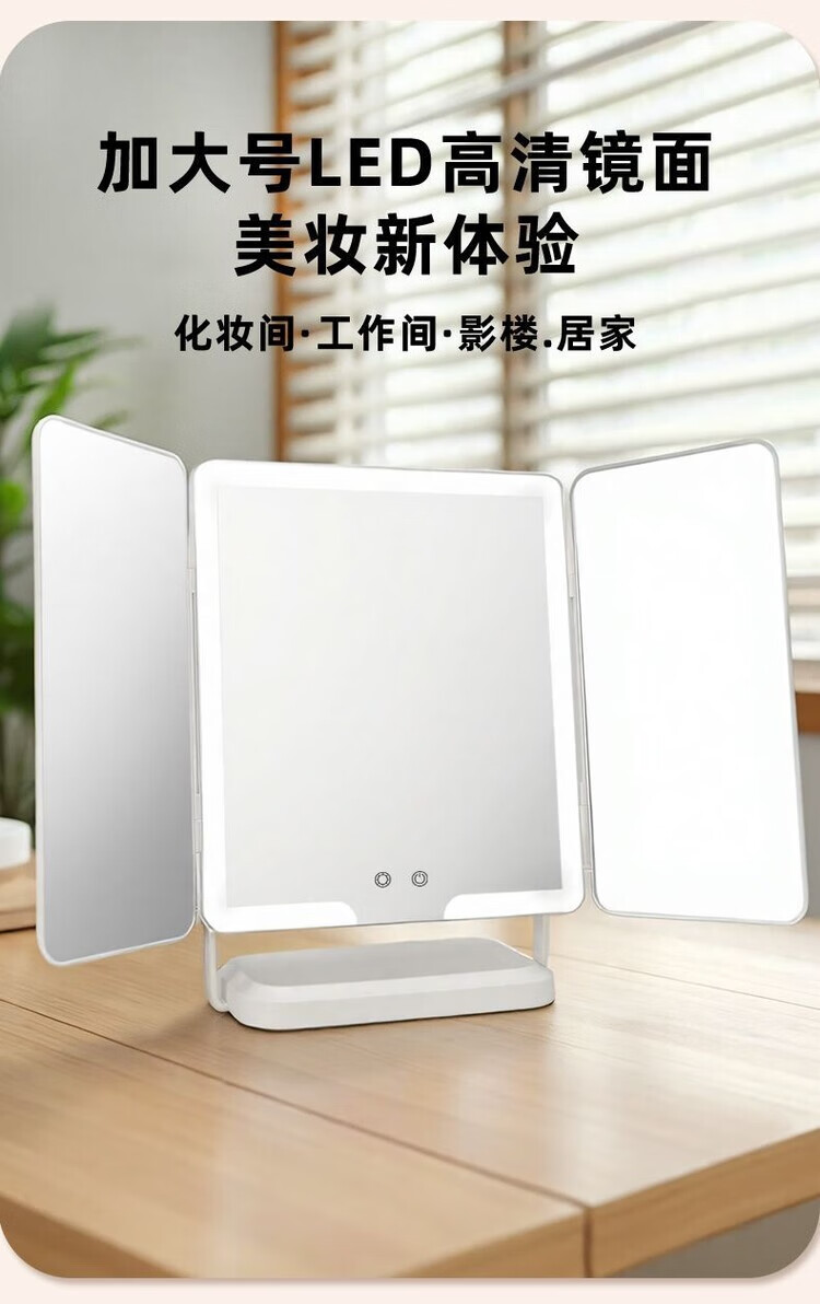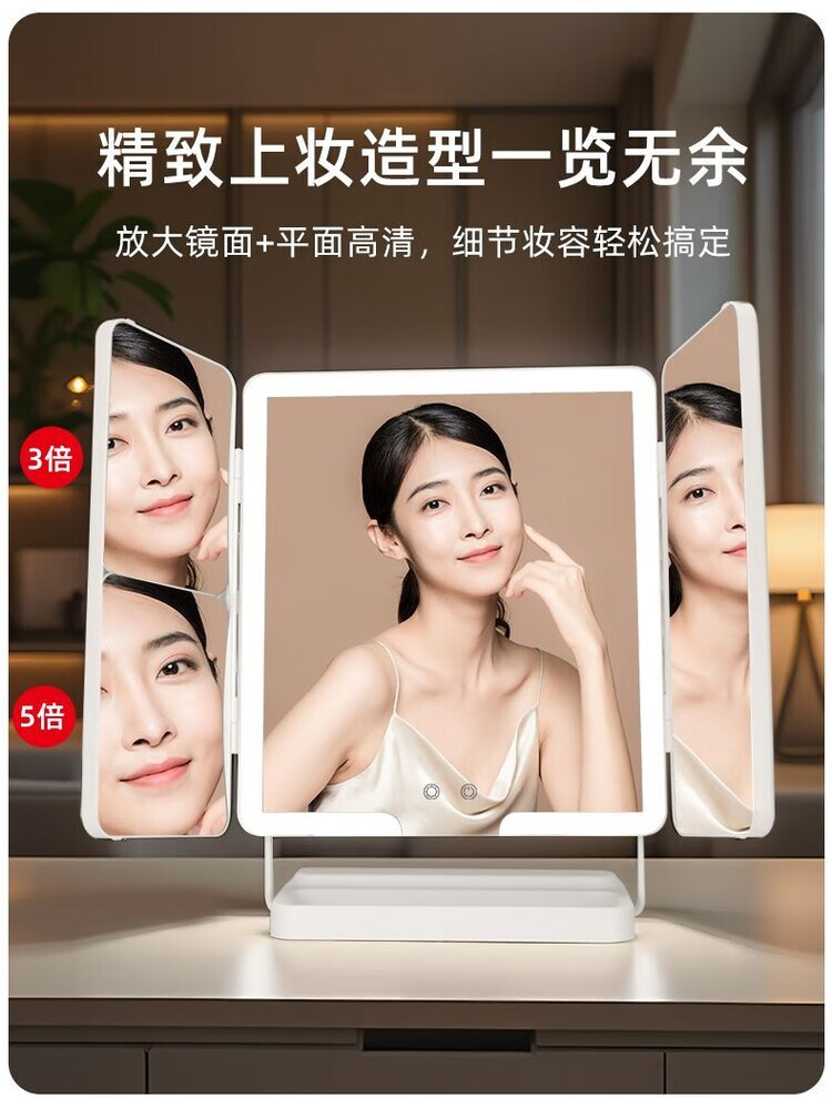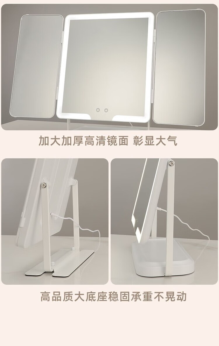 Multi-functional three-fold mirror desktop desktop led lighted makeup mirror folding mirror home dormitory supplementary light ins white large size with magnification foldable (rechargeable model 5000 mAh)*