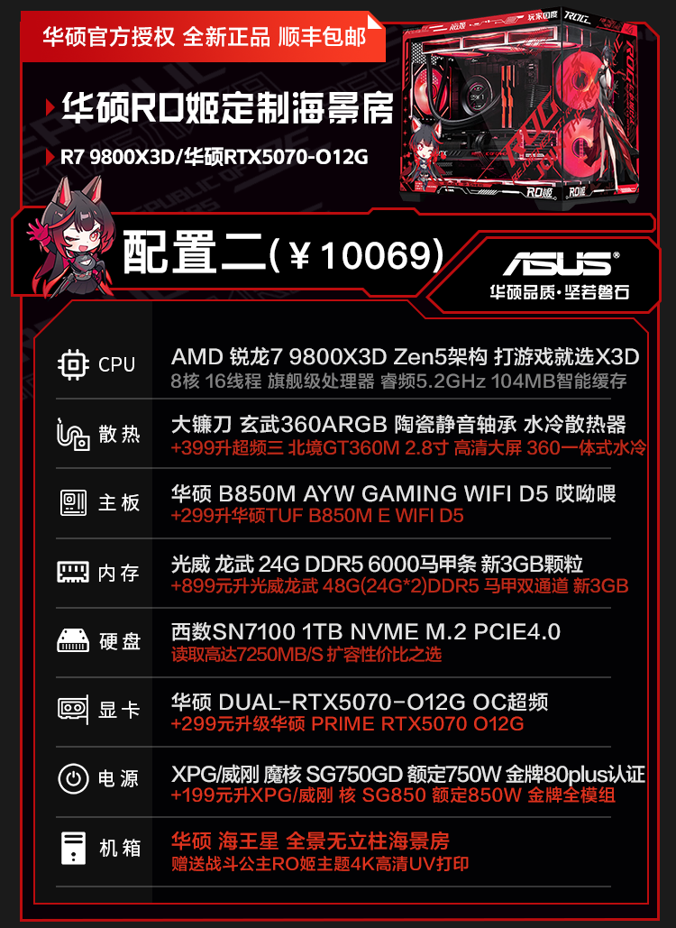 ASUS ROG Night God family bucket 9800X3D 9950X3D ASUS RTX5080 5070Ti desktop assembly computer game console live broadcast design rendering video editing complete machine configuration two upgrade R7 9800X3D + ASUS 5070