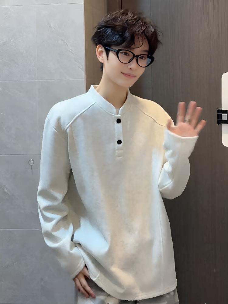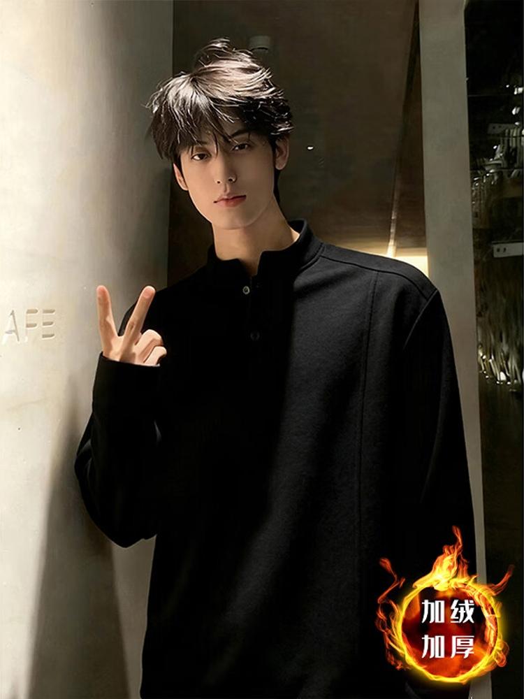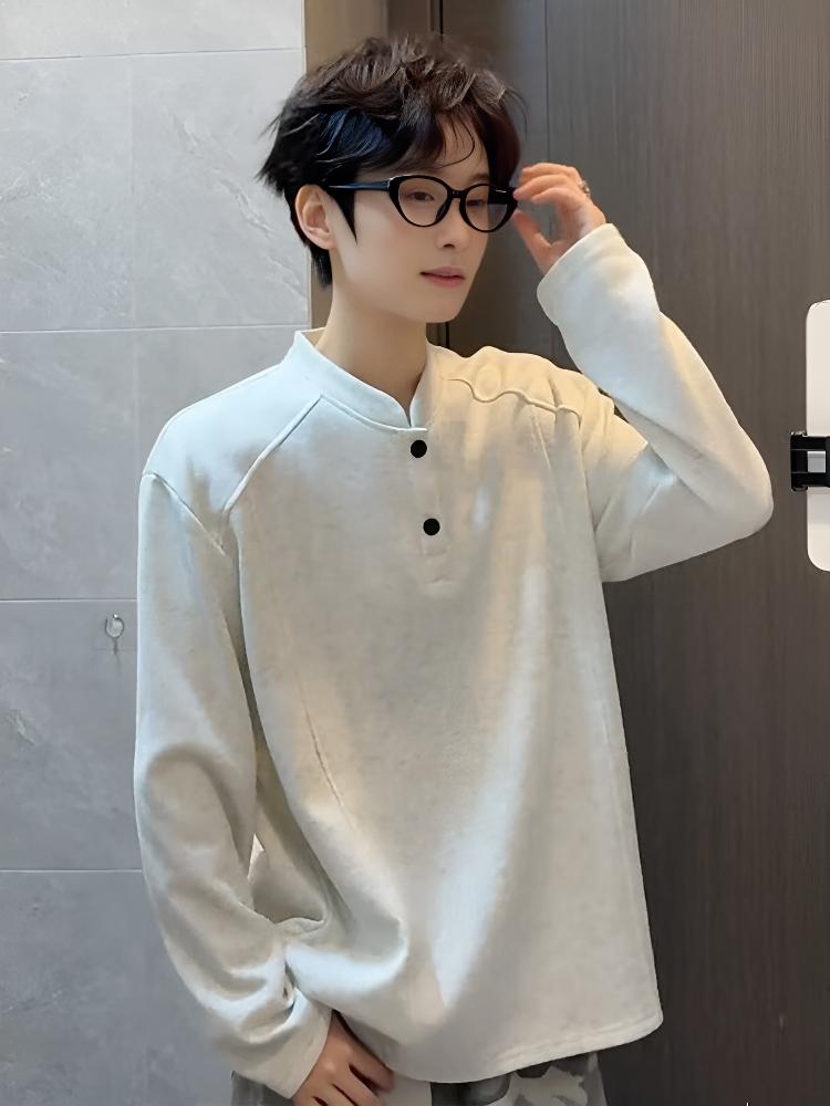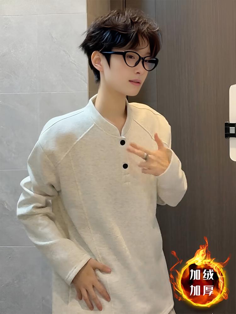 Katuchi plus velvet right shoulder Henry collar POLO shirt deconstructed splicing sweatshirt men's winter trendy brand bomber jacket high street top white gray plus velvet style XL