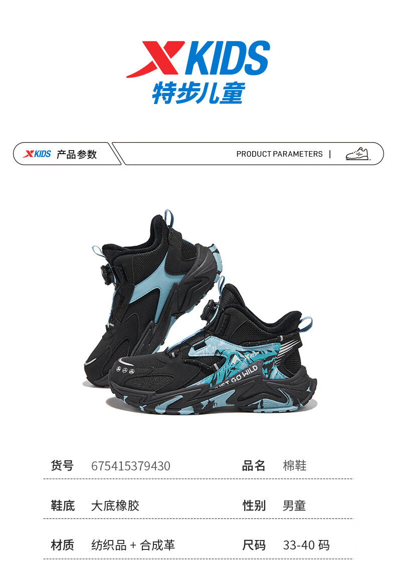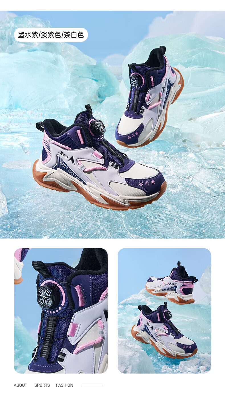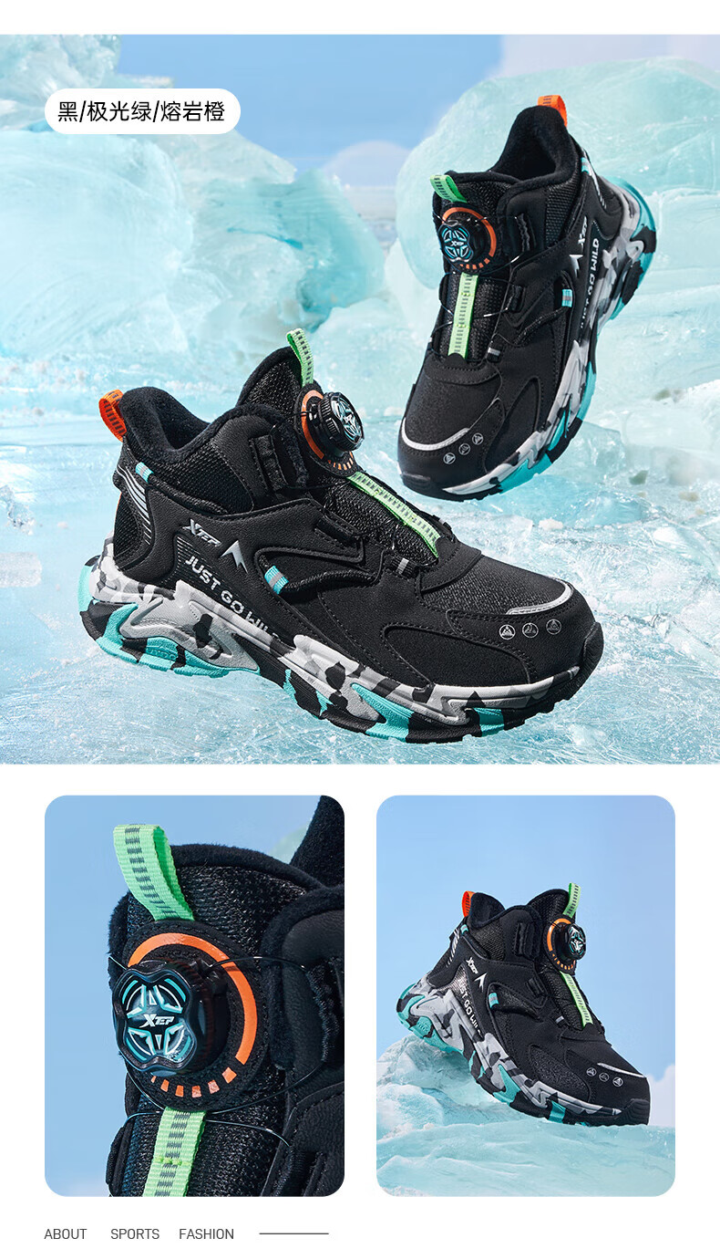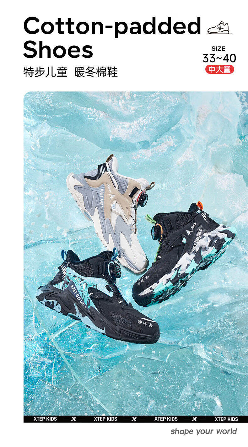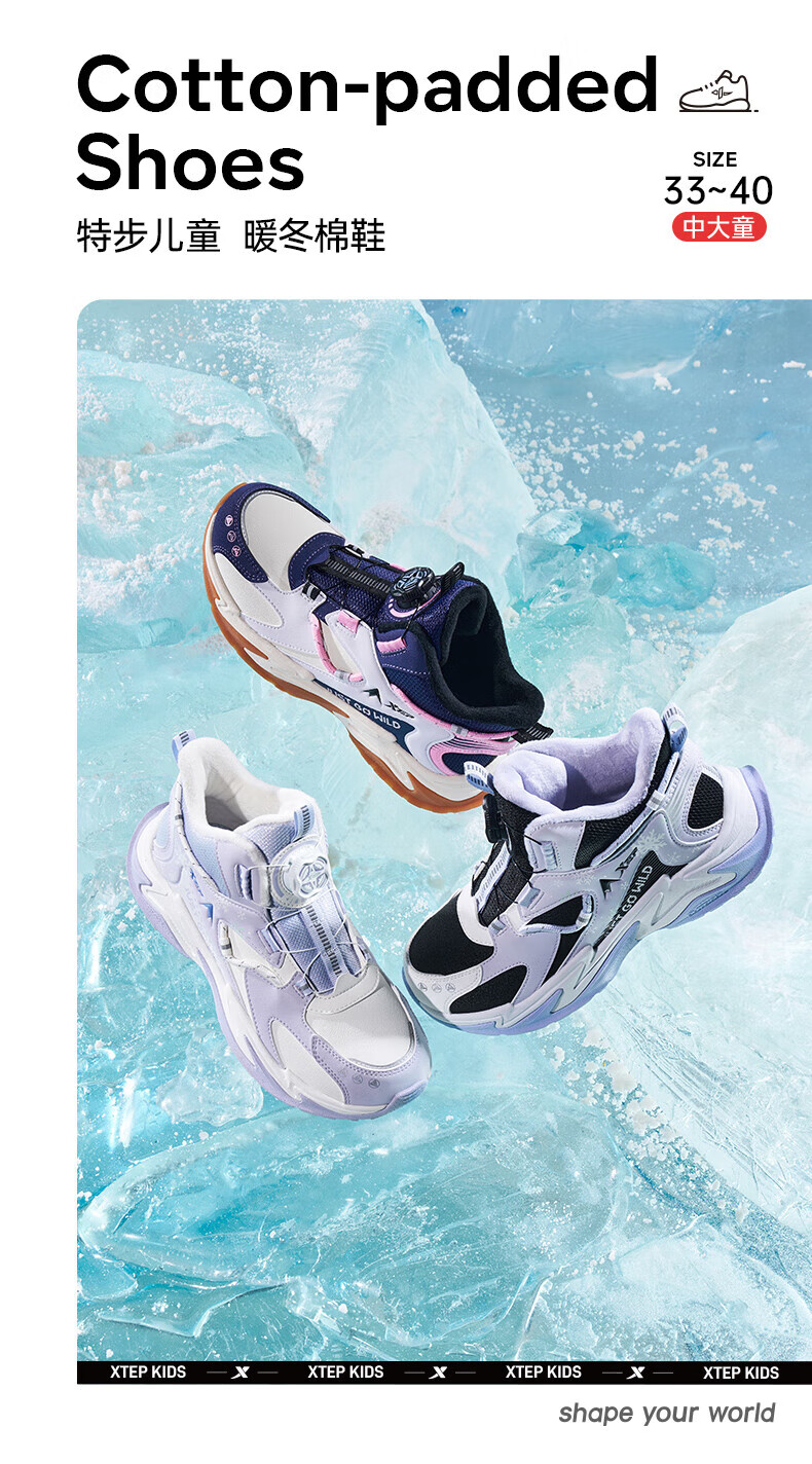 XTEP children's cotton shoes, winter wear-resistant, windproof, soft leather surface, warm and fine mink velvet sports shoes for boys and girls, middle and large children, black/empty blue 33
