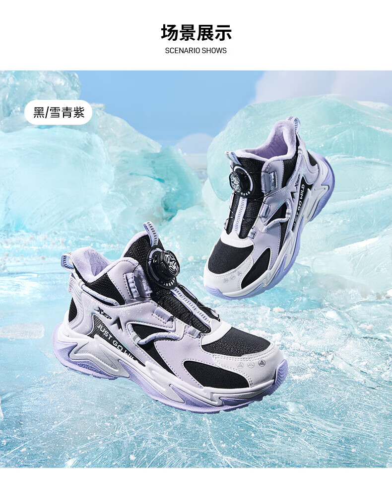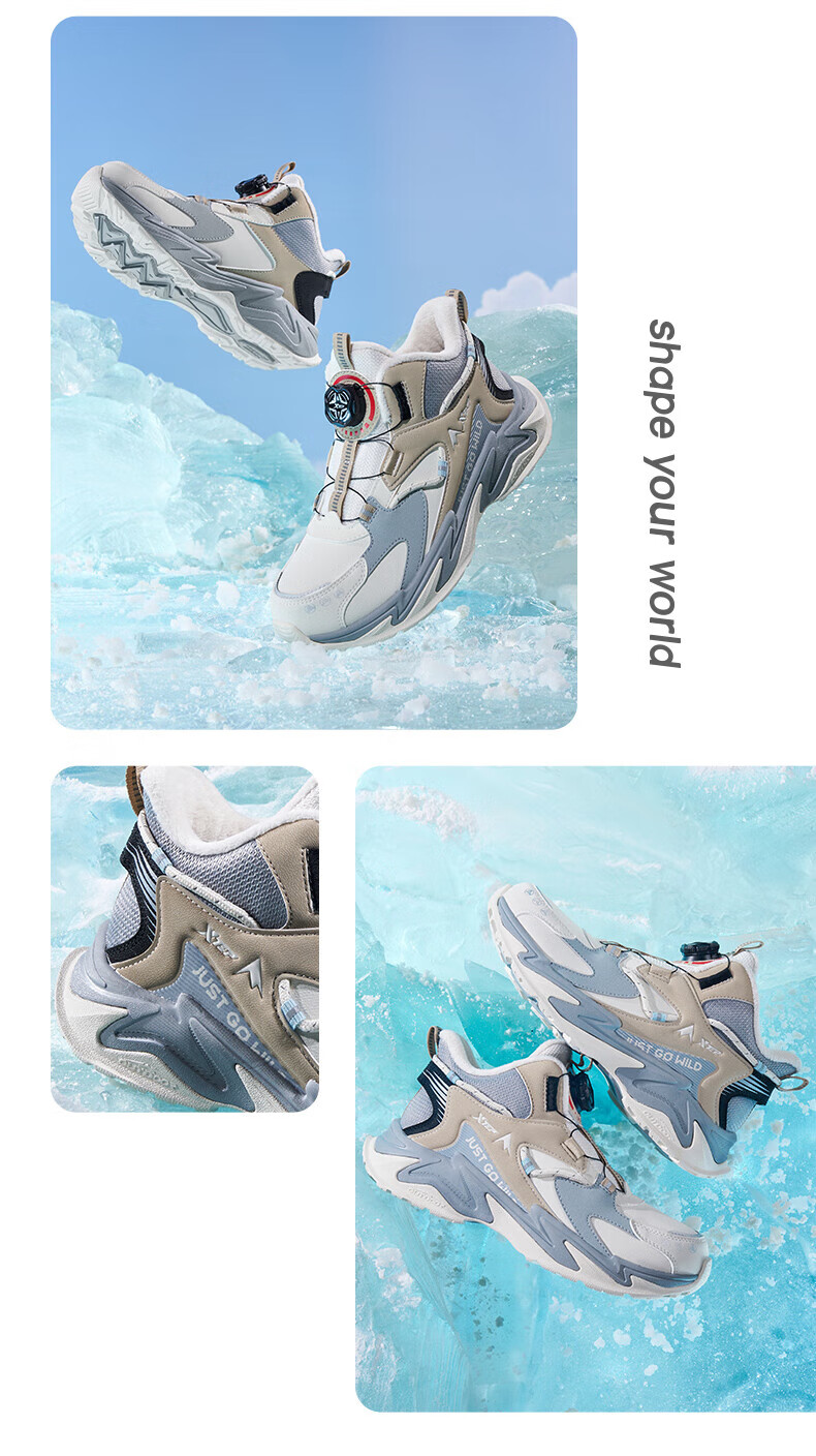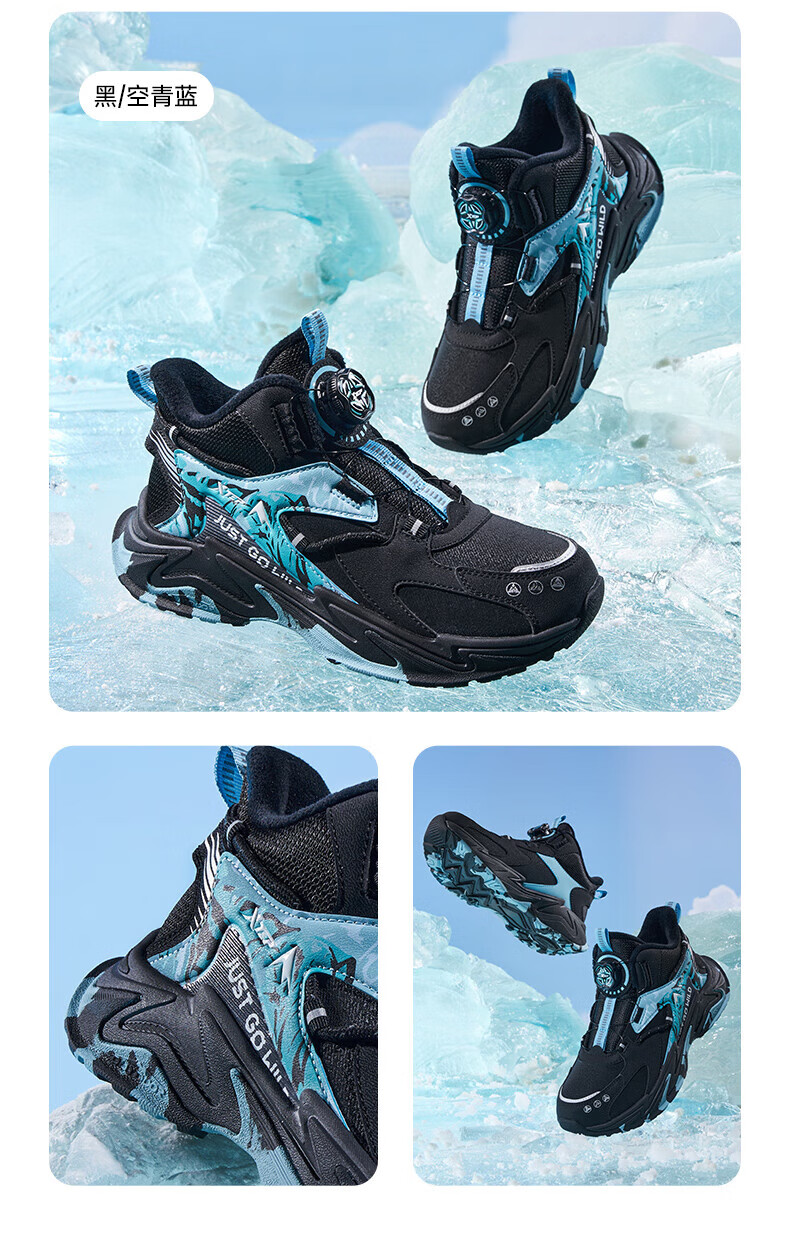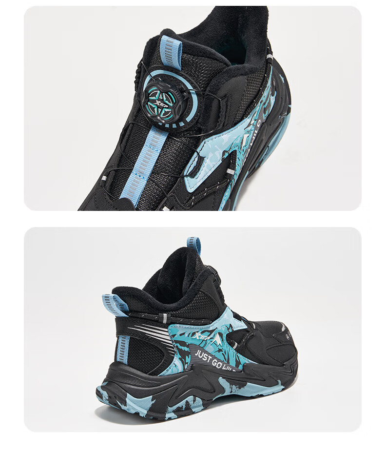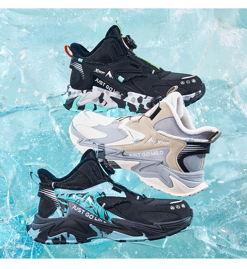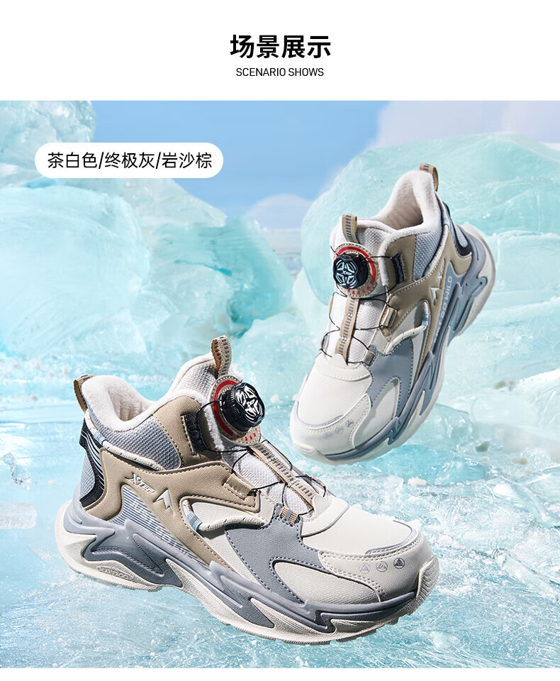 XTEP children's cotton shoes, winter wear-resistant, windproof, soft leather surface, warm and fine mink velvet sports shoes for boys and girls, middle and large children, black/empty blue 33