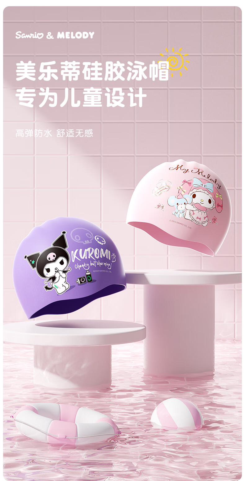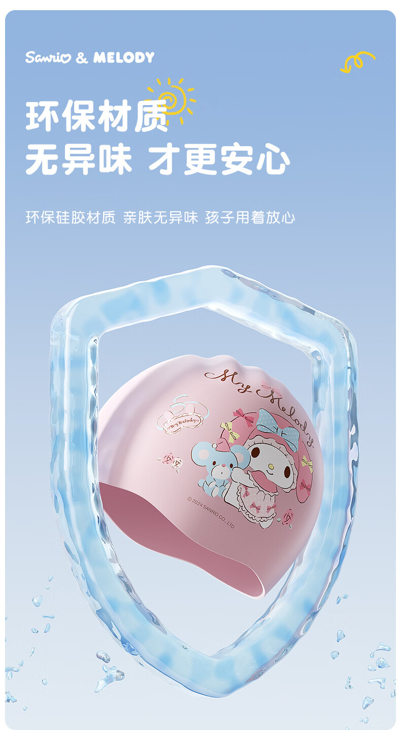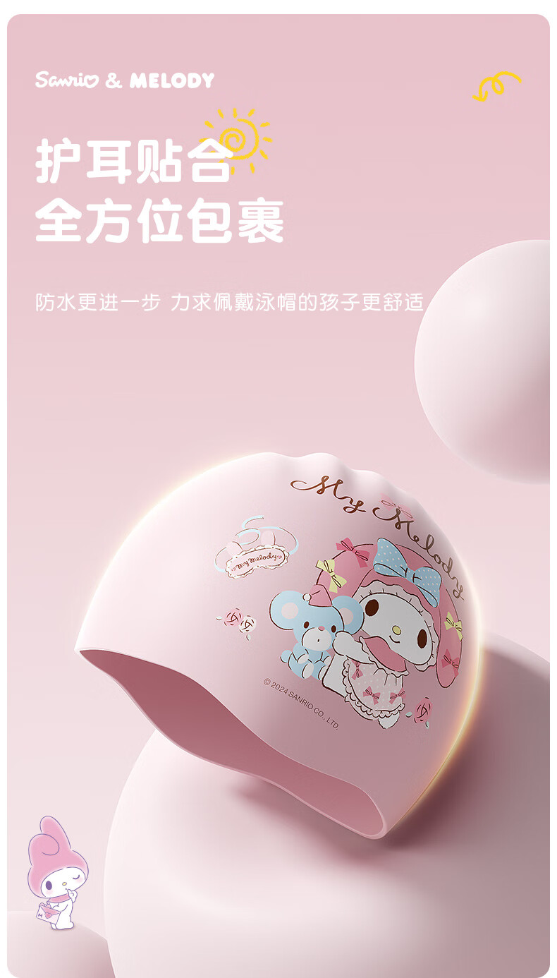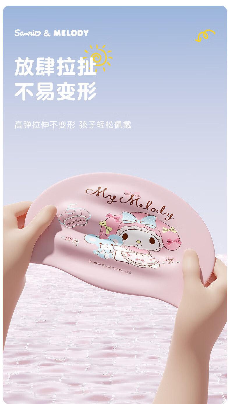 Sanrio children's swimming cap for girls, silicone ear protection for women with long hair, enlarged swimming cap, boys' swimming goggles set, Melody three-piece swimming goggles + nose clip + earplugs
