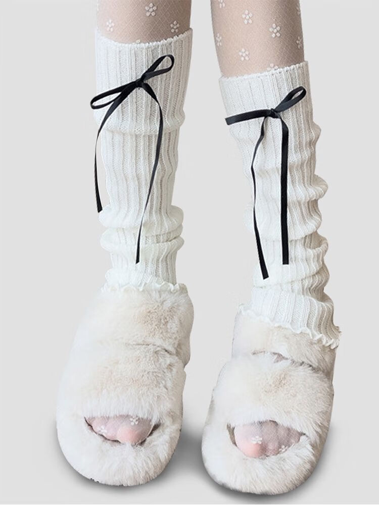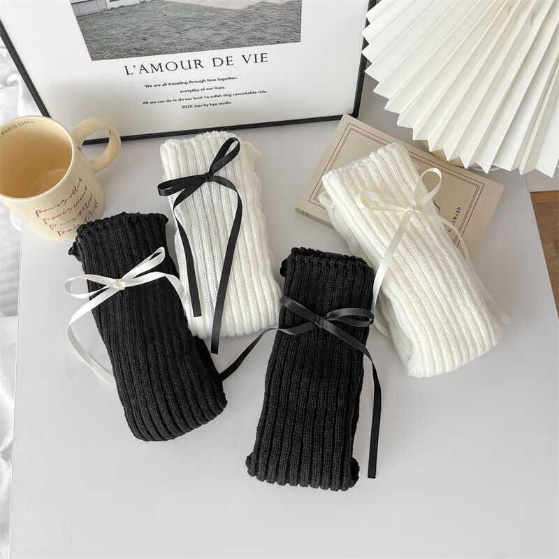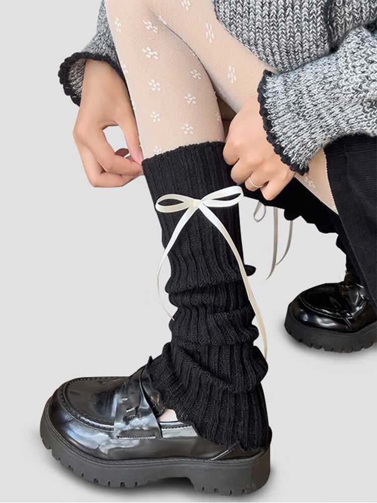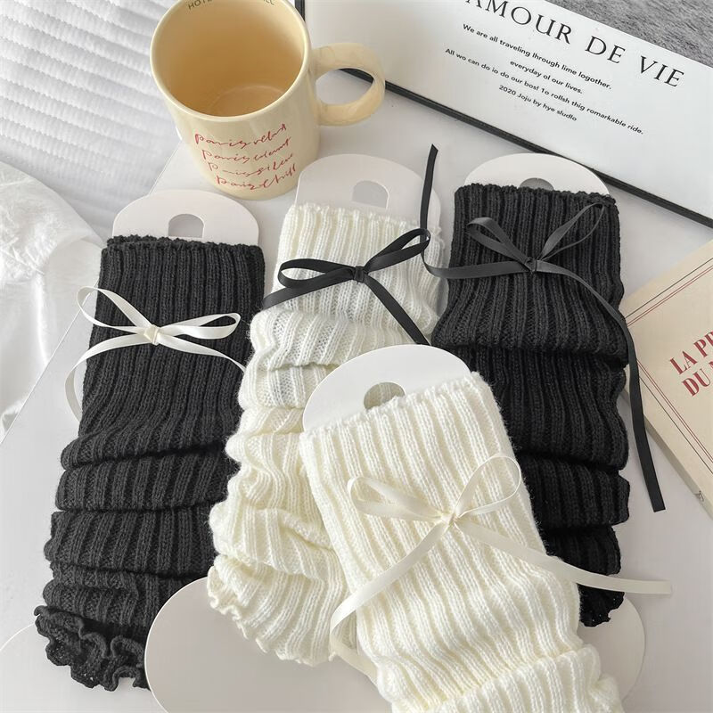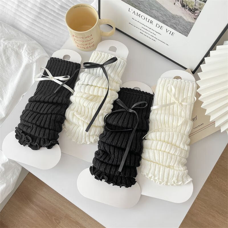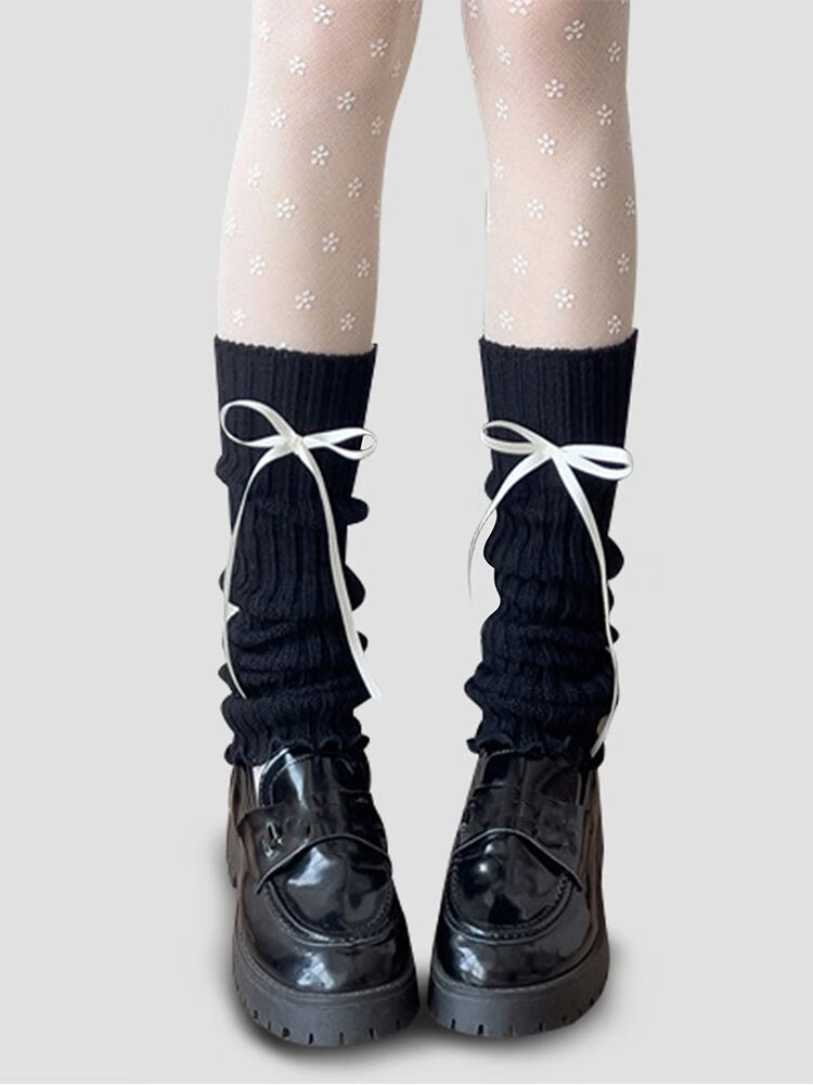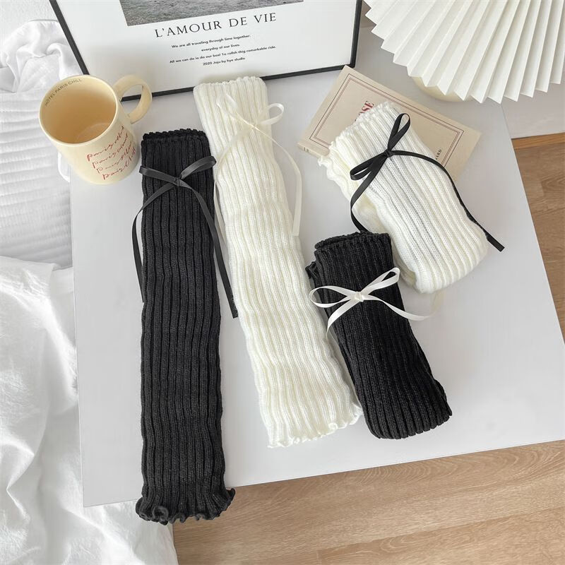 Shiganu long bow knitted socks for women autumn and winter thickened leg warmers black long pile socks jk Japanese socks black socks 40cm + white bow