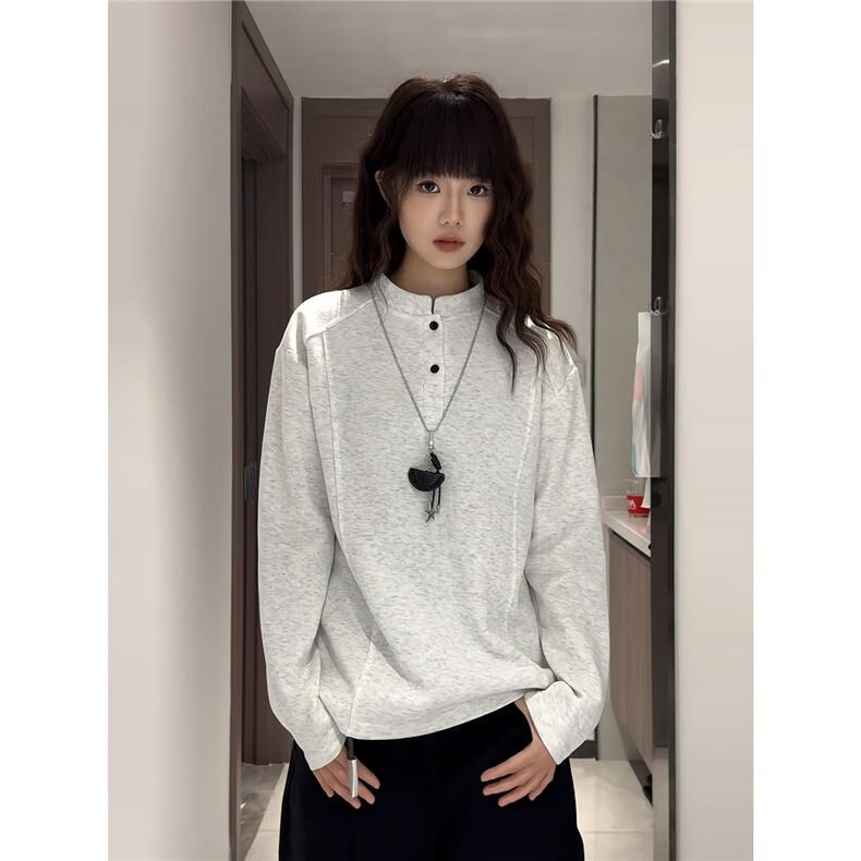 Huazhenmian (HUAZHENMIAN) velvet white floral gray Henry collar long-sleeved POLO shirt men's style handsome shoulder T-shirt American splicing sweatshirt white gray regular M