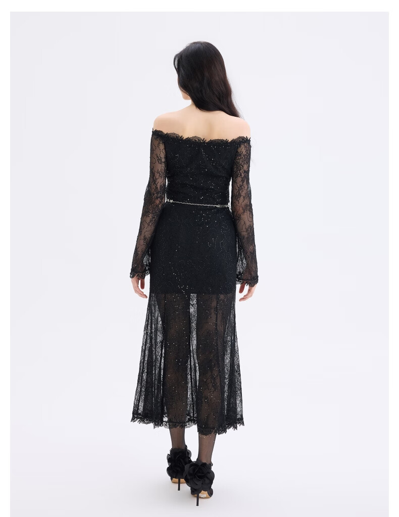 Bebe2025 new autumn and winter women's temperament bell sleeve one-shoulder lace fishtail dress 451004 black S
