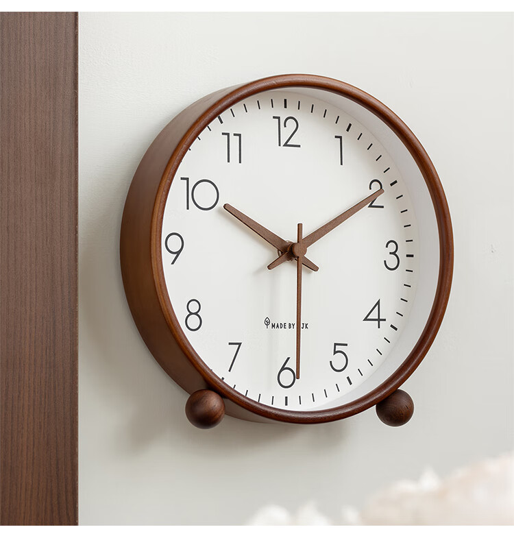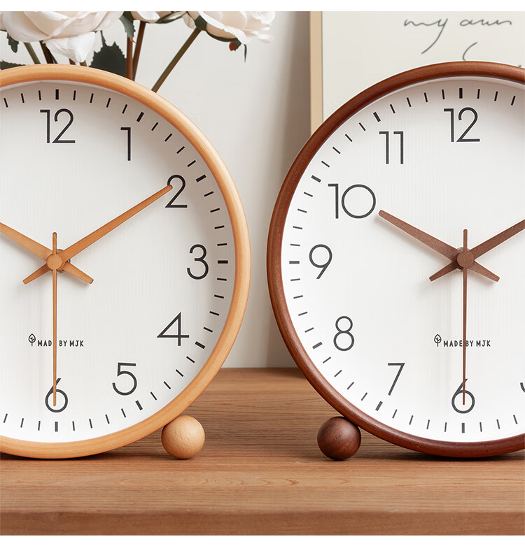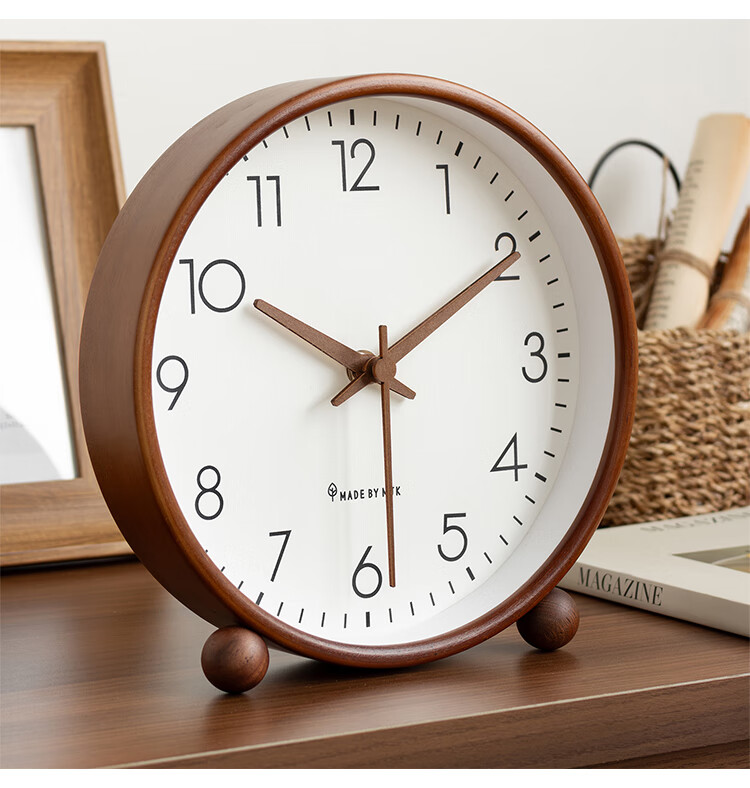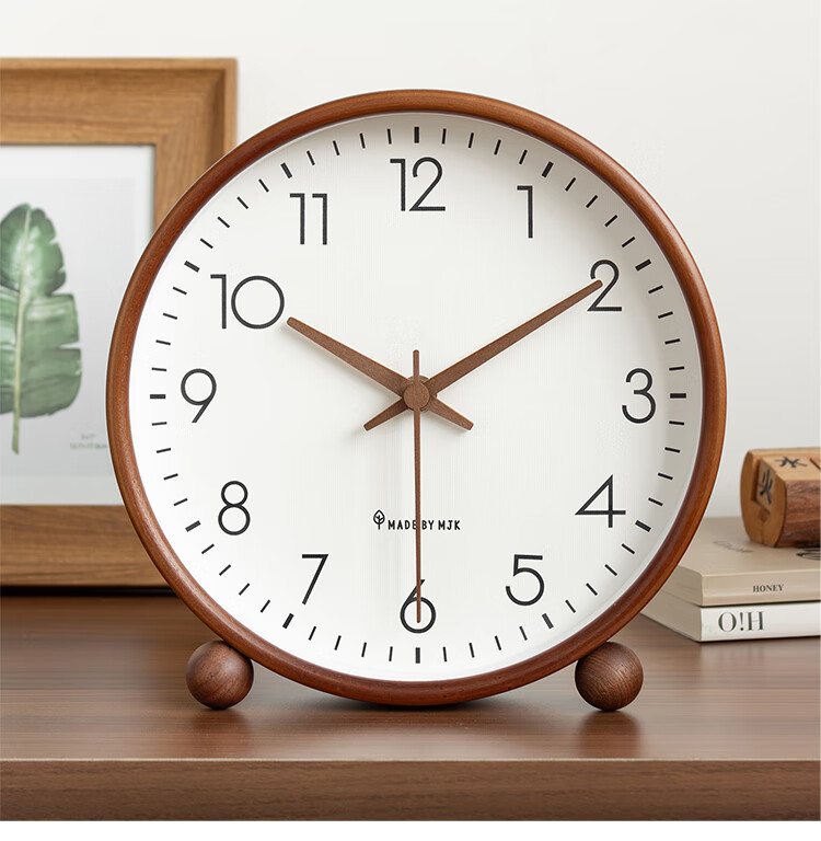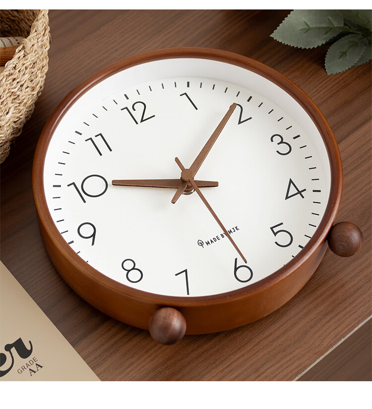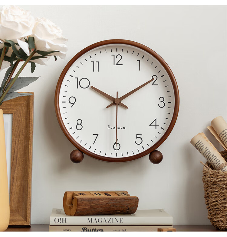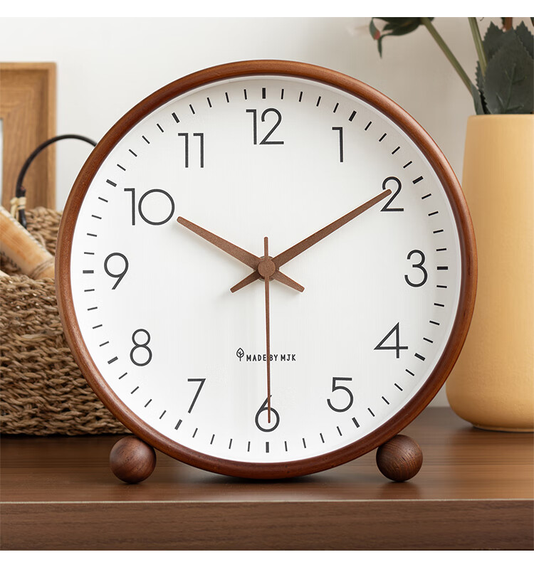MJK mid-century style solid wood clock for home living room 2025 new tabletop silent clock display desktop clock ornaments walnut color 8 inches diameter 22cm