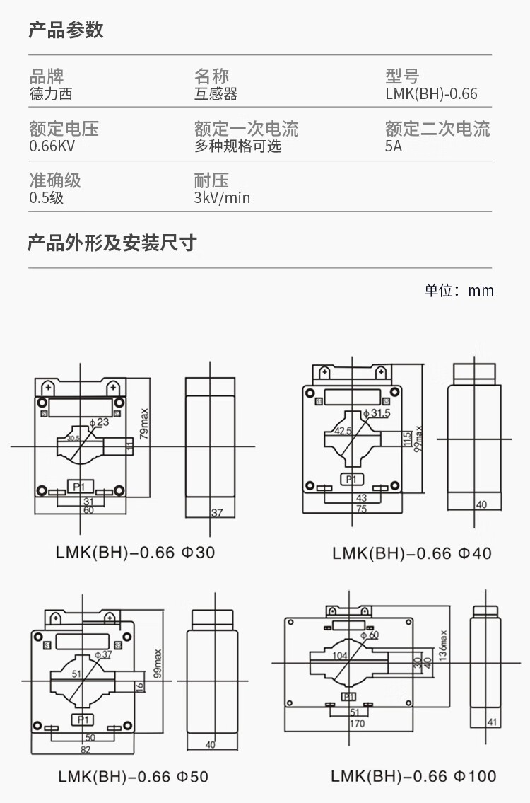 Delixi AC current transformer LMK-0.66 0.5 level BH current ratio 200/5 300/5 LMK-0.66 0.5 level 50/5 3 turns 30 aperture