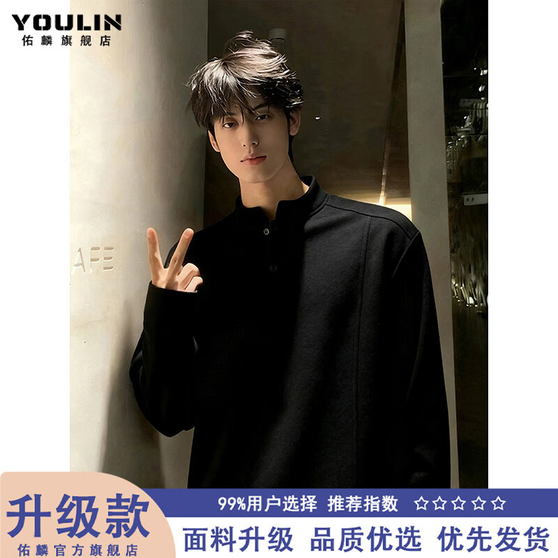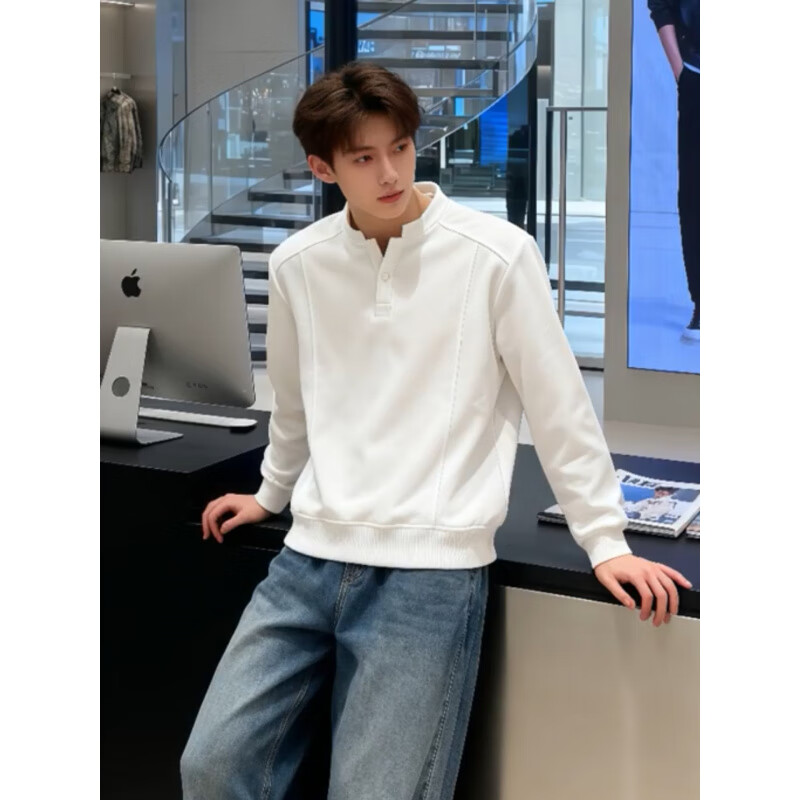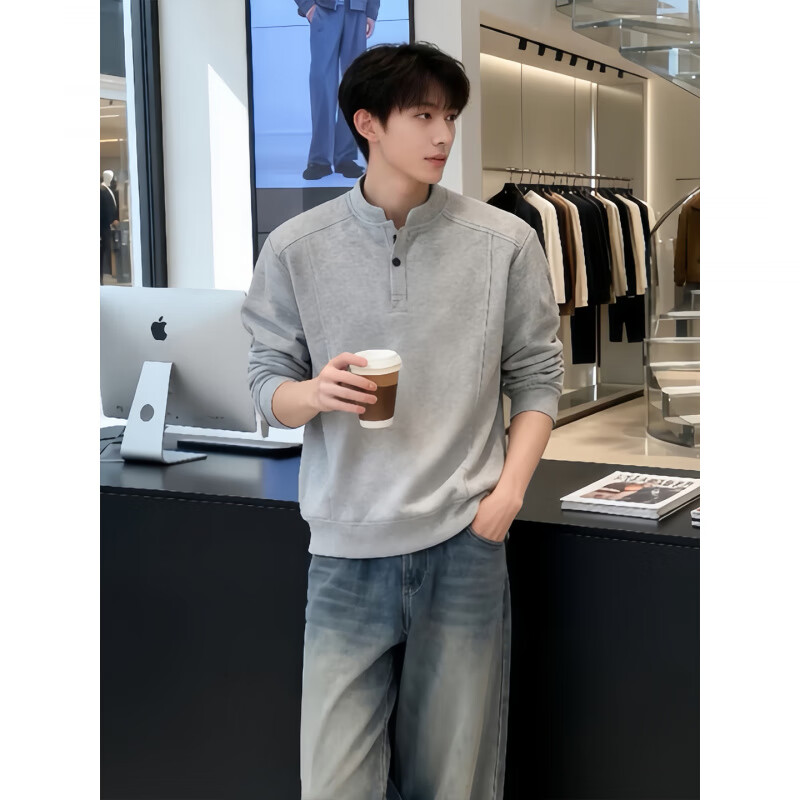 Maorong Warm Autumn American Henry Collar Right Shoulder Sweatshirt Men's Autumn and Winter Heavy Deconstructed Long Sleeve Polo Shirt Cleanfit Inside Gray Upgraded M