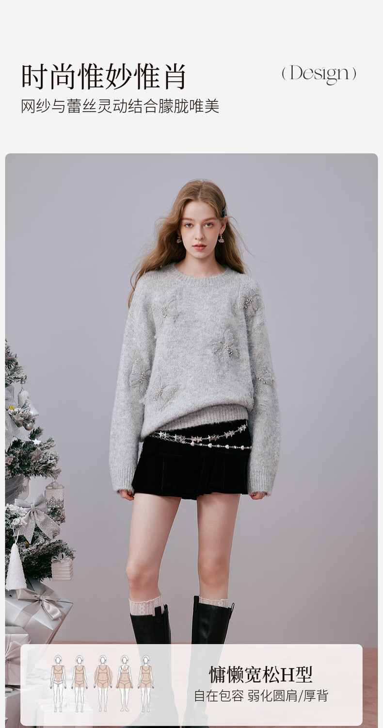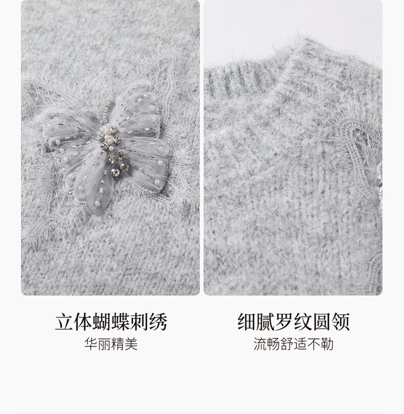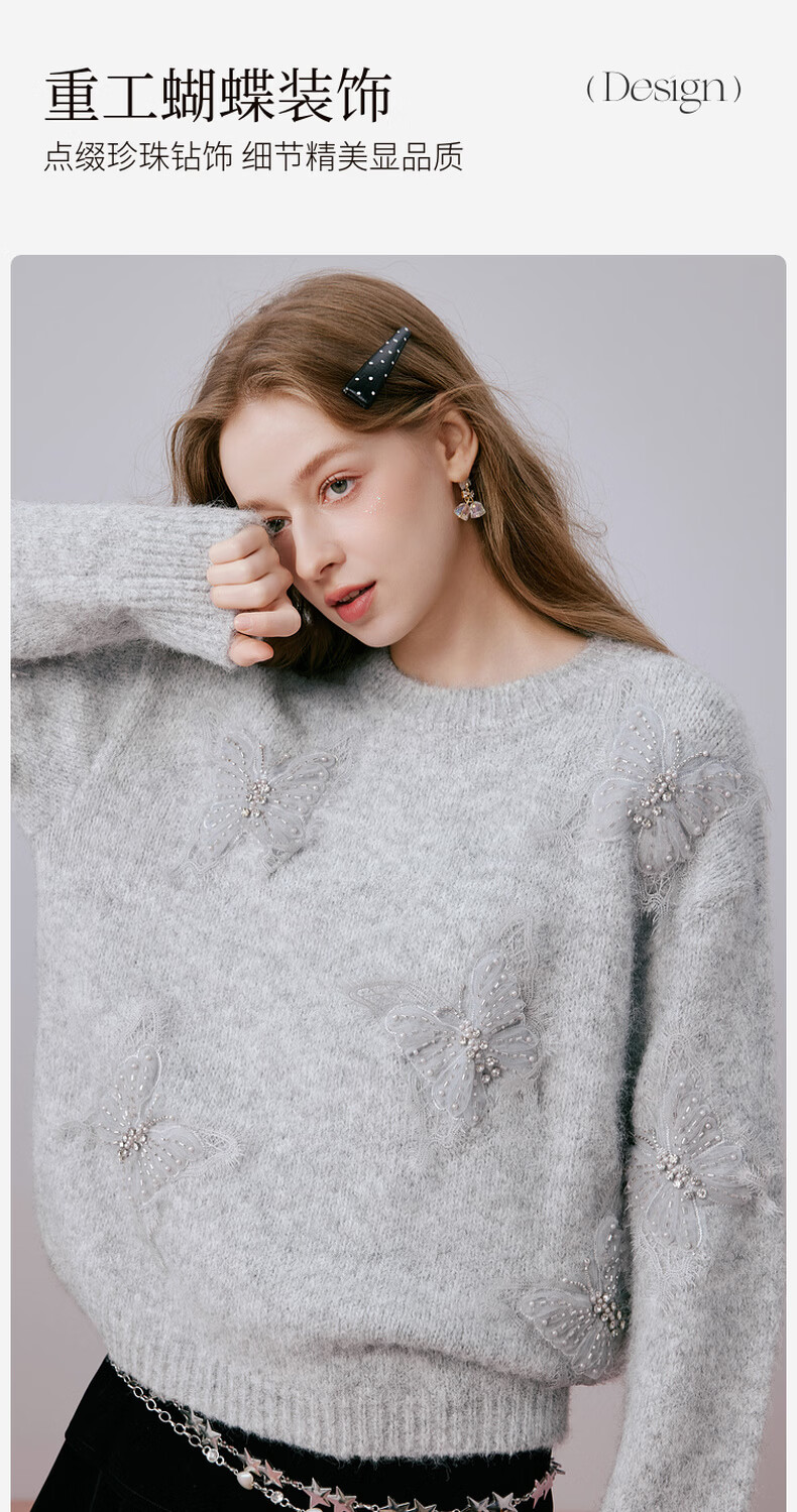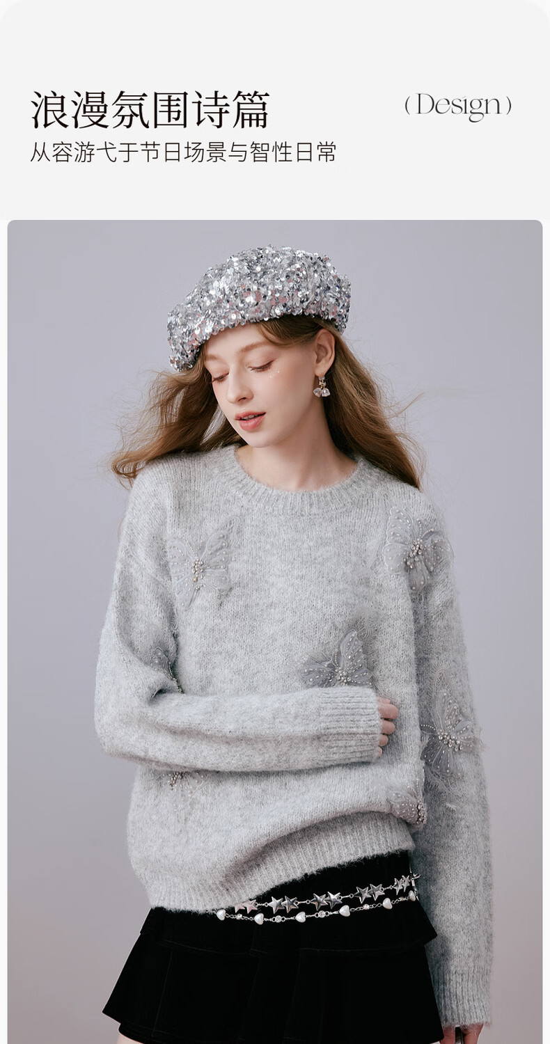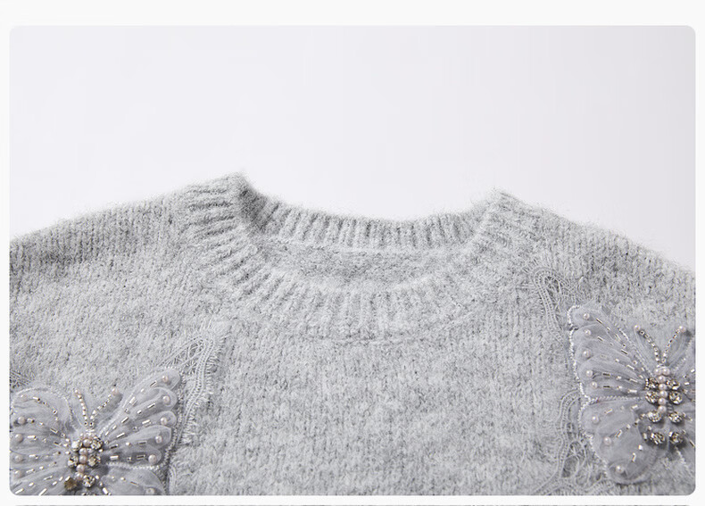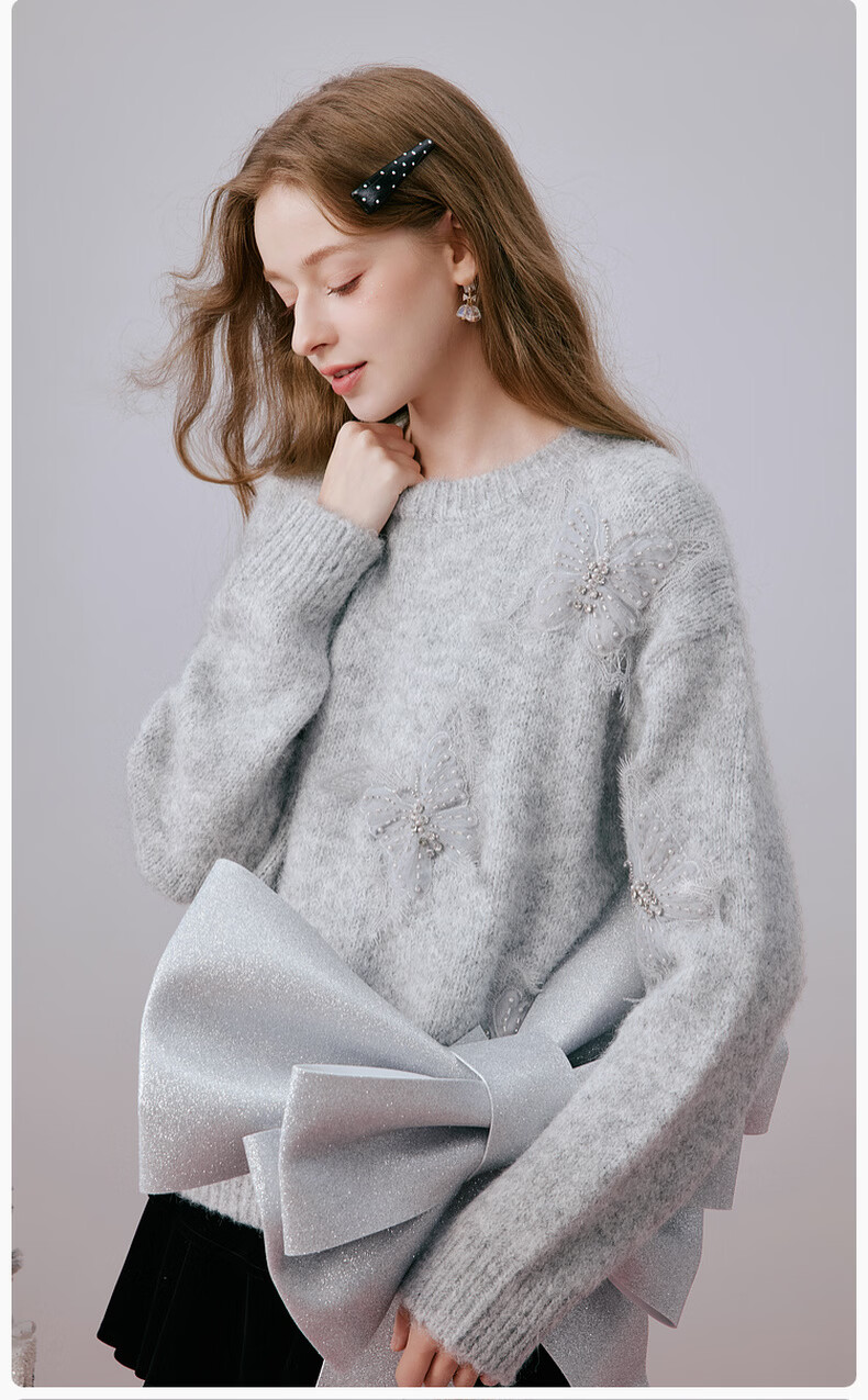 Xiangying Christmas atmosphere butterfly sweater for women 2026 spring new heavy industry embroidery lazy style gray sweater light gray top S 155/80A/85-95Jin Jin equals 0.5 kg
