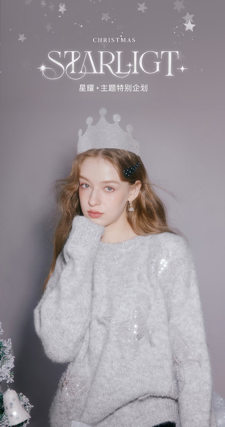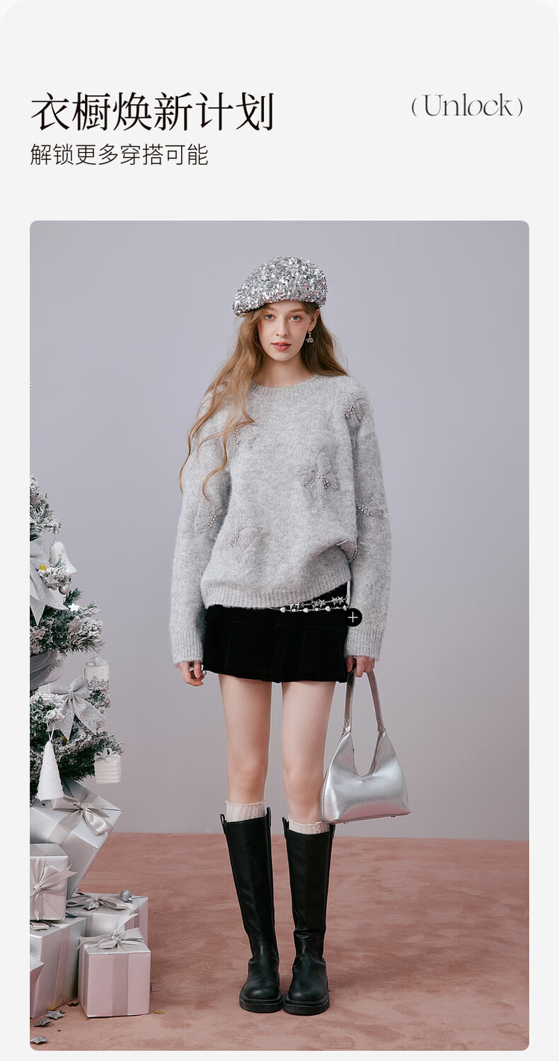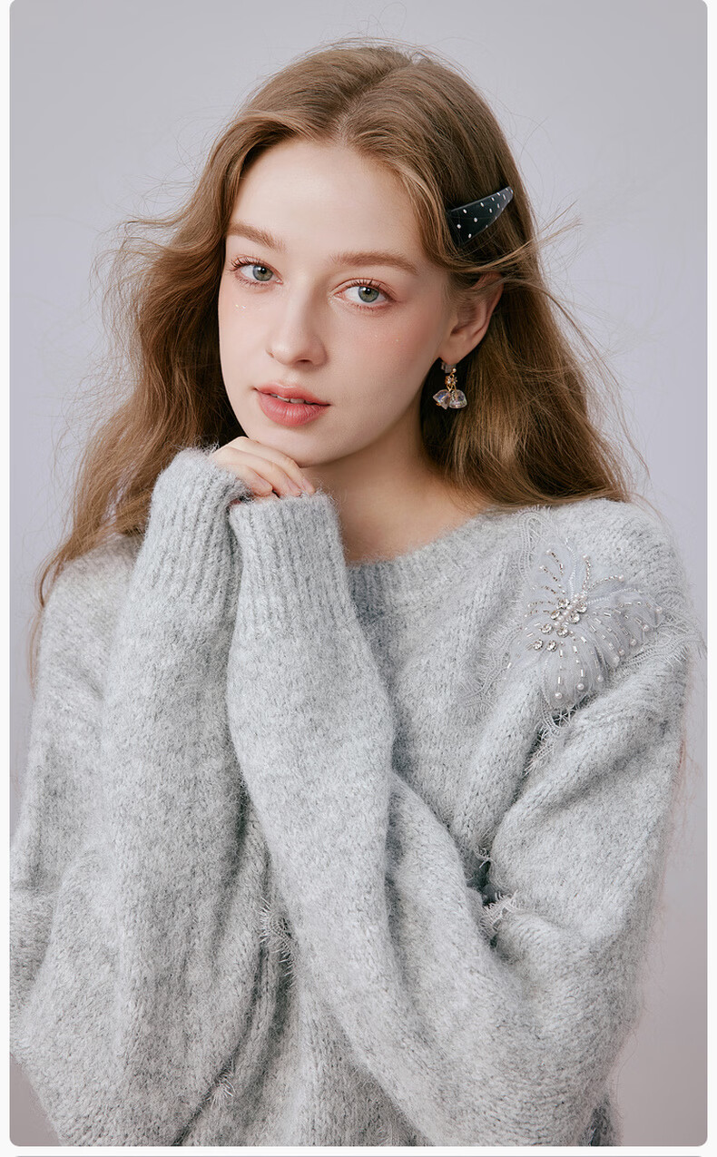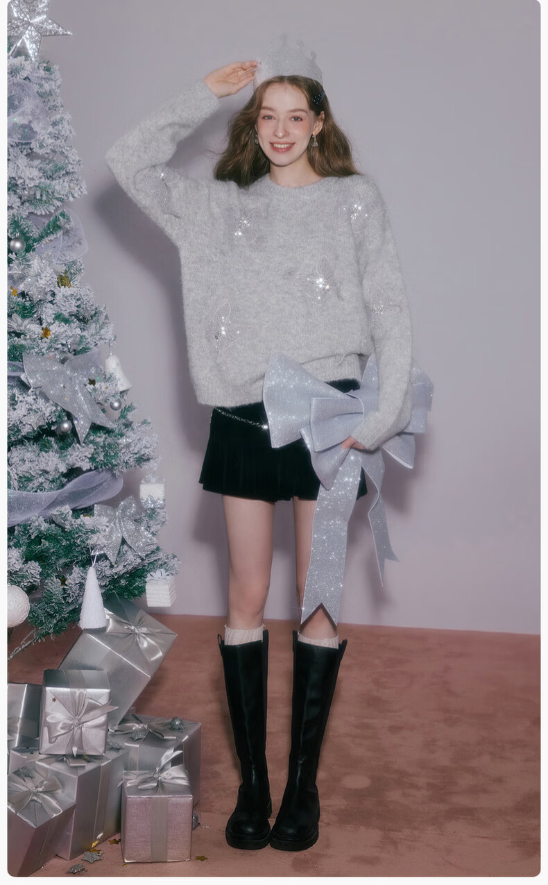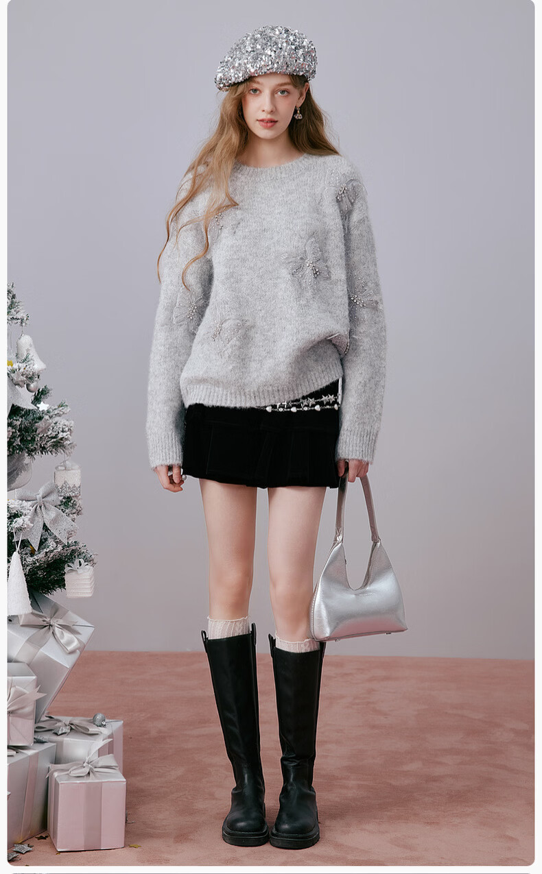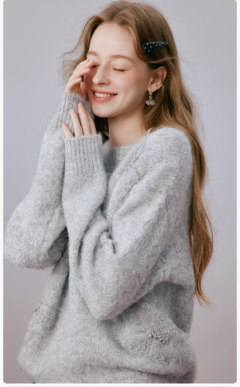 Xiangying Christmas atmosphere butterfly sweater for women 2026 spring new heavy industry embroidery lazy style gray sweater light gray top S 155/80A/85-95Jin Jin equals 0.5 kg