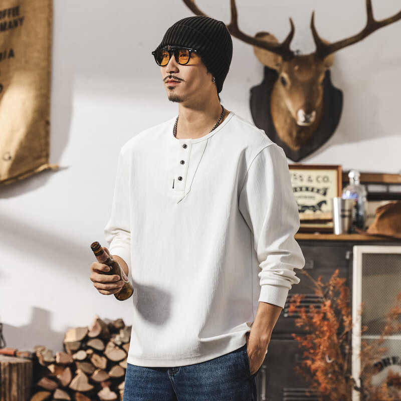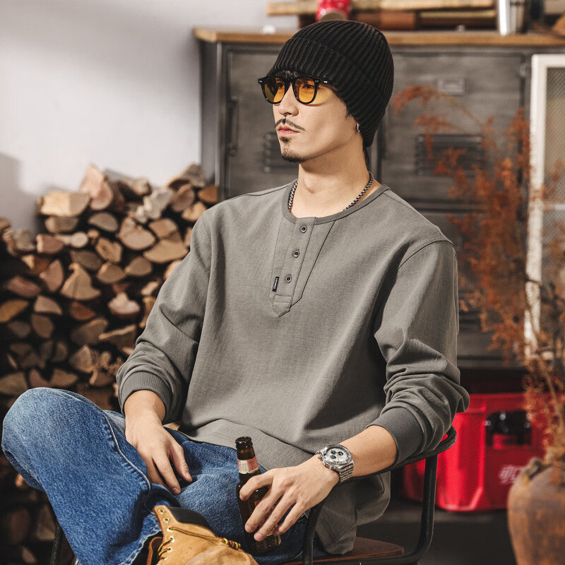 Maorong Warm Autumn American retro Henry collar Polo shirt men's long-sleeved autumn new tough guy T-shirt men's loose black hit black M _Suitable for 100-125Jin Jin equals 0.5 kg