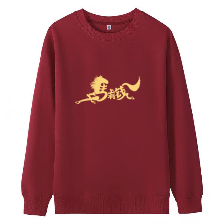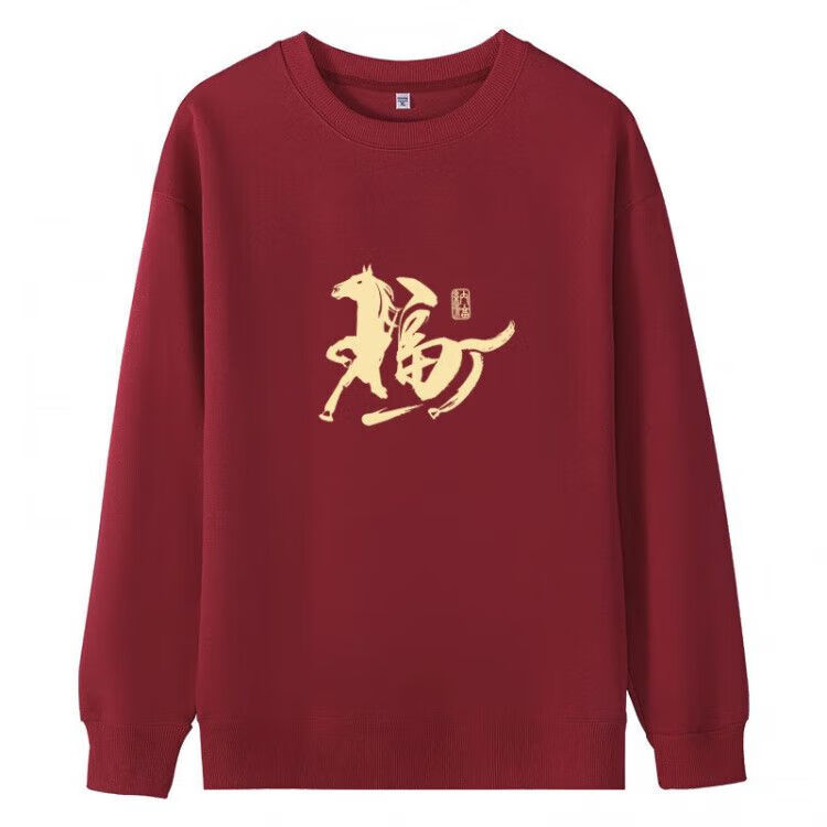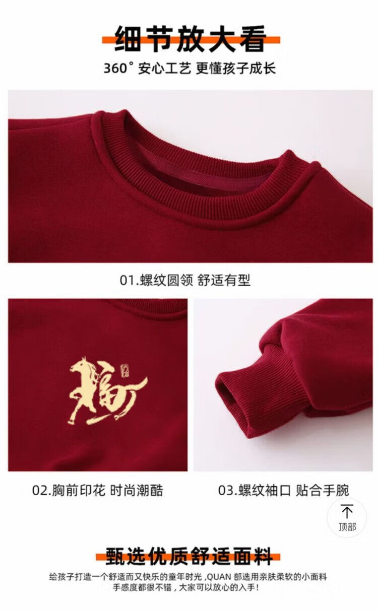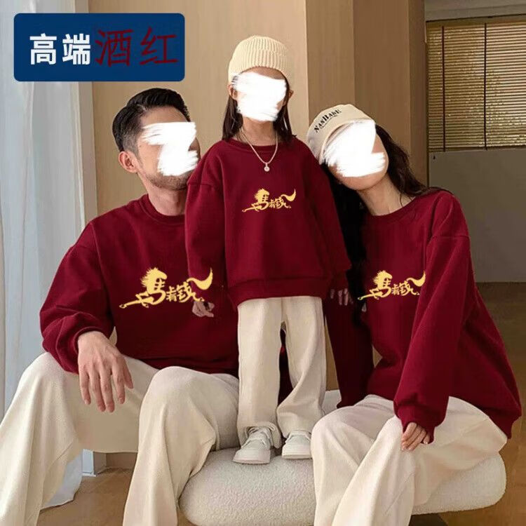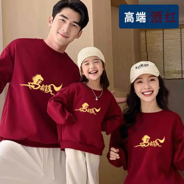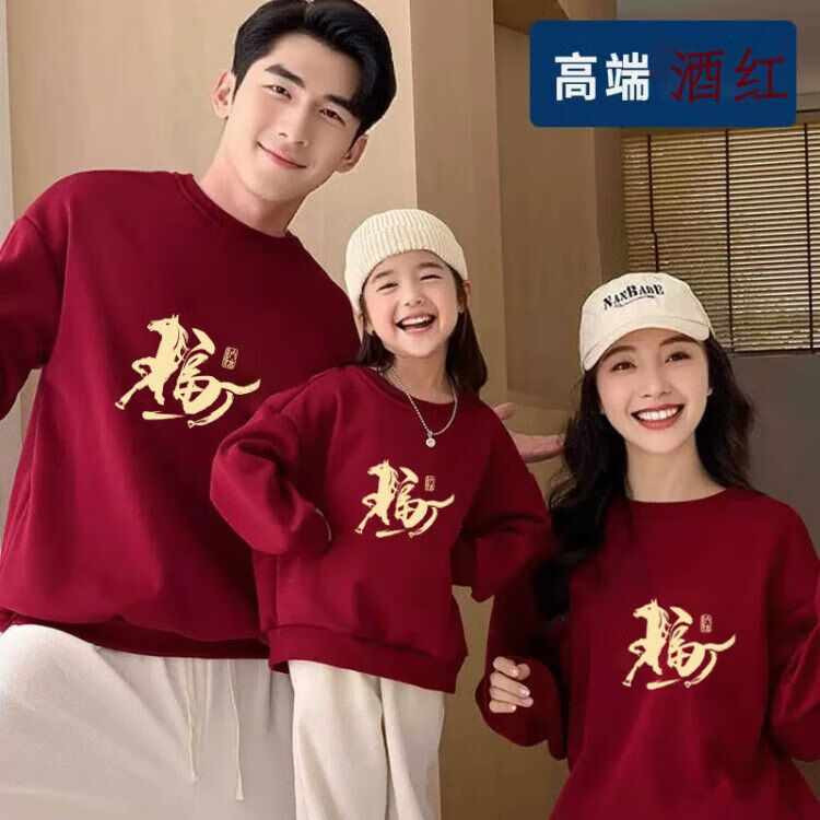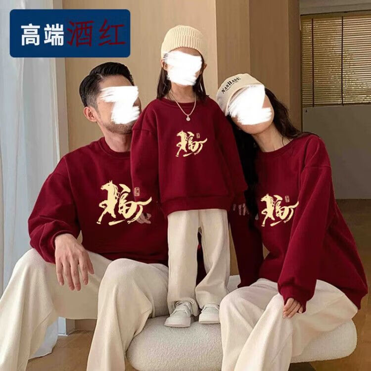 Yihua Year of the Horse parent-child outfits for a family of three and four burgundy 2026 zodiac year autumn and winter clothing four festive New Year's greetings clothes round neck burgundy plus velvet Nafu 170 M 90-120Jin Jin equals 0.5 kg 9603|9600