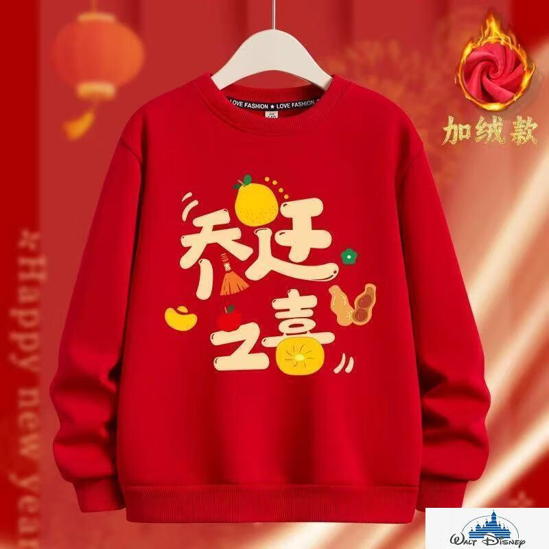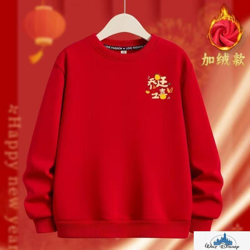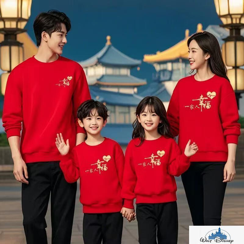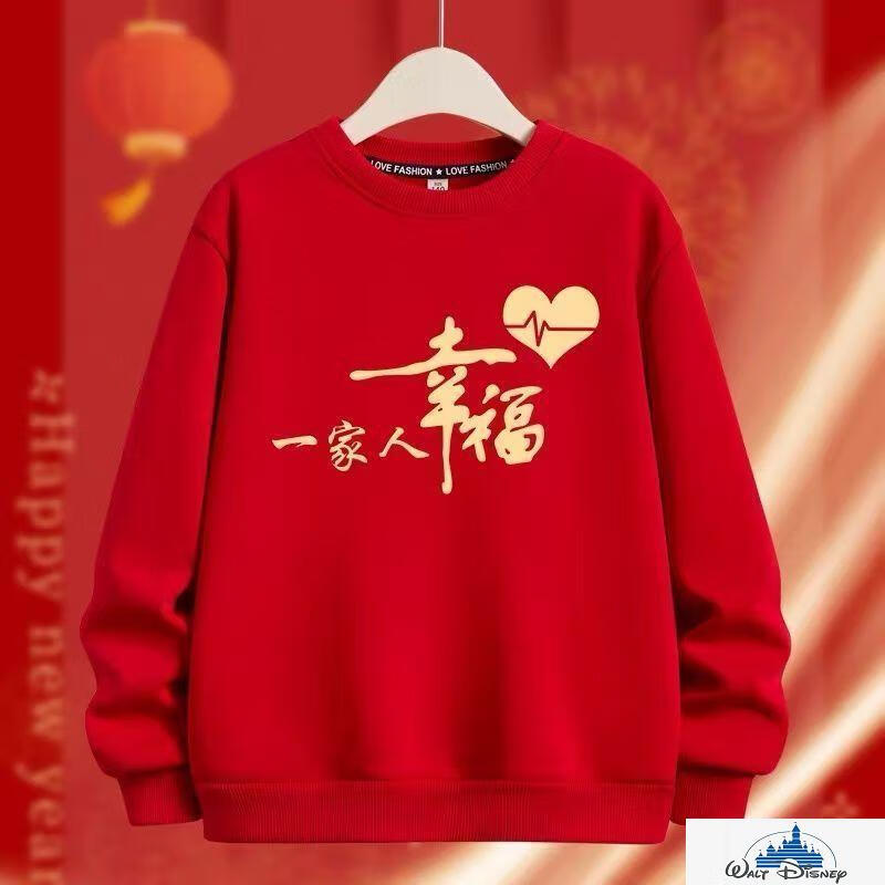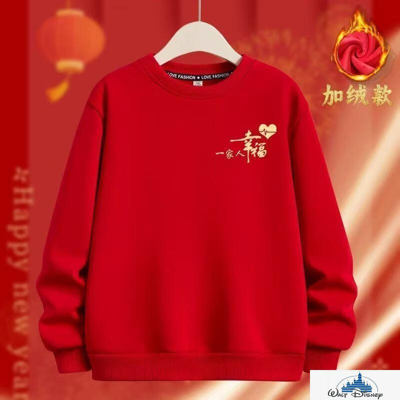 Disney (Disney) 2026 Year of the Horse parent-child outfits for a family of three and four, round-neck sweatshirts for a happy family, festive tops, red, chest label, happy family, plus velvet sweatshirt 120, recommended 35-40 Jin Jin equals 0.5 kg