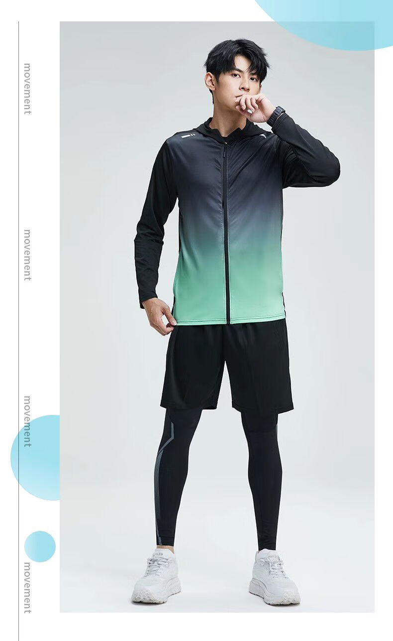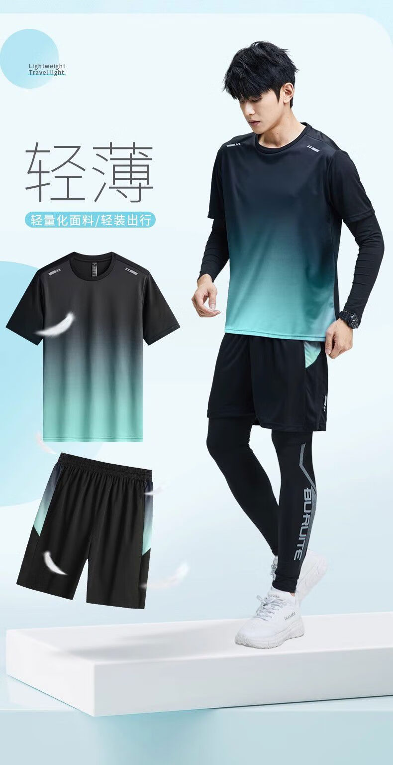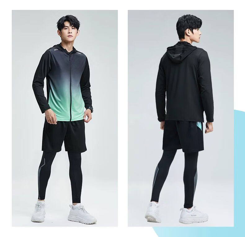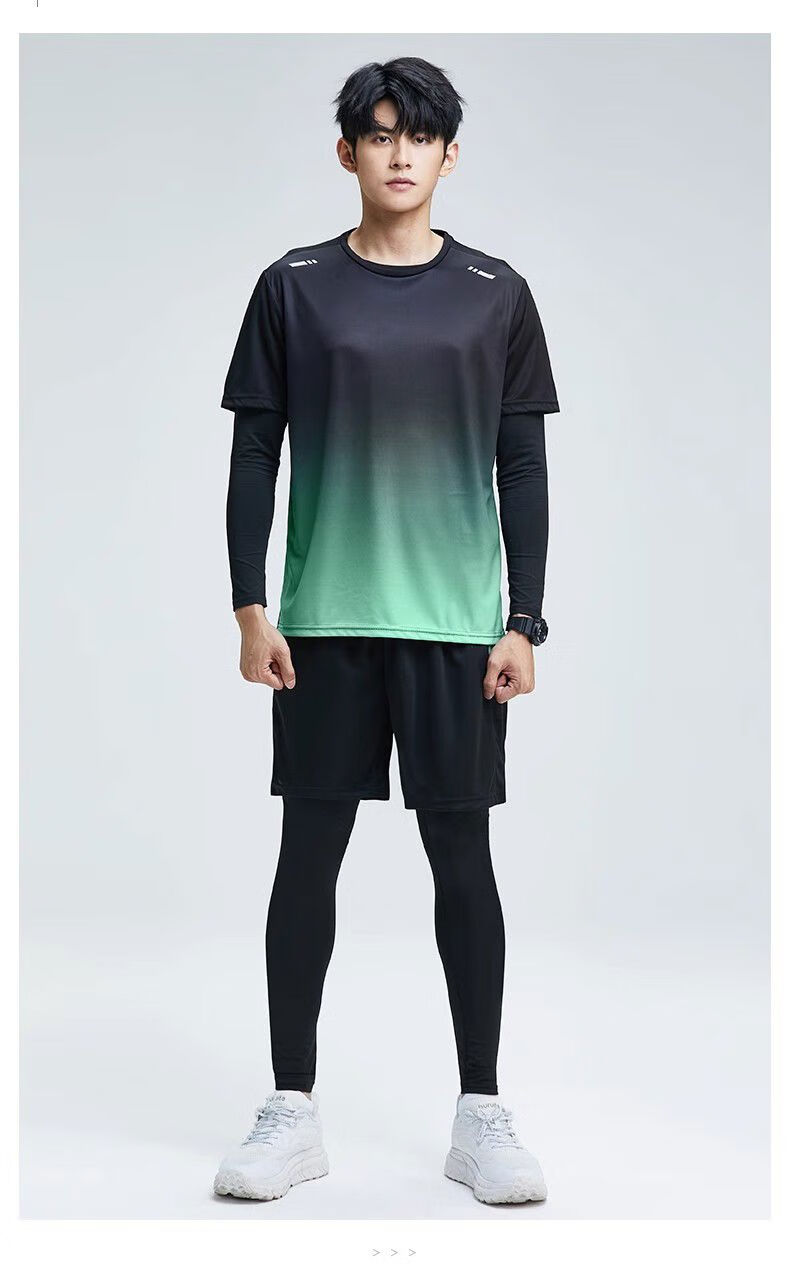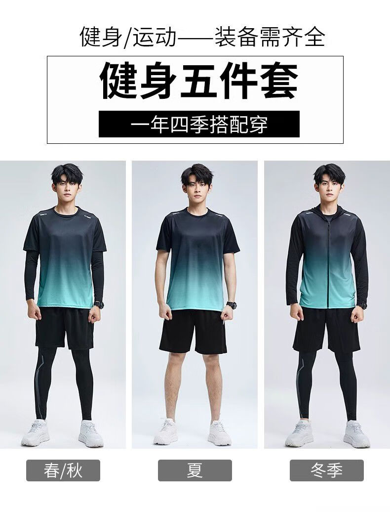 Summer mesh sports suit for men, running training, fitness, morning jogging, cycling clothes, tight-fitting quick-drying clothes, five-piece set, thin five-piece set - green L L
