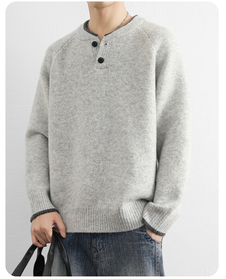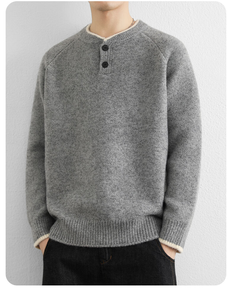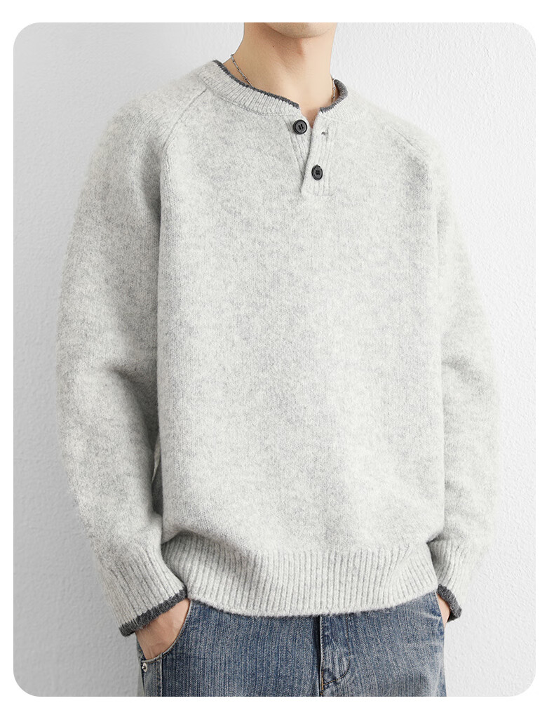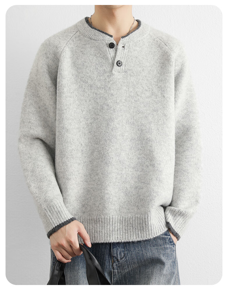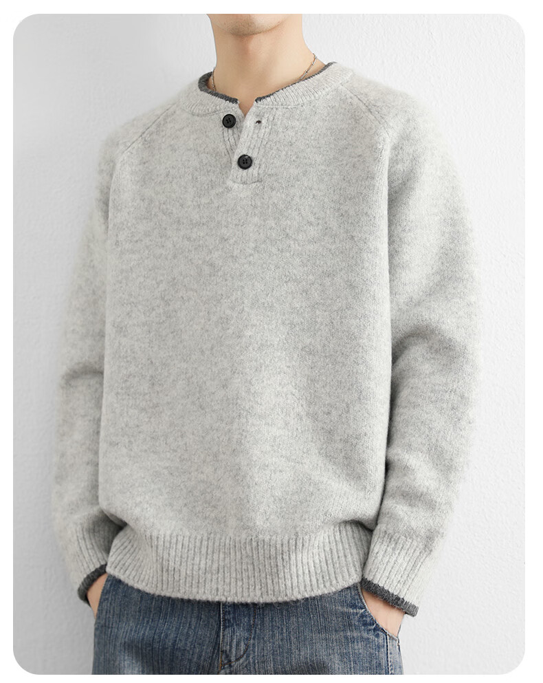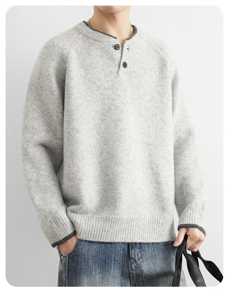MONTAGUT Wool Blended Henley Collar Retro Sweater Men's Winter New Thickened Warm Sweater with Pullover Top Light Gray L 120-140Jin Jin equals 0.5kg