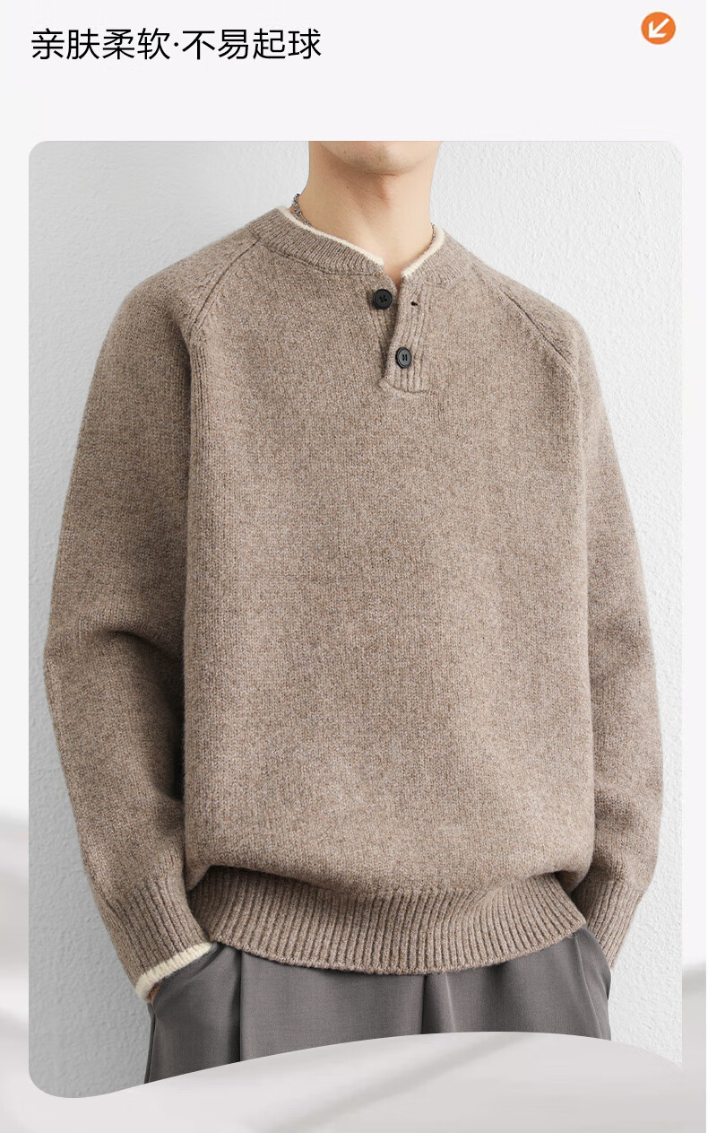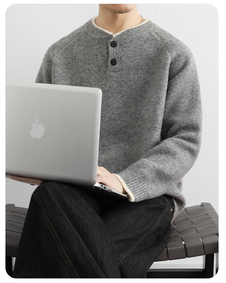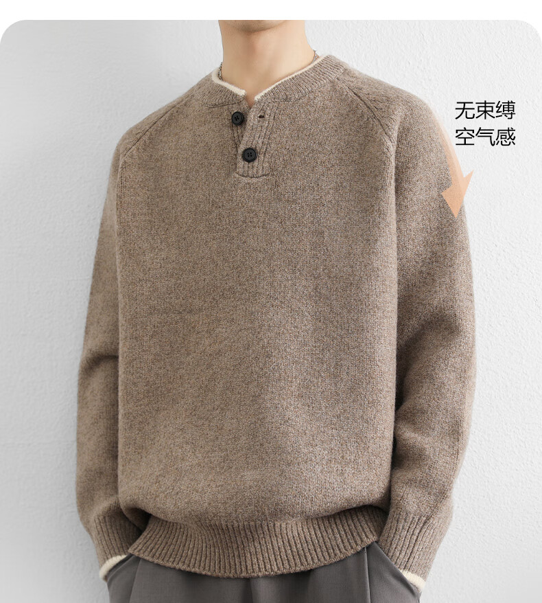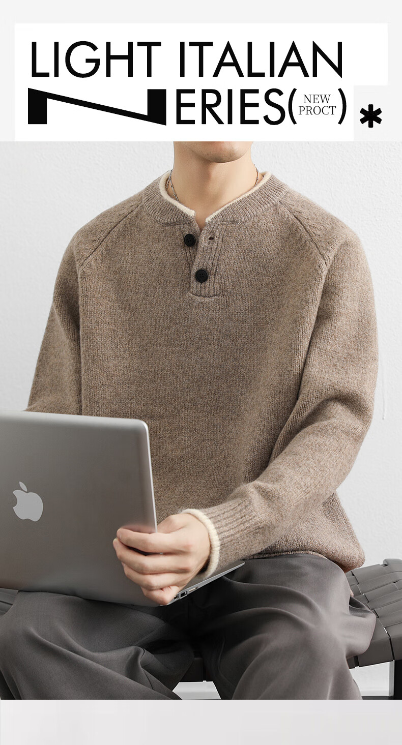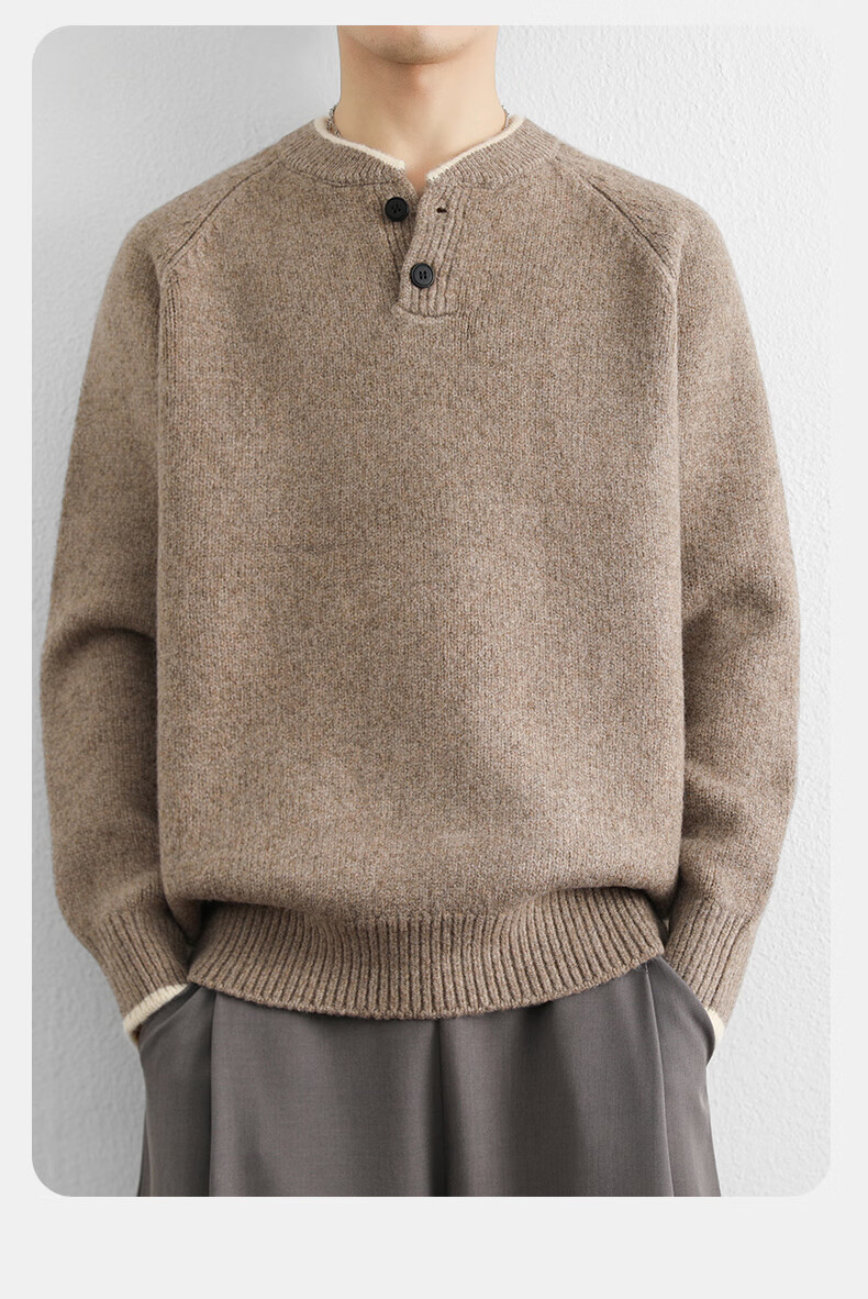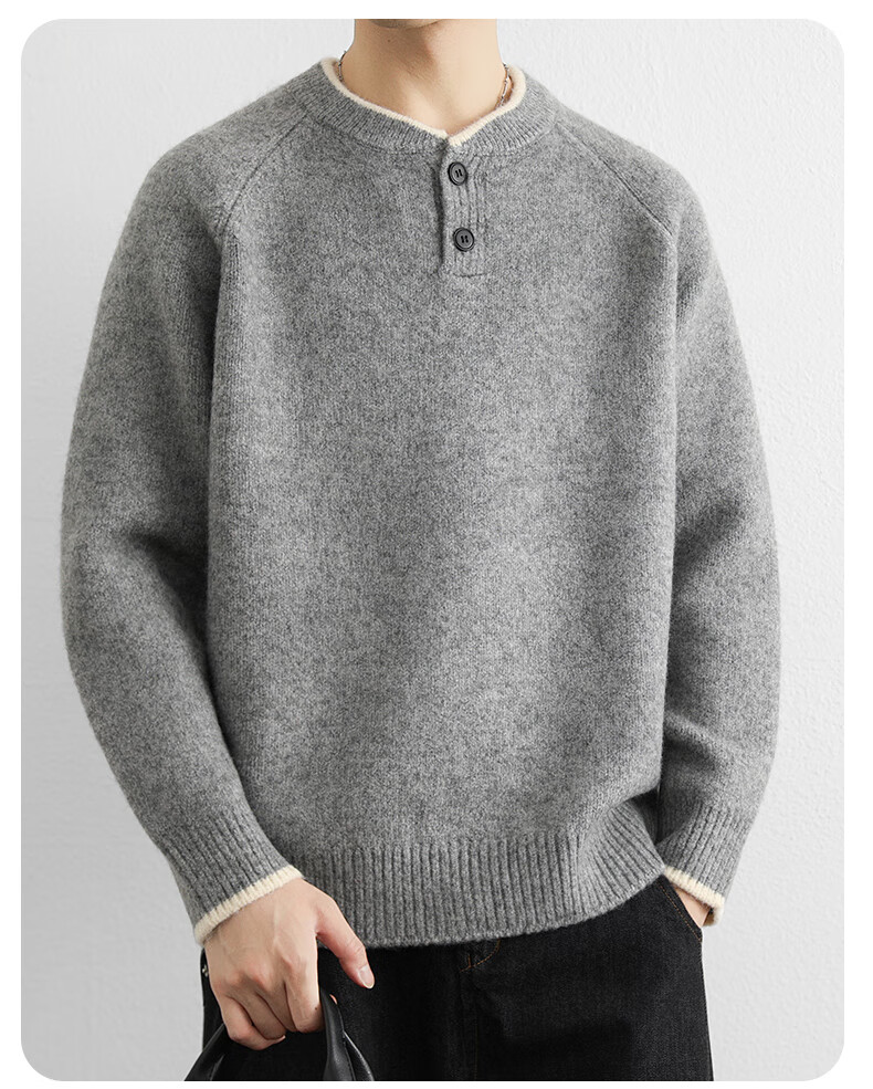 MONTAGUT Wool Blended Henley Collar Retro Sweater Men's Winter New Thickened Warm Sweater with Pullover Top Light Gray L 120-140Jin Jin equals 0.5kg