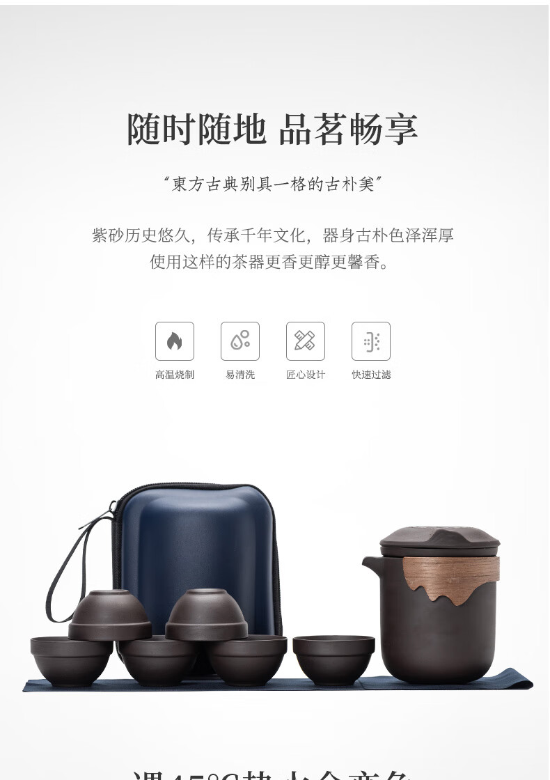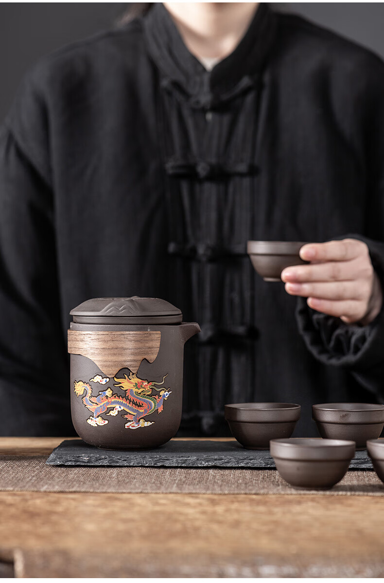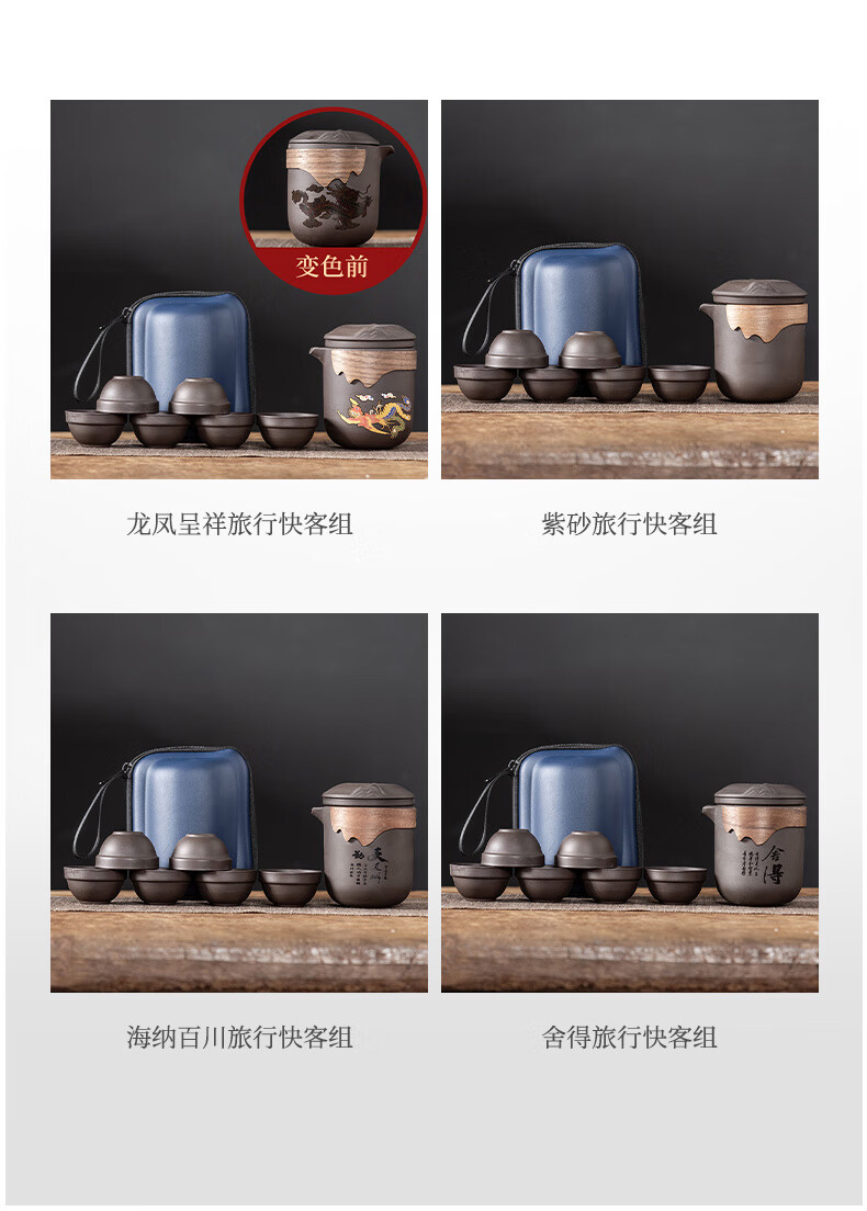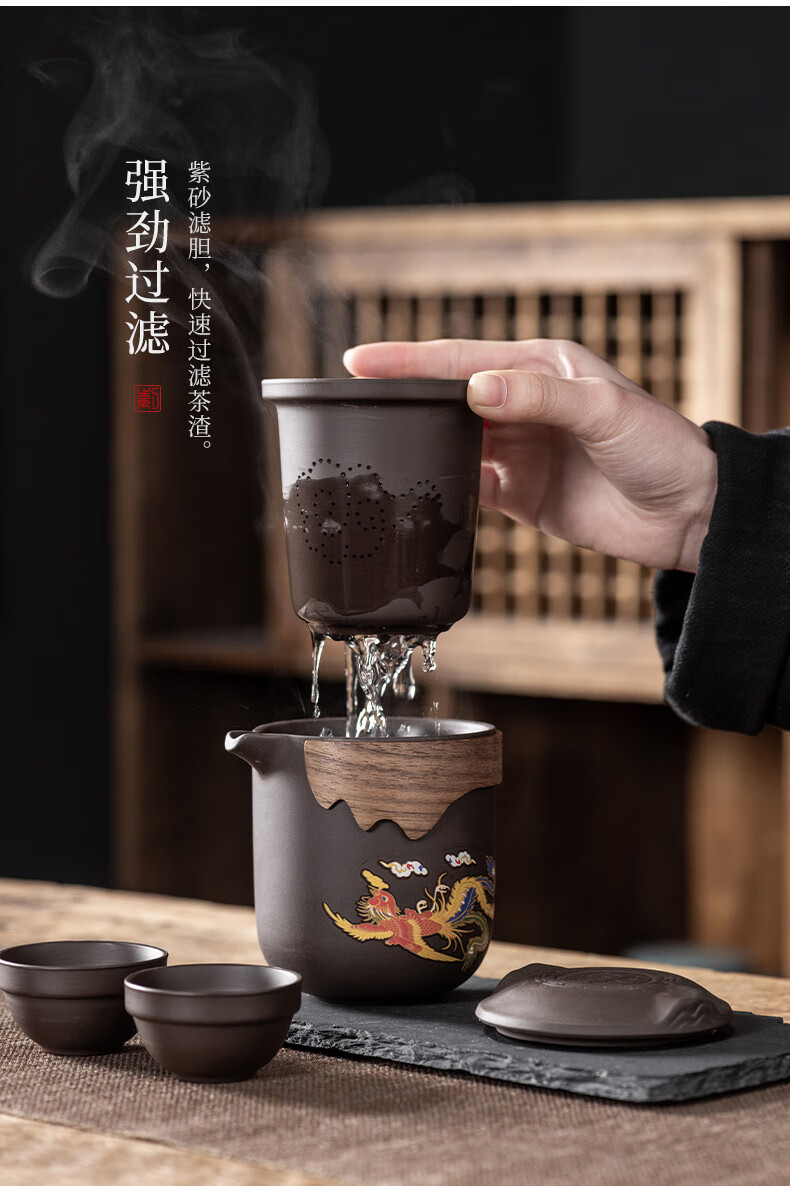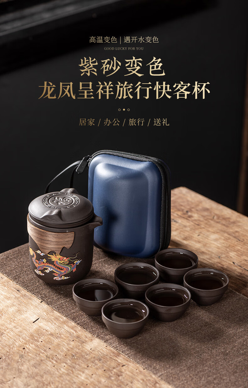 Purple sand color changing teapot travel tea set Kung Fu Kuai Ke tea light luxury portable cup tea water separation outdoor portable storage purple sand cat ears - color changing dragon and phoenix six cups + bag