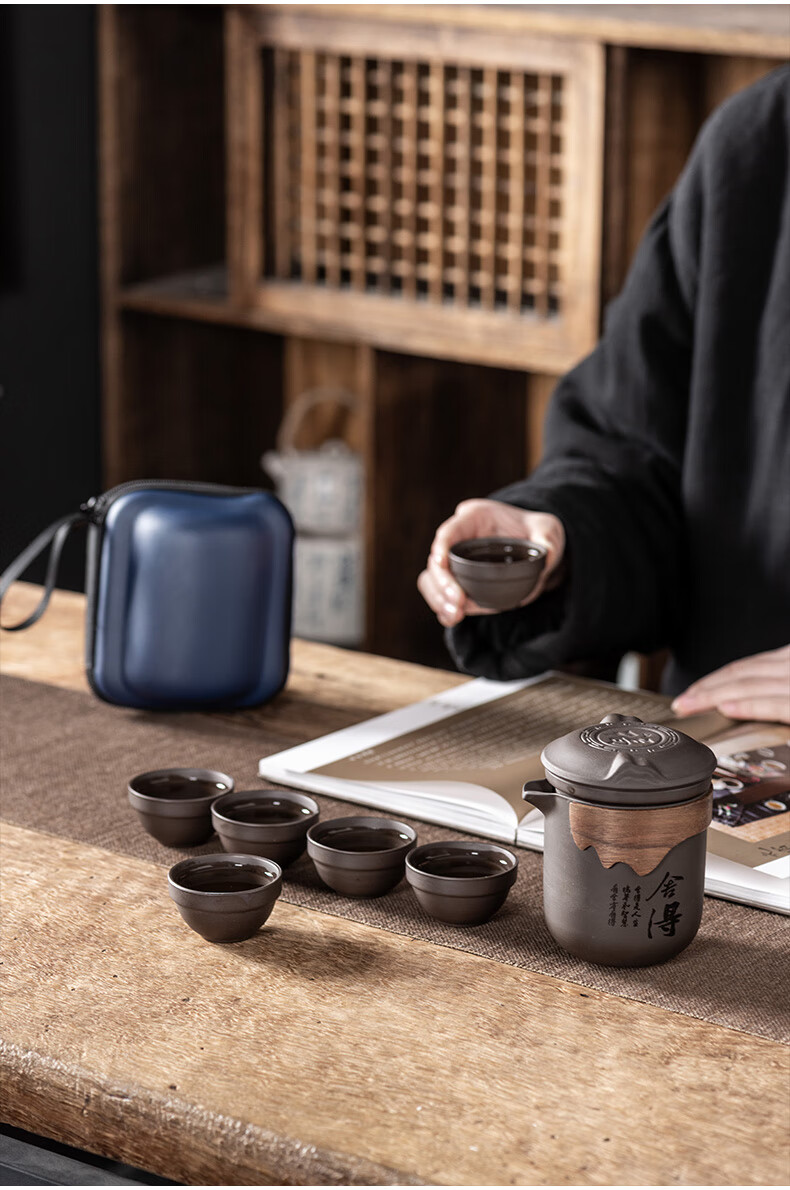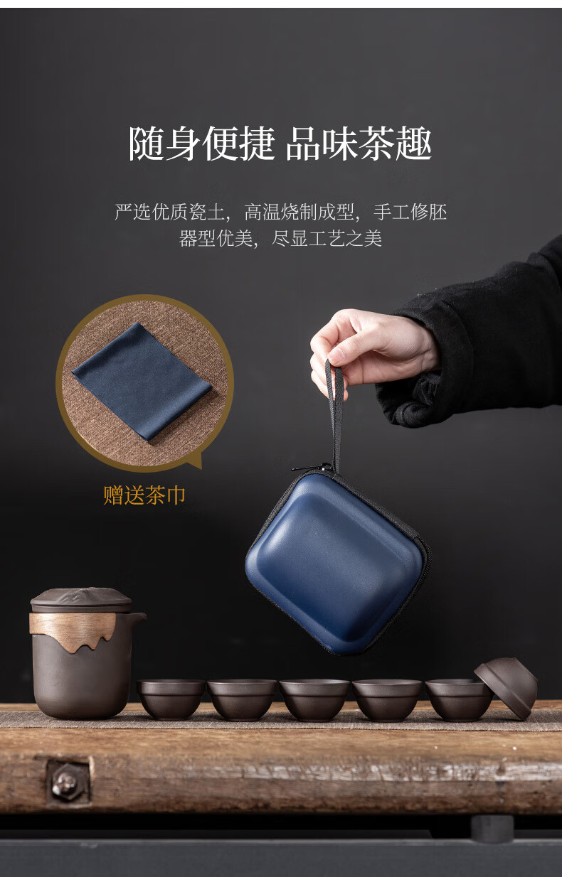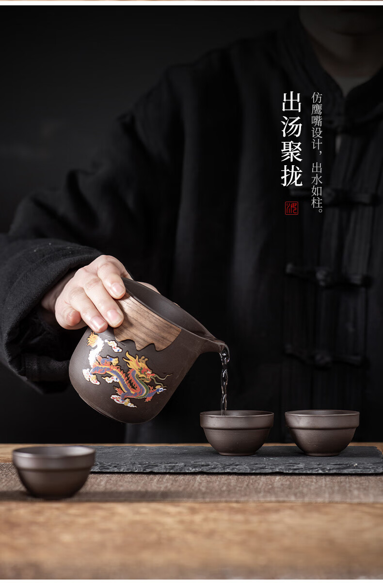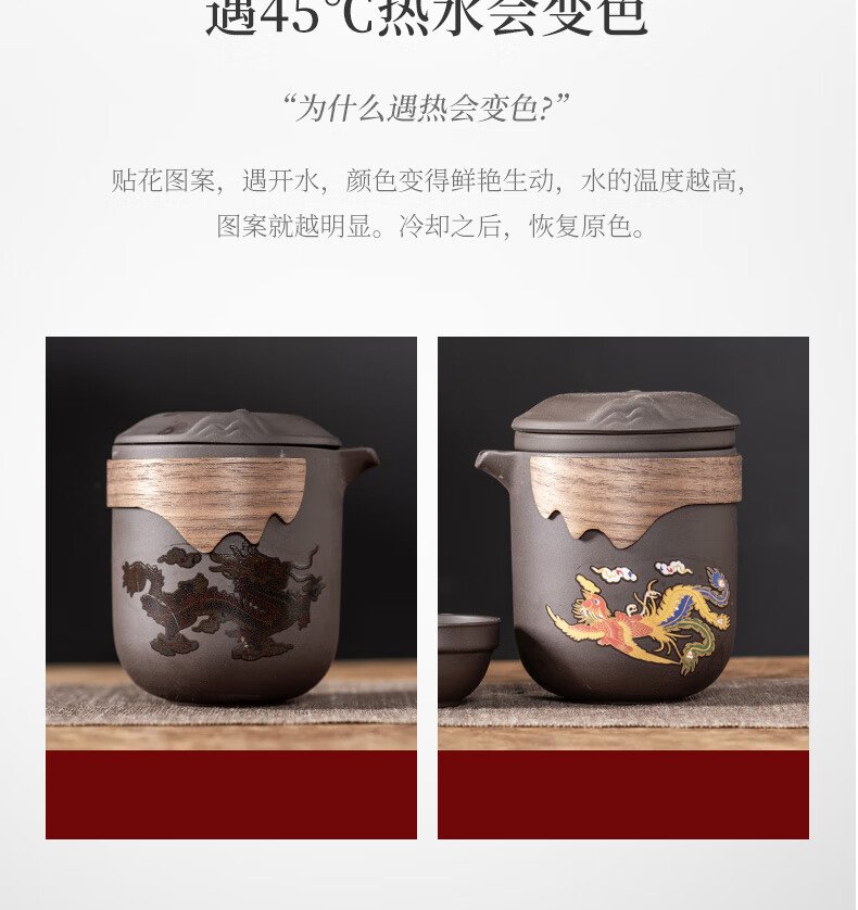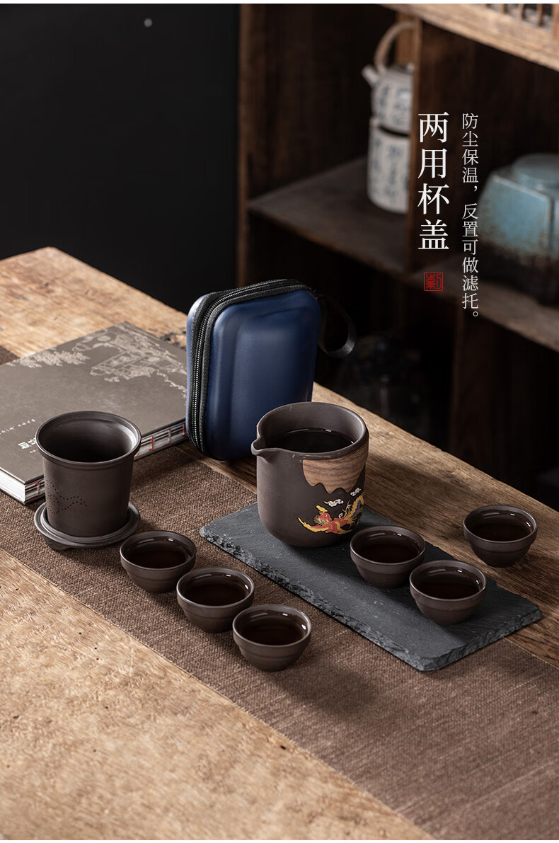 Purple sand color changing teapot travel tea set Kung Fu Kuai Ke tea light luxury portable cup tea water separation outdoor portable storage purple sand cat ears - color changing dragon and phoenix six cups + bag