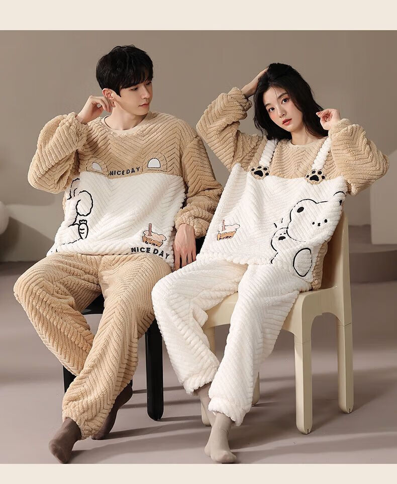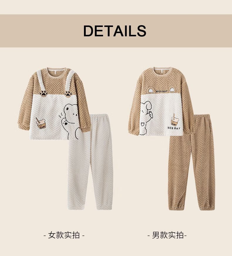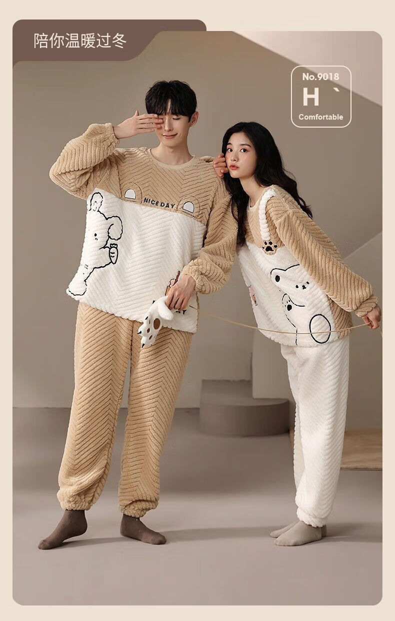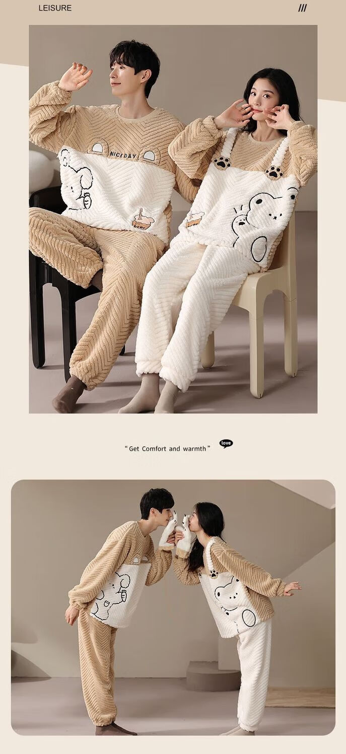 Victoria's style couple's pajamas winter coral velvet thickened and warm one man and one woman cartoon cute home wear outer suit LN9018 M women's + men's L