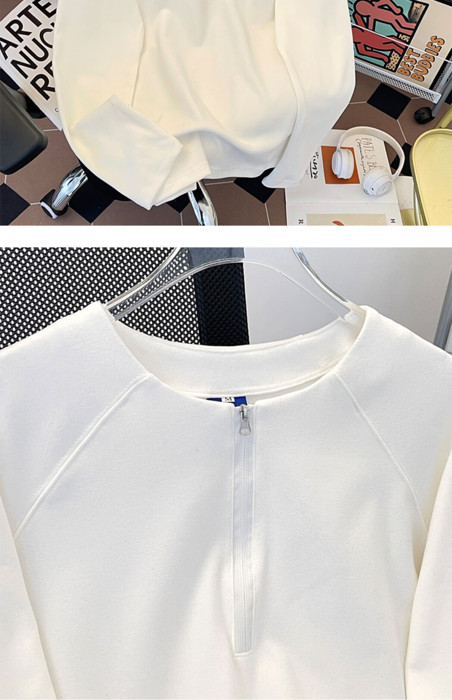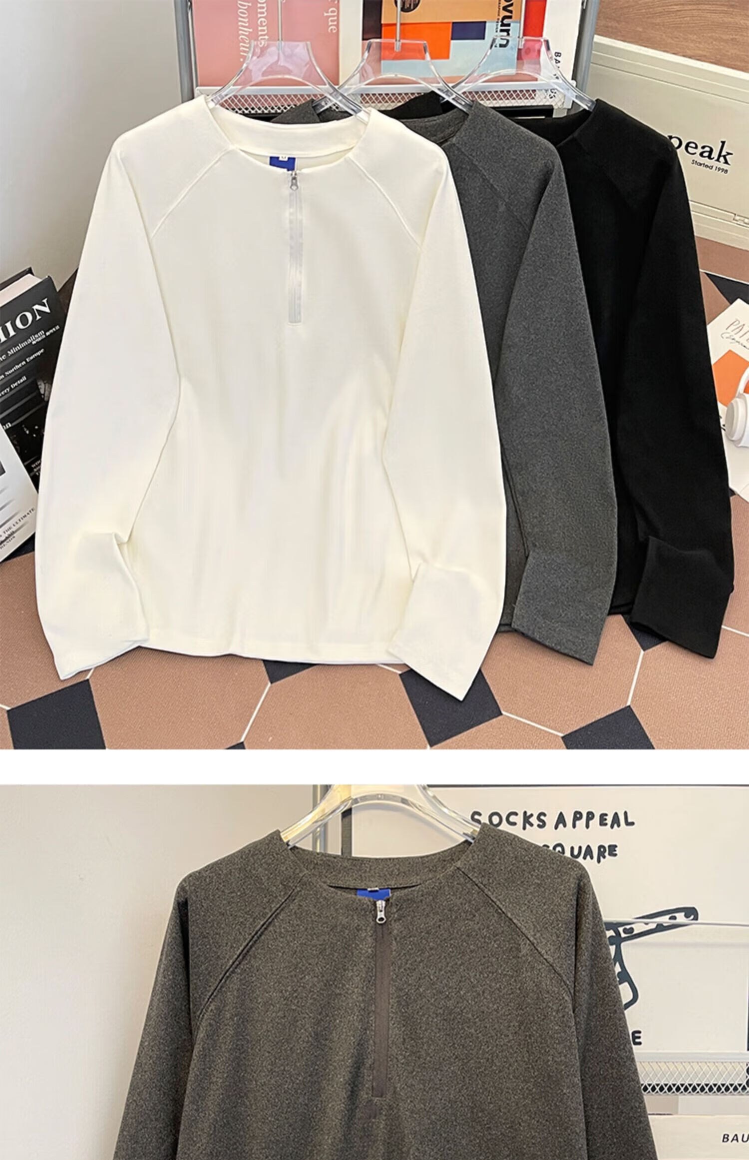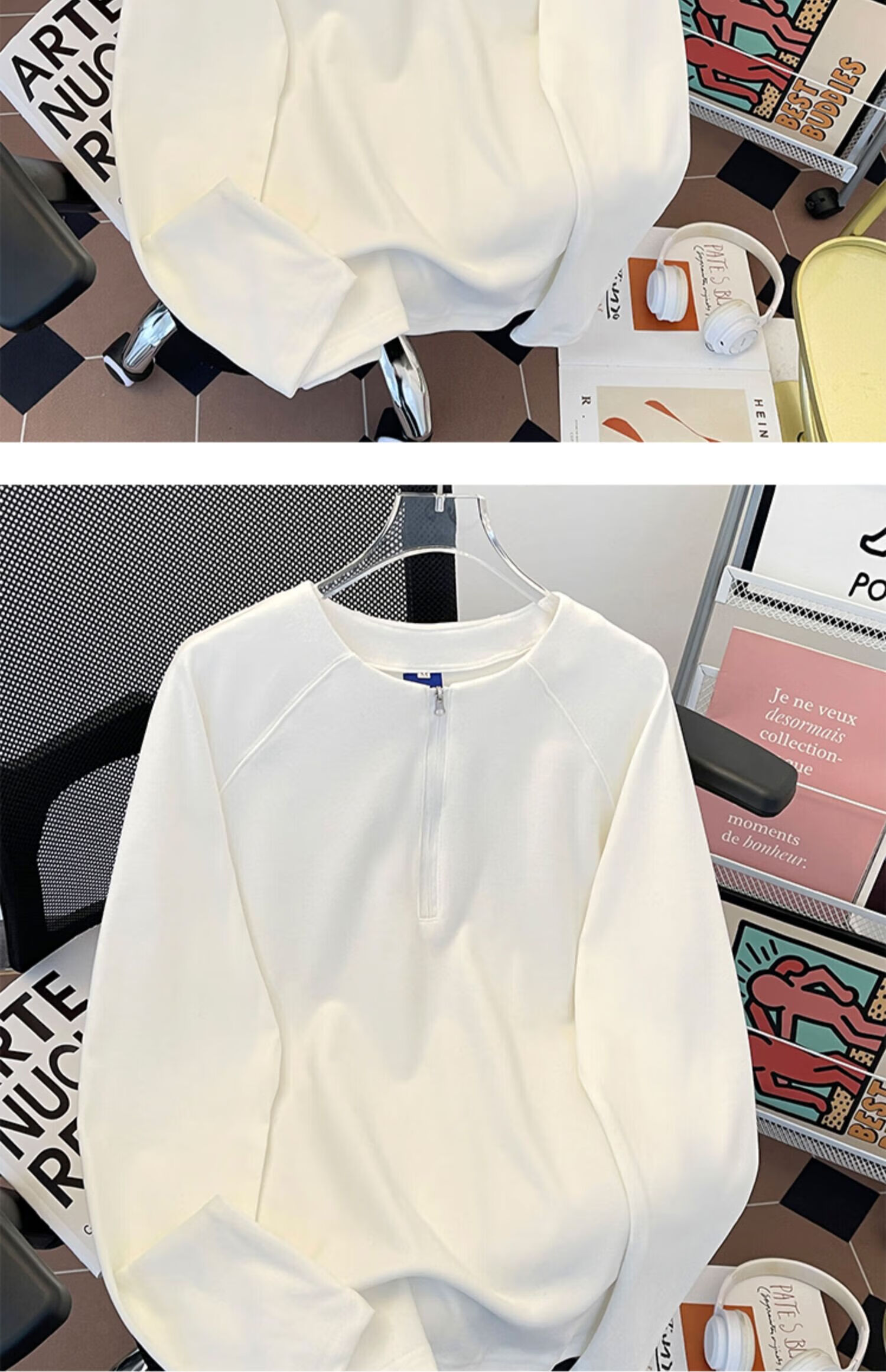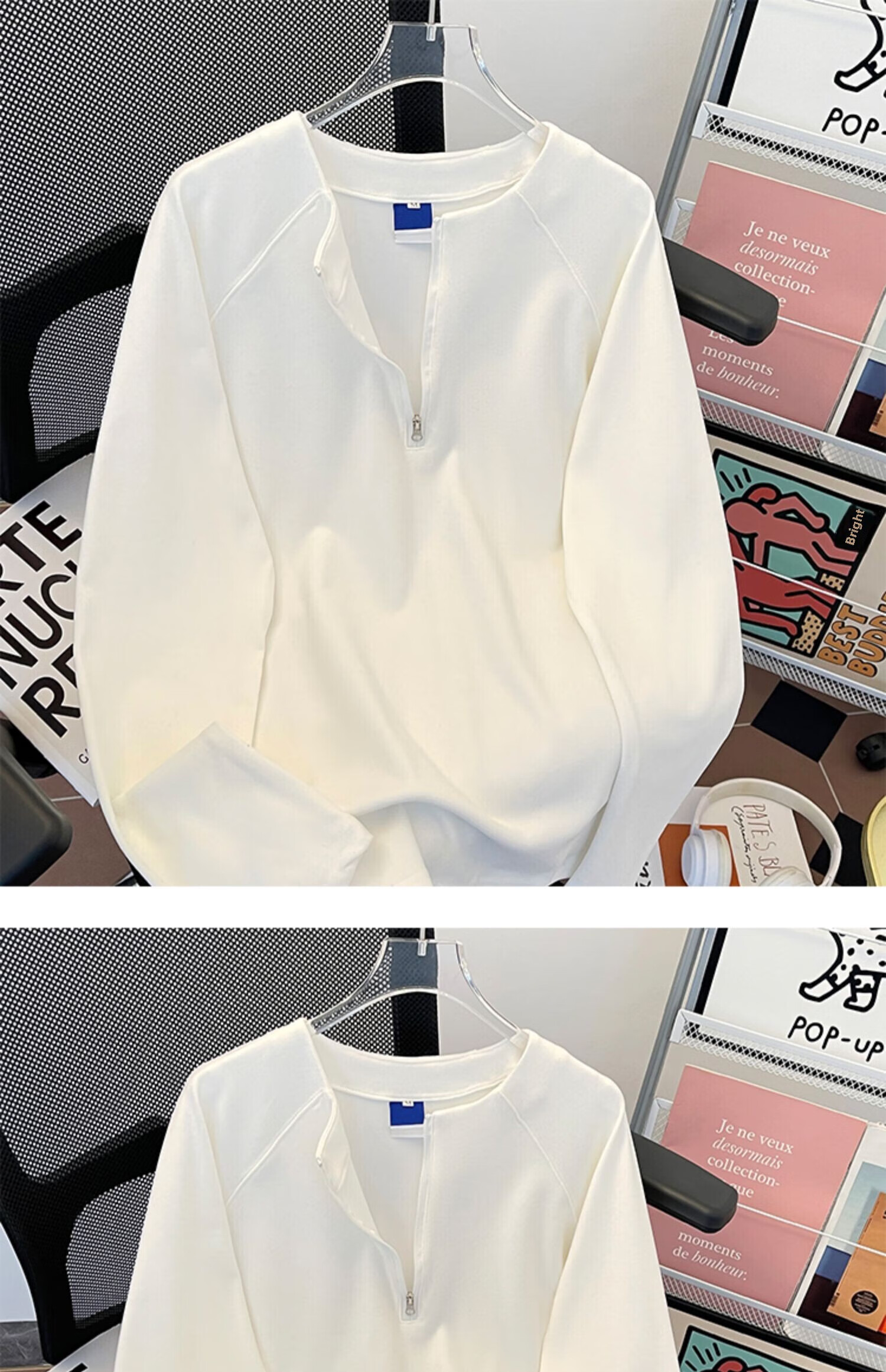 Jingyan Selects Spring and Autumn Henley Collar Sweatshirt Men's Loose Half-Zip Long Sleeve T-Shirt Trbottomyy American High White One Size M