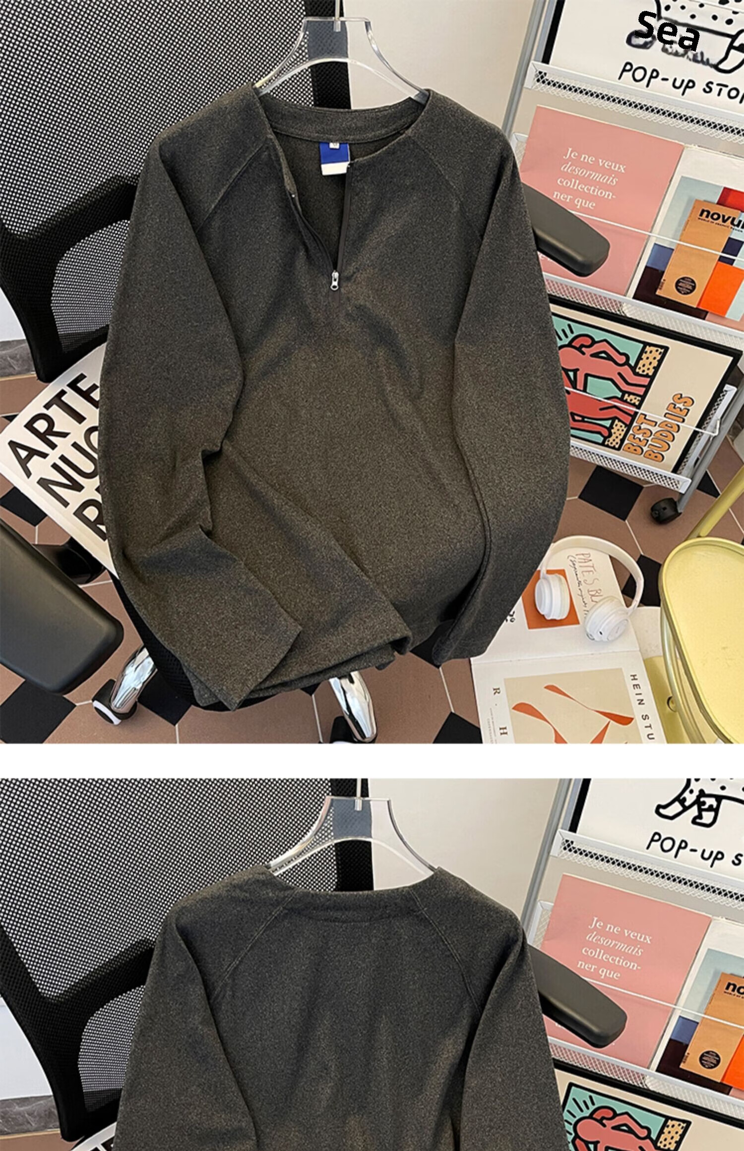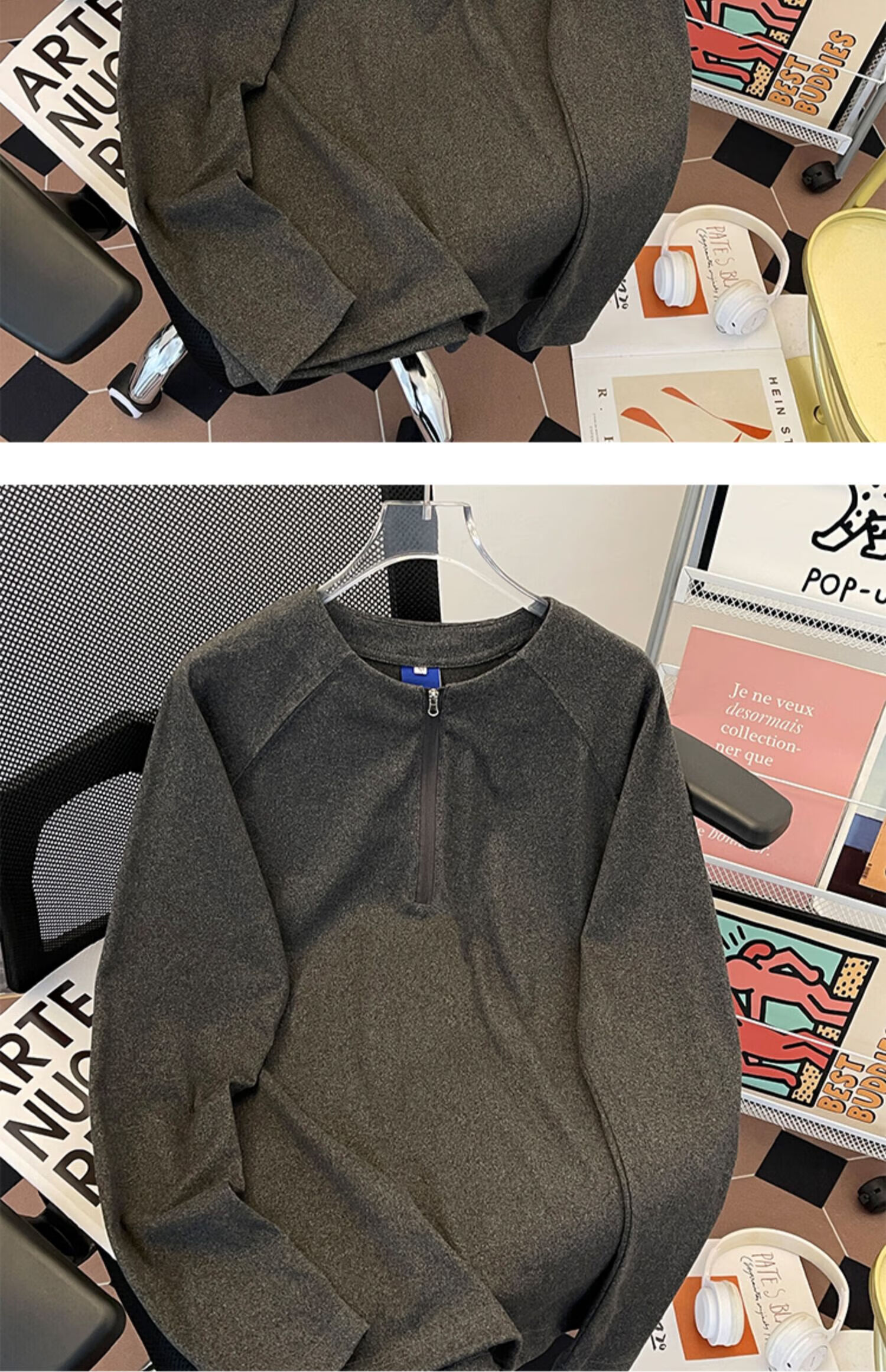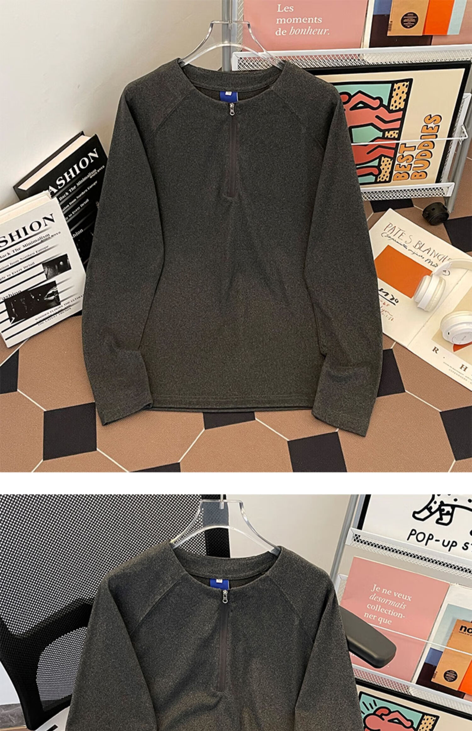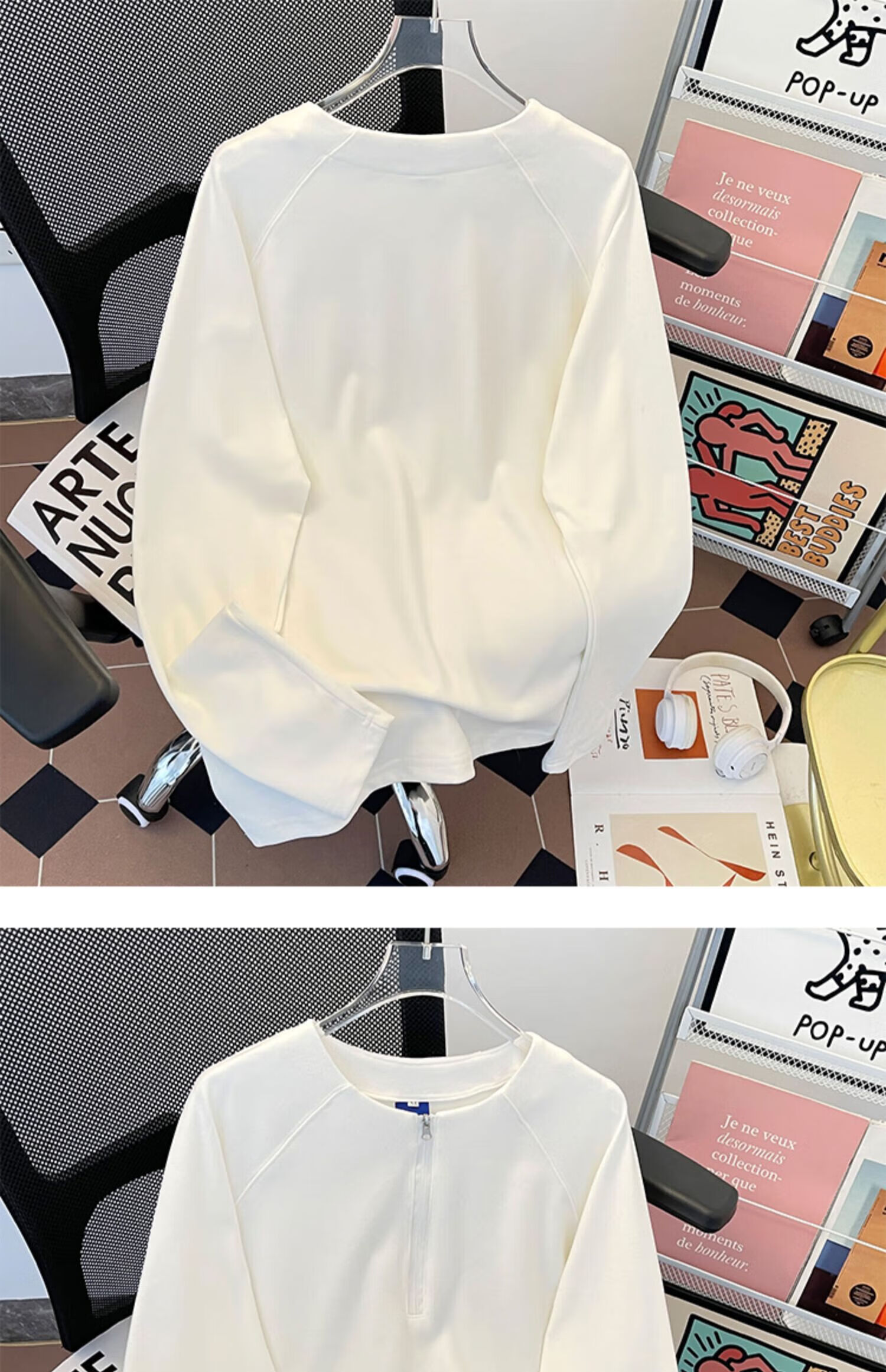 Jingyan Selects Spring and Autumn Henley Collar Sweatshirt Men's Loose Half-Zip Long Sleeve T-Shirt Trbottomyy American High White One Size M
