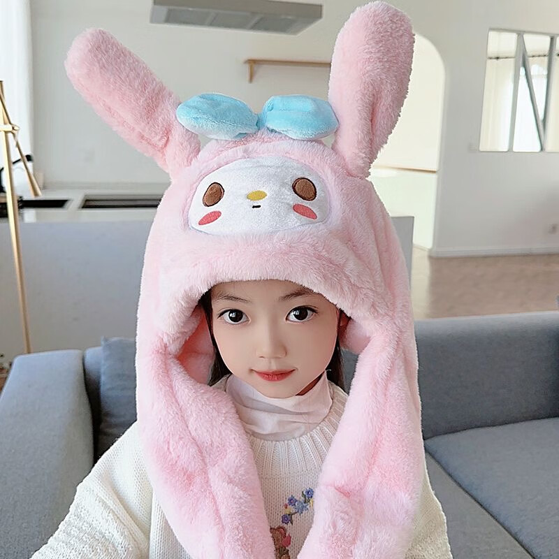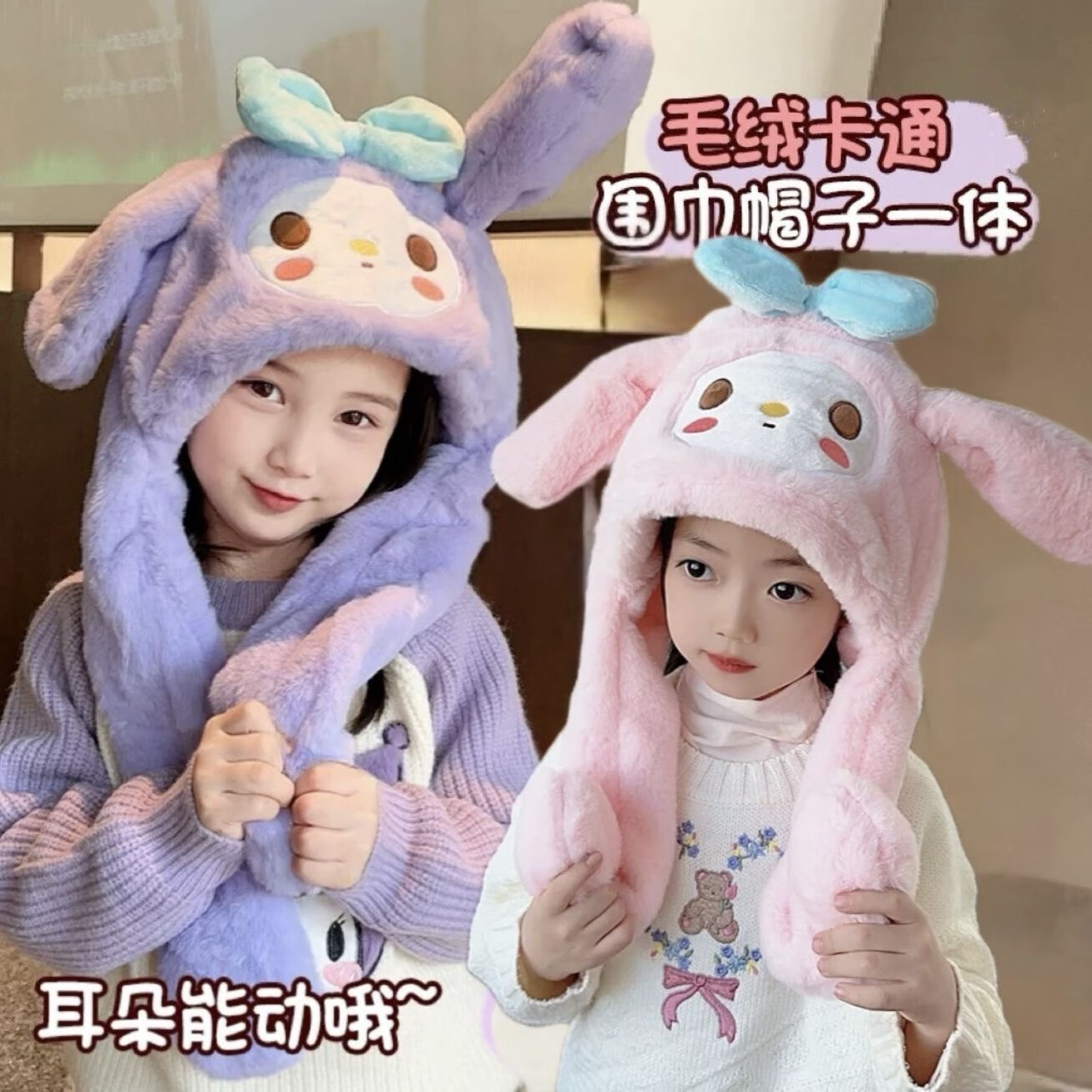 Orange Bole bunny ears moving children's hat and scarf integrated autumn and winter girls' scarf thickened plush cute baby ear protection hat purple pinch hat-1 pack