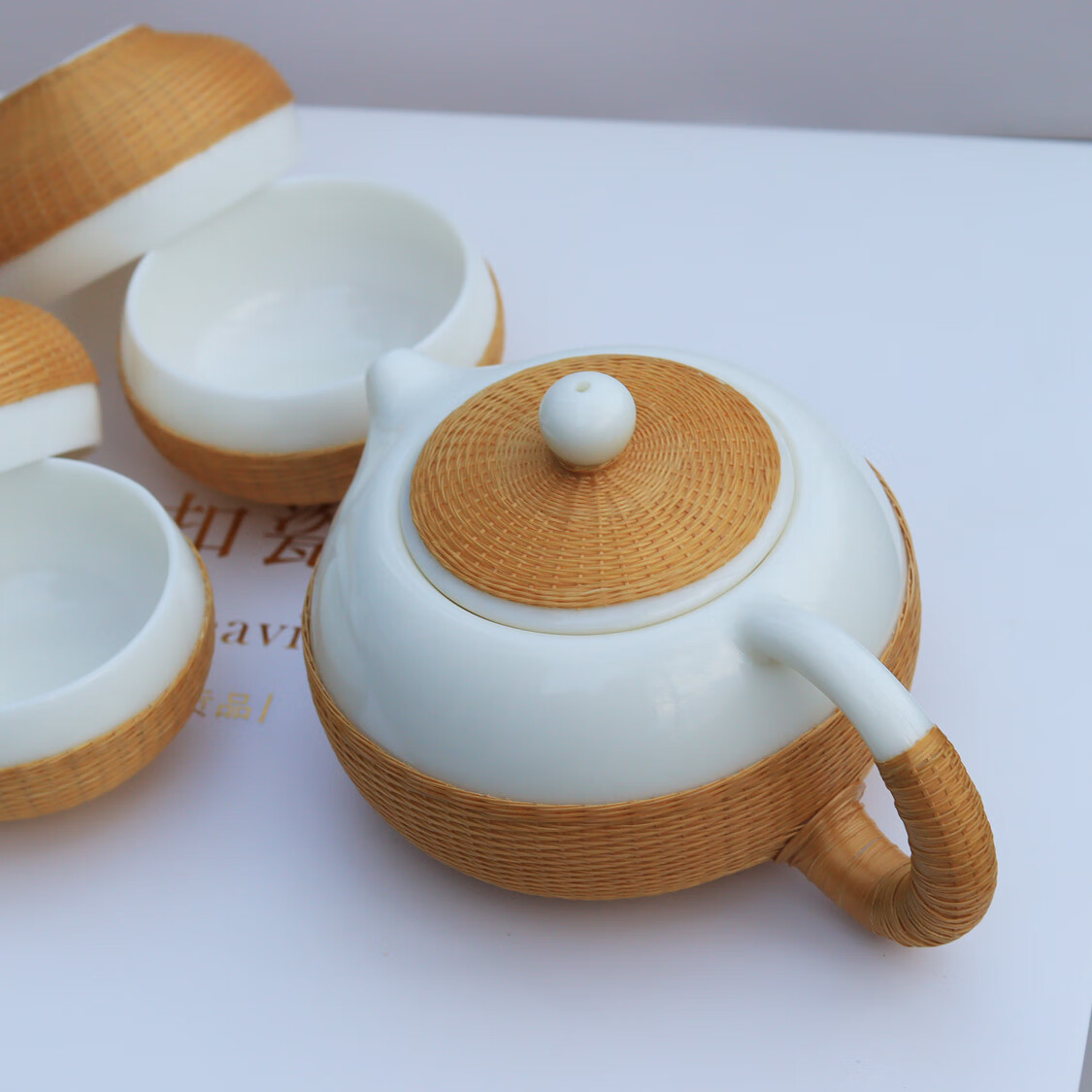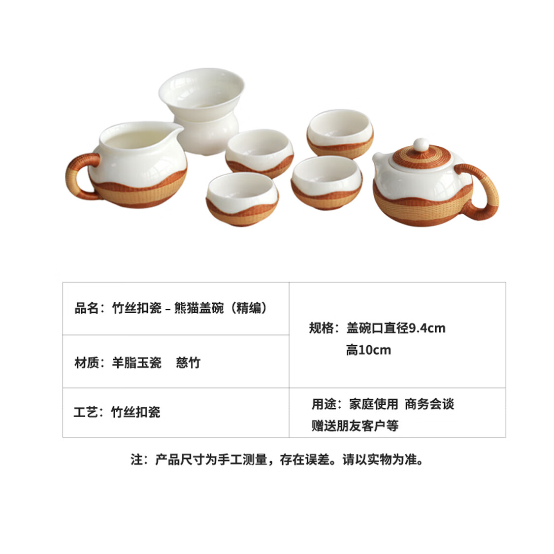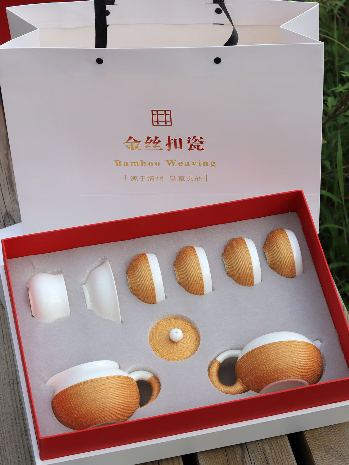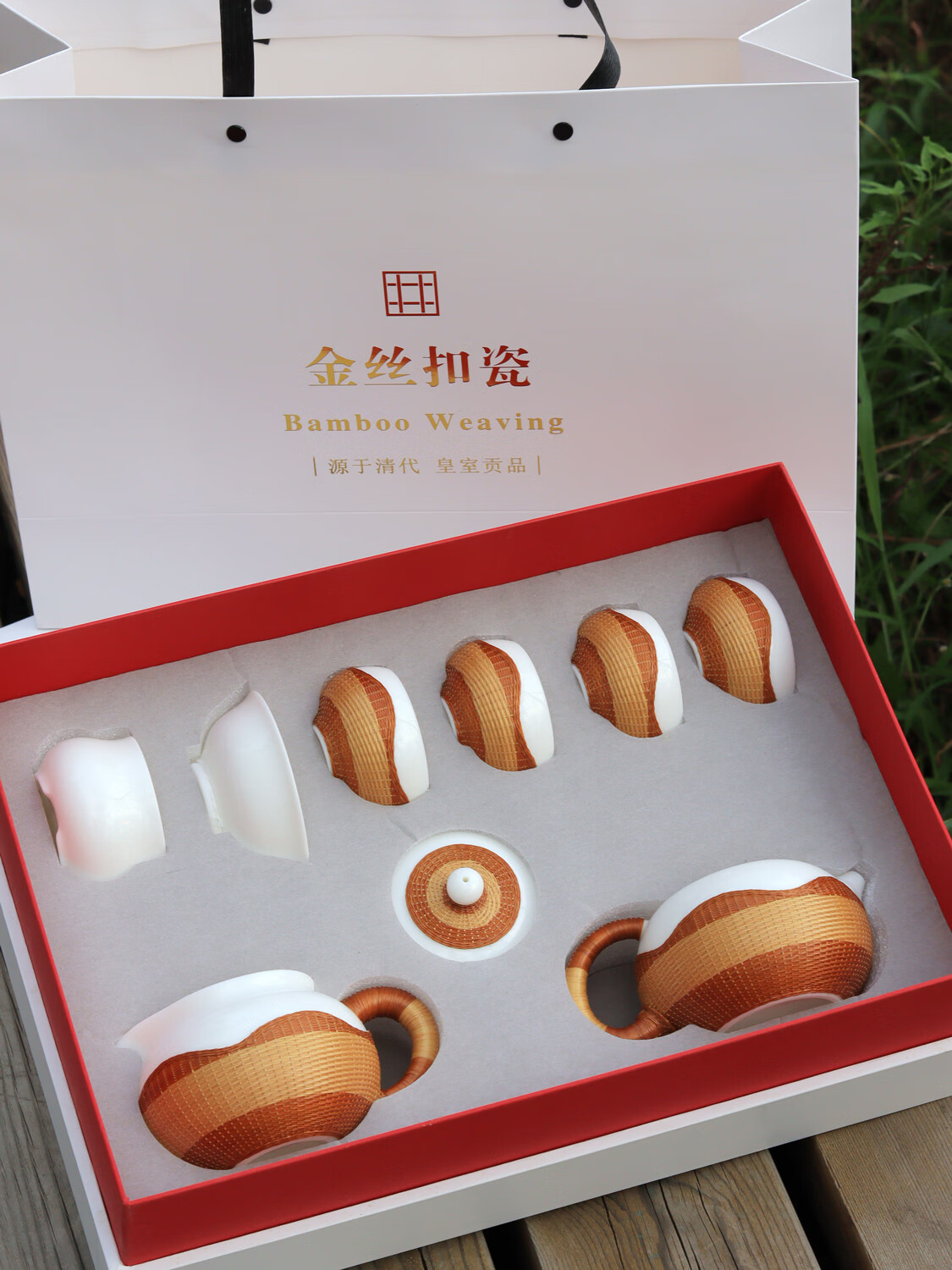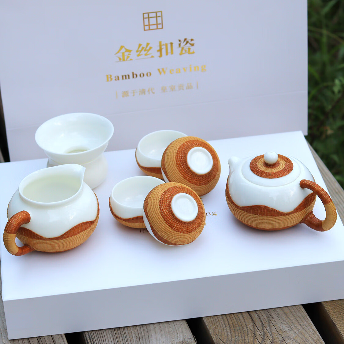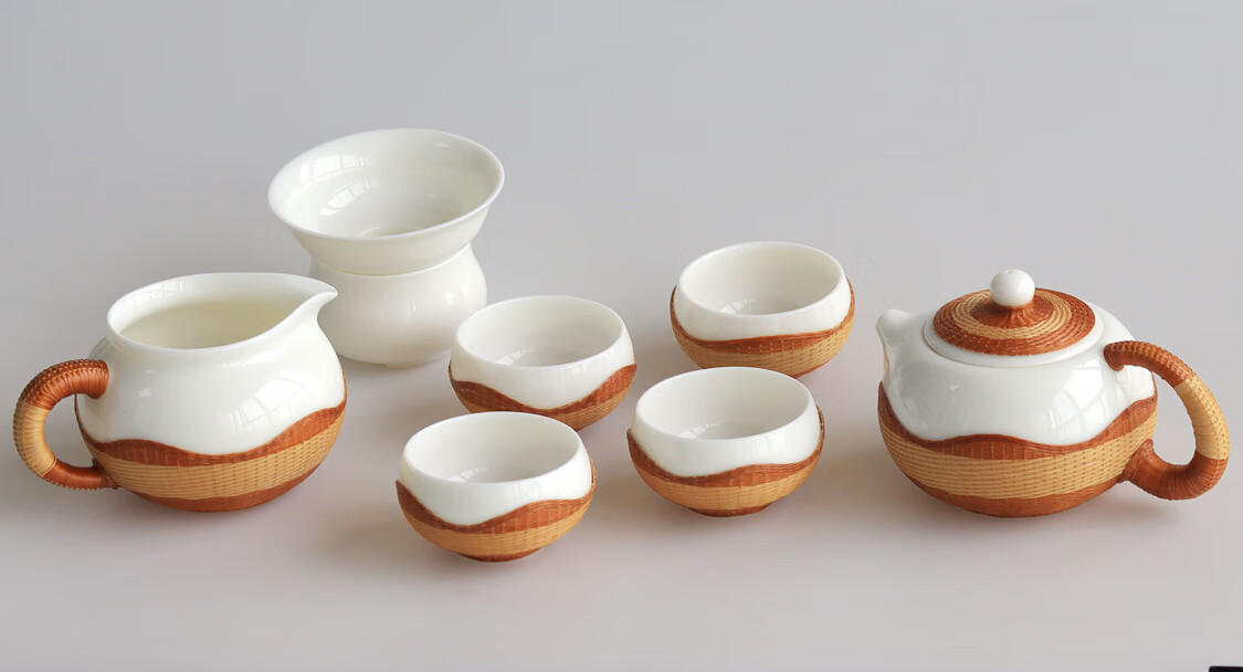 Sichuan Province intangible cultural heritage handmade porcelain bamboo tea set bamboo thread buckle porcelain Xishi pot silk bamboo cup conference gift for customers two-color mutton fat jade porcelain bamboo tea set eight-piece set