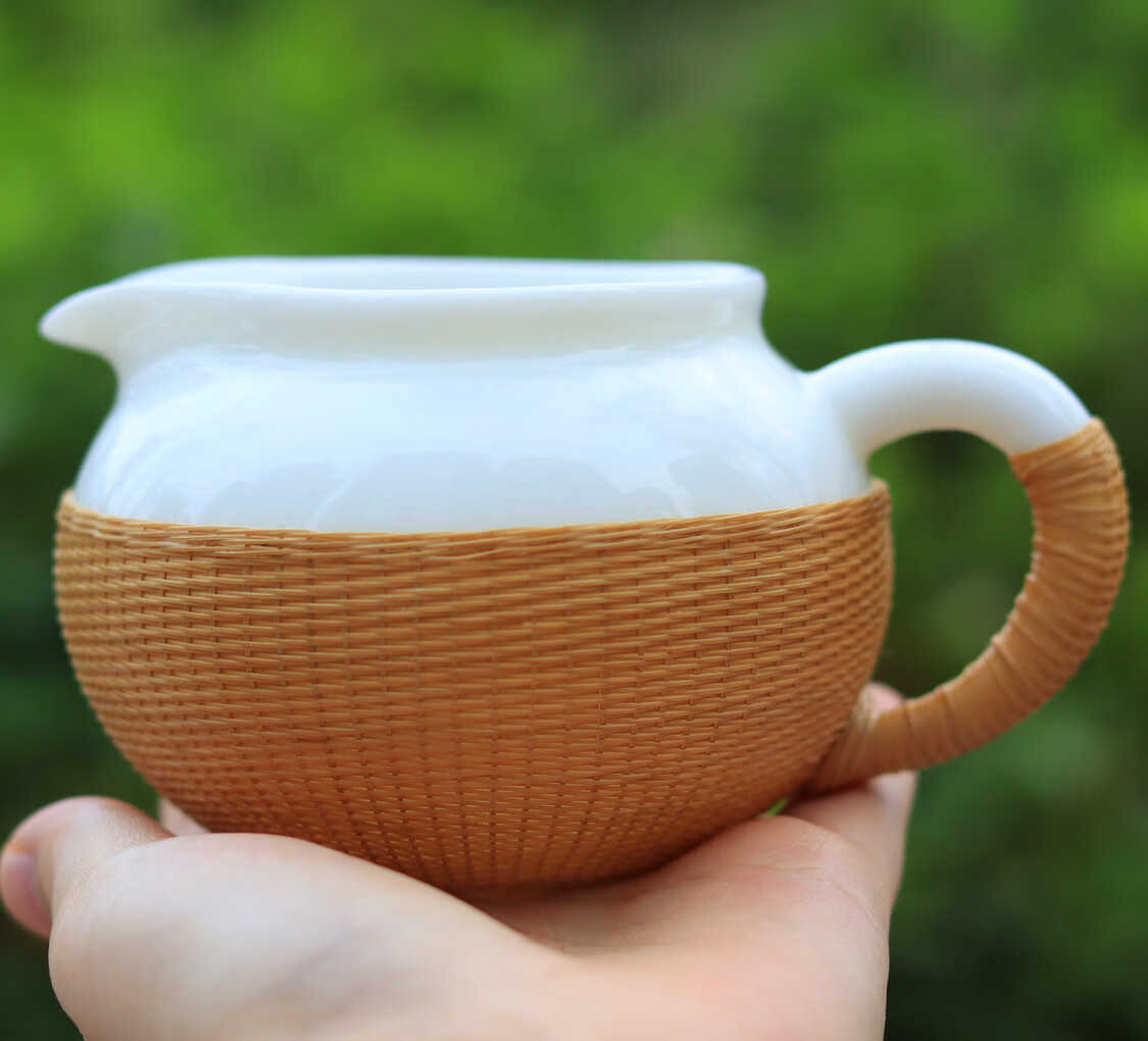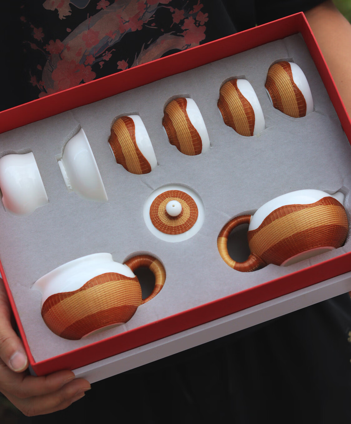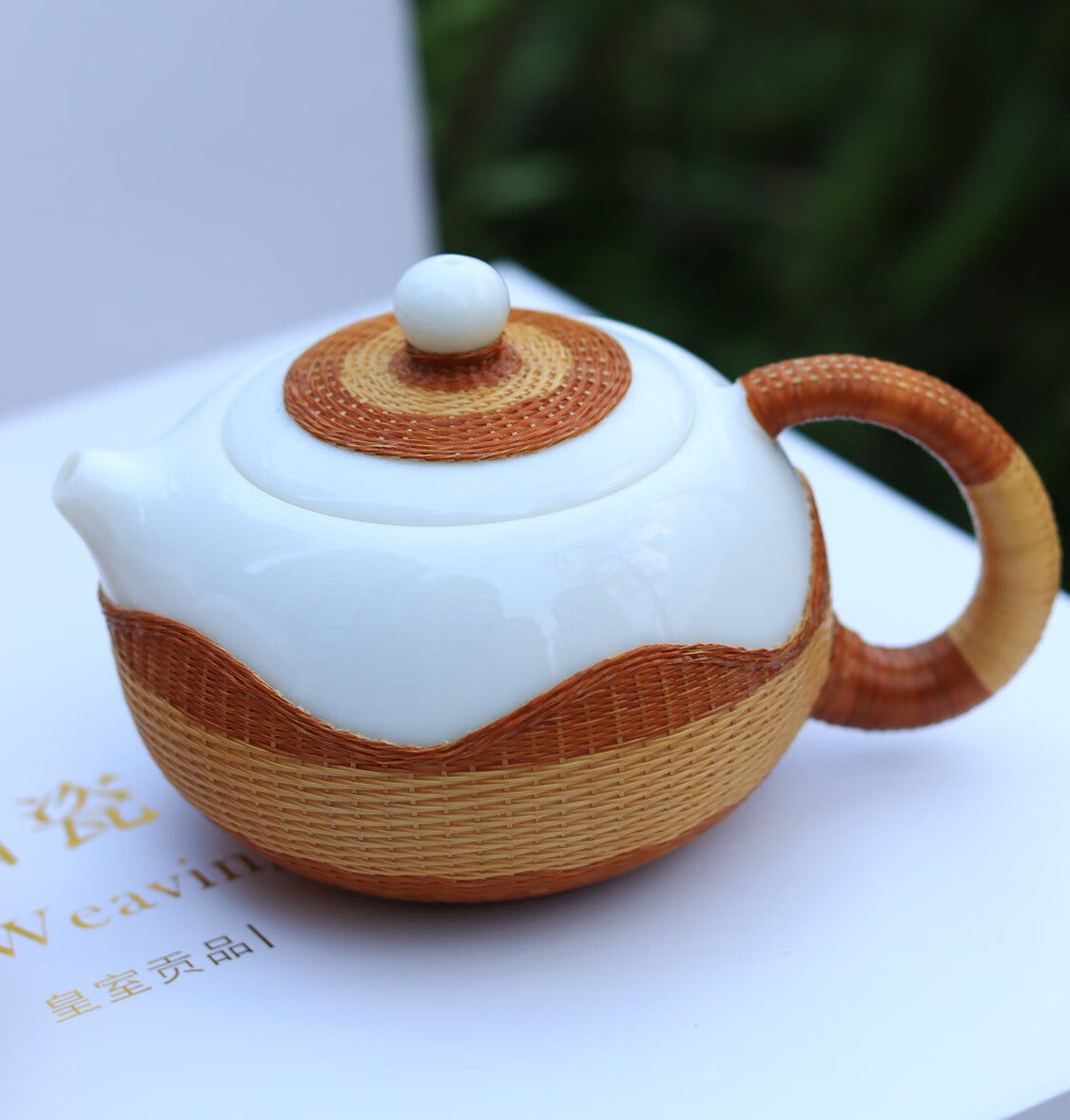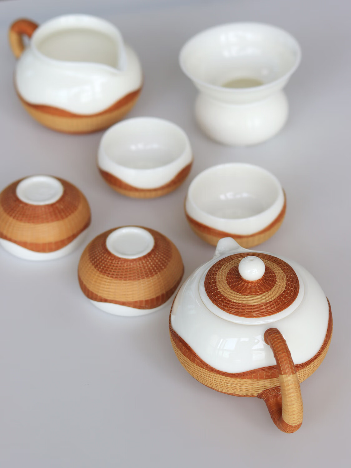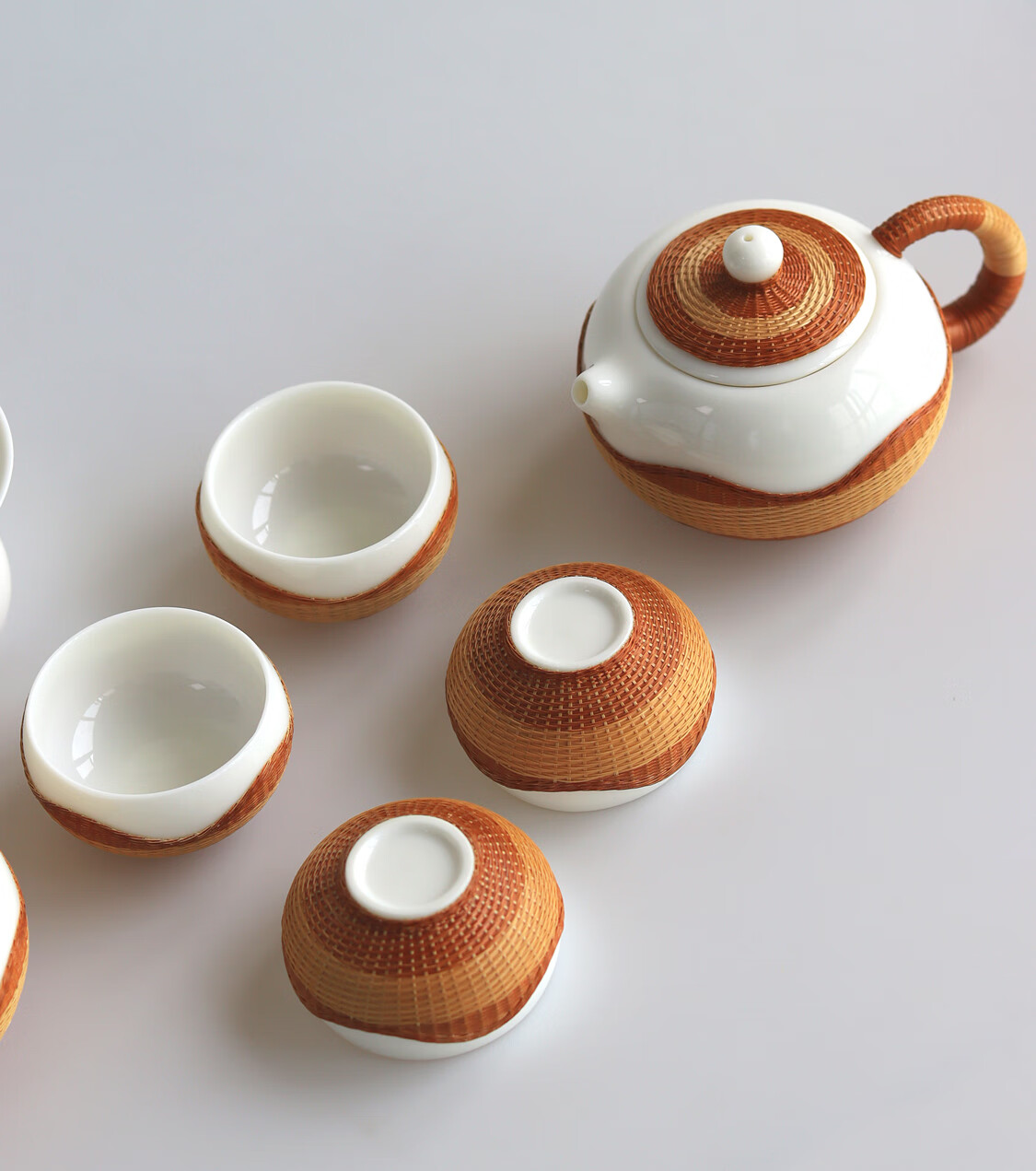 Sichuan Province intangible cultural heritage handmade porcelain bamboo tea set bamboo thread buckle porcelain Xishi pot silk bamboo cup conference gift for customers two-color mutton fat jade porcelain bamboo tea set eight-piece set