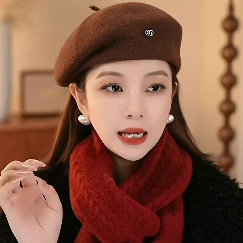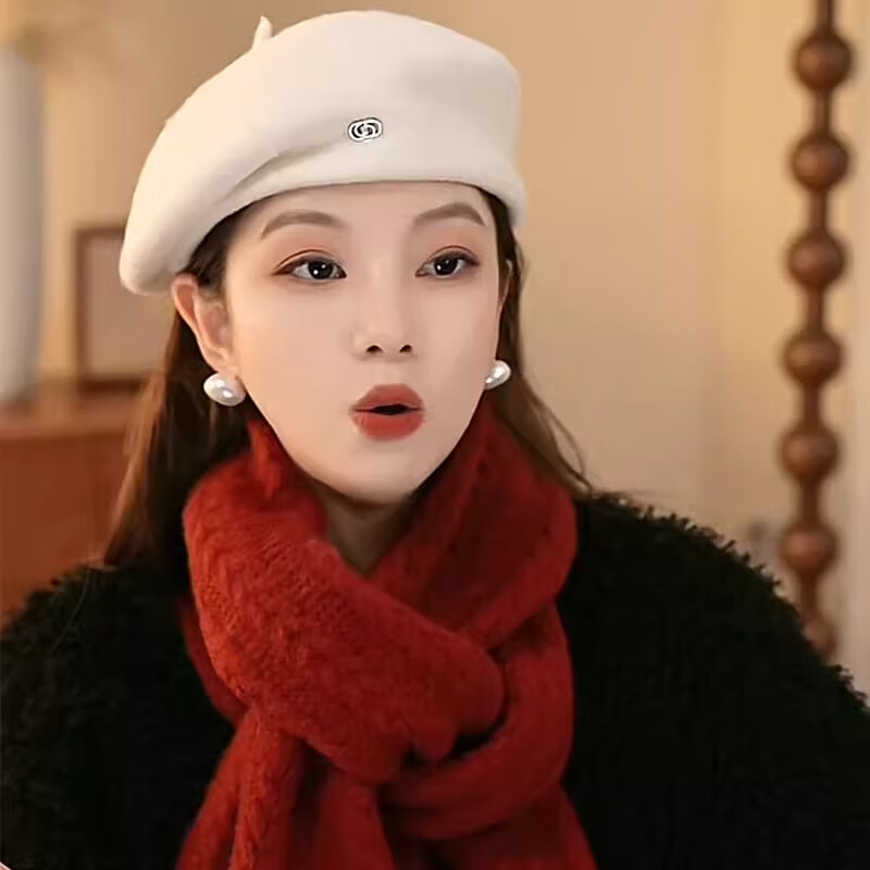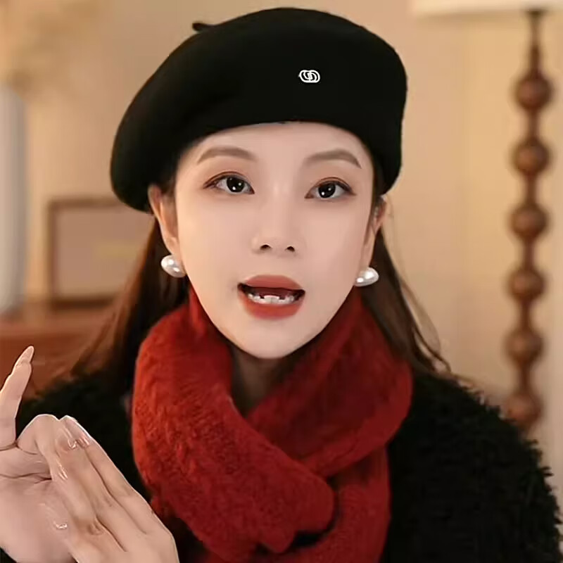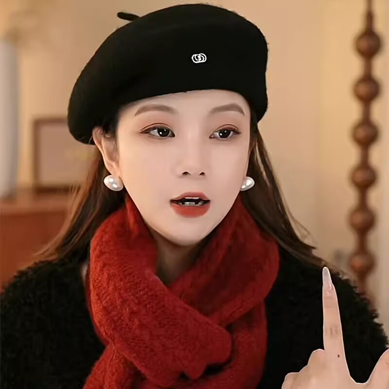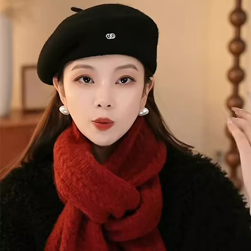 Xiaohongshu’s popular Korean style warm beret hat for women in spring and autumn, fashionable and stylish, showing face, little painter, black M (56-58cm), one size fits all