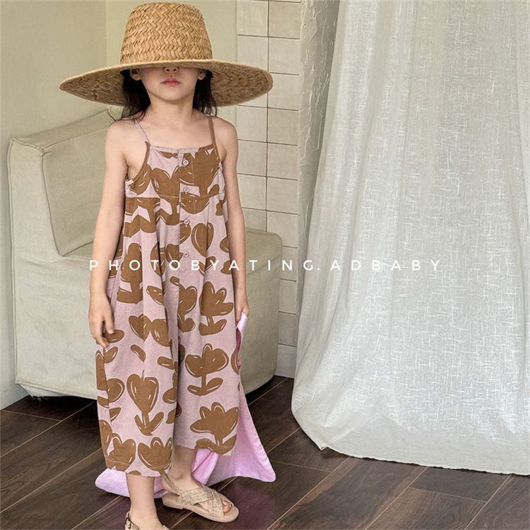 Lotto Children's Summer Suspender Jumpsuit Girls New Korean Style Fashion Flower Print Jumpsuit Casual Wide Leg Suspenders Blue 90cm
