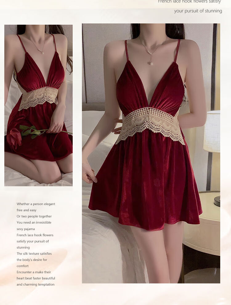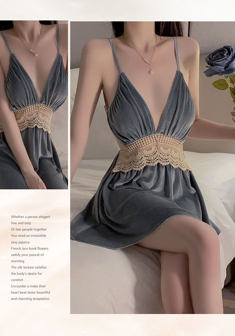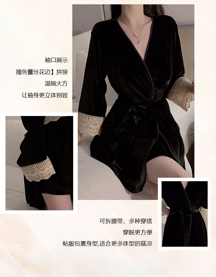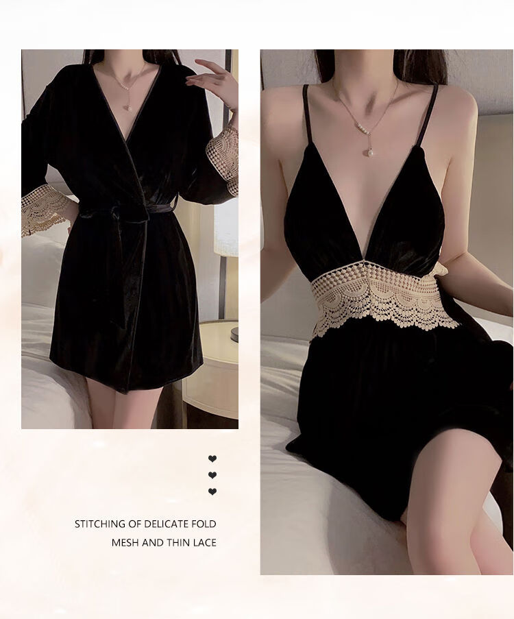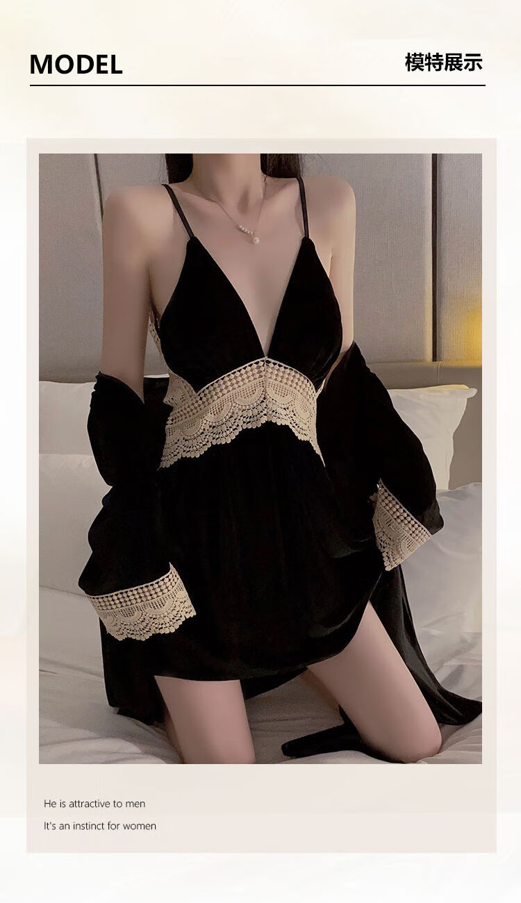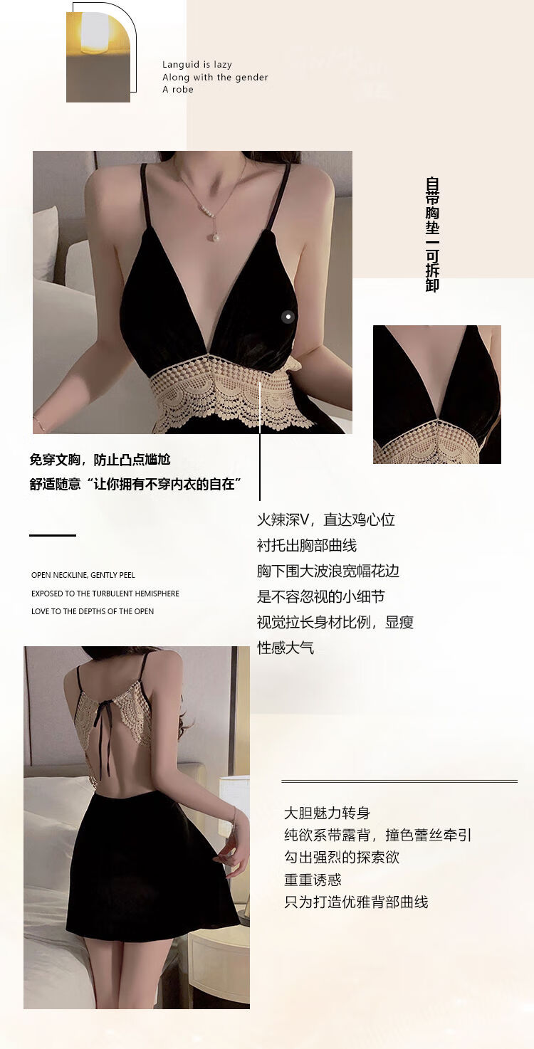 Sexy Pajamas for Women with Breast Pads Winter 2025 New Ice Silk Pure Desire Deep V Lace Backless Small Breast Suspender Nightgown A Black Velvet Model Confidential Shipping 160M80-105Jin Jin is equal to 0.5 kg